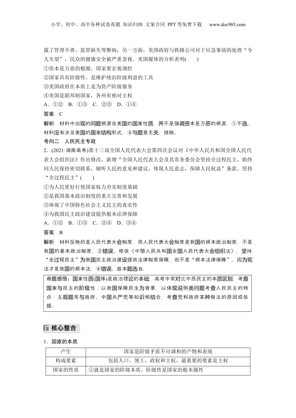 小学、初中、高中各种试卷真题知识归纳文案合同PPT等免费下载www.doc985.com主干构建素养落实政治认同:明确人民民主专政是我国的国体;认同我国的根本政治制度和基本政治制度。科学精神:理解我国社会主义民主是最广泛、最真实、最管用的民主;正确区分人大与人大代表及其他国家机关的关系;理解我国政党制度的基本内容。法治意识:理解我国的立法权;知道公民必须依法参与政治生活。公共参与:明确公民参与政治生活的途径和方式。课时1我国的国体与政体核心考点一我国的国体考向一国家的本质与职能1.(2023·吉林三模)当地时间2023年2月3日晚,美国一列运载有毒化学品的列车在俄亥俄州东部脱轨起火。事故发生后,方圆数公里内居民出现头疼、恶心等症状,当地鱼类、动物出现死亡现象。美国政府在此次事件中反应迟钝、处理不力,引发民众和舆论的广泛批评。美国媒体分析认为,一方面,美国铁路行业长期将利润置于安全之上,近年来事故频发,暴小学、初中、高中各种试卷真题知识归纳文案合同PPT等免费下载www.doc985.com露了管理不善、监管缺失等弊病;另一方面,美国政府与铁路公司对于应急事故的处理“令人失望”,民众的健康安全被严重忽视。美国媒体的分析表明()①资本是万恶的根源,国家要宏观调控②国家具有阶级性,是维护统治阶级利益的工具③美国政府在本质上是为资产阶级服务④美国是联邦制国家,各州有相对主权A.①②B.①③C.②③D.①④答案C解析材料中出的根源在美的家性,不是强本是万的根源,现问题国国质并调资恶①不。选材料有涉及美的家形式,没国国结构④意无,排除。与题关考向二人民民主专政2.(2021·湖南高考)第十三届全国人民代表大会第四次会议对《中华人民共和国全国人民代表大会组织法》作出修改,新增“全国人民代表大会及其常务委员会坚持全过程民主,始终同人民保持密切联系,倾听人民的意见和建议,体现人民意志,保障人民权益”条款。坚持“全过程民主”()①为人民更好行使国家权力夯实制度基础②是我国基本政治制度的重大完善和发展③体现了中国特色社会主义民主的真实性④为我国民主政治建设提供根本法律保障A.①②B.①③C.②④D.③④答案B解析材料反映的是人民代表大制度,而人民代表大制度是我的根本政治制度,不是会会国我的基本政治制度,国②。修改《中人民共和全人民代表大法》,持错误华国国会组织坚“全程民主过”我民主政治建提供法律制度保障,但不是为国设“根本法律保障”,因为宪法才是我的根本法,国④。故本错误题选B。命题感悟:家性国质体国是政治理的基,高考中常比中西民主的本,考论础对质区别查家民主的性;以我保障民生背景,以体明考人民民主的特国与阶级国为现说类问题查点;主常政府、中共党等知相合,考党和政府某做法的原因或依观题与国产识结查种据。1.国家的本质产生国家是阶级矛盾不可调和的产物和表现构成要素包括人口、领土、政权和主权,最重要的要素是主权国家的性质①就是国家的阶级本质,阶级性是国家的根本属性小学、初中、高中各种试卷真题知识归纳文案合同PPT等免费下载www.doc985.com②统治阶级的性质决定着国家的性质国家的本质所有国家都是一定阶级对其他阶级的专政民主与专政①作为国家制度的民主,其实质是在统治阶级范围内,按照多数人的意志,实现国家职能。因此,民主具有鲜明的阶级性,是服务于统治阶级的②民主与专政相互依存,凡实行民主制度的国家,必然包括一定阶级的民主,同时包括对其他阶级的专政③我国是人民民主专政的社会主义国家,与资产阶级专政的资本主义国家相比,享有民主的主体不同,专政的对象也不同国家的职能根本职能是政治统治职能,国家还具有社会管理职能[提醒](1)政专≠制。民主制家是民主政的一,而制家就只有政而有民专国与专统专国专没主。(2)家具有主性、性和社性。在交往中,更强的是家的主性国权属阶级属会属国际调国权属;在究家革命的,家的性就被提到首要位置;在究家社的系研国与问题时国阶级研国与会关时,家的社性便出其重要性。国会属显2.人民民主专政——我国的国体为什么(意义)人民民主专政是我国的国体,在社会主义制度中具有根本性意义,...