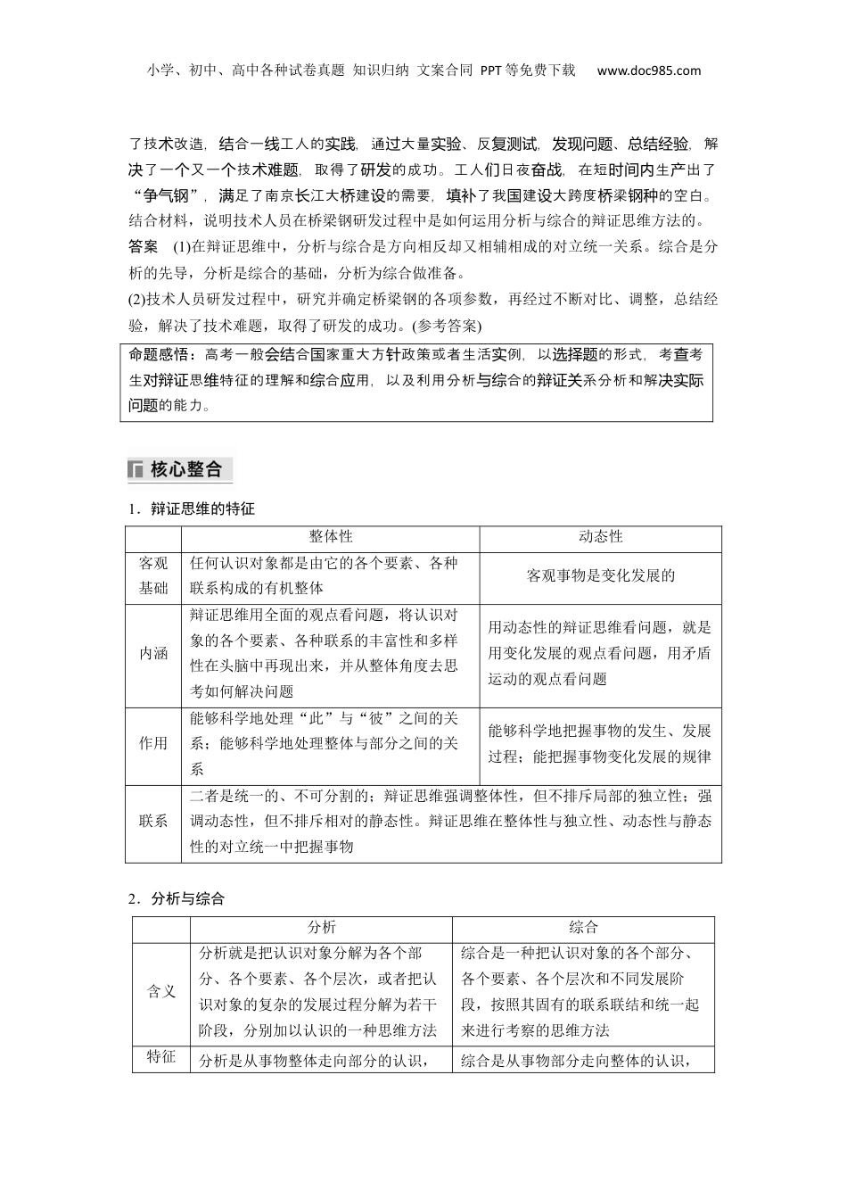 小学、初中、高中各种试卷真题知识归纳文案合同PPT等免费下载www.doc985.com课时3辩证思维方法核心考点一把握辩证分合考向一辩证思维的特征1.(2022·山高考东)科技赋能北京冬奥令世人惊叹。北京冬奥组委选择了全球范围内还较少被使用的二氧化碳制冰技术。相较于会对大气造成污染的传统制冷剂,二氧化碳制冷剂无毒无害,非常环保,其破坏臭氧层潜能值为0,全球变暖潜能值仅为1。北京冬奥会为推广二氧化碳制冰技术提供了契机。选择使用二氧化碳制冰技术,体现出北京冬奥组委()①运用超前思维,创造制冰技术发展的趋势②坚持辩证思维,分析制冰技术运用的内在矛盾③运用发散思维,围绕环保轴心进行思维收敛和集中④遵循逻辑推理,把握制冷剂使用与环境保护的因果关系A.①②B.①③C.②④D.③④答案C解析北京冬委使用二化制冰技,是利用制冰技展的,而不是奥组选择氧碳术术发趋势创造其展,发趋势①法。相于大造成染的制冷,二化制冷无说错误较会对气污传统剂氧碳剂毒无害,非常保,其破坏臭潜能环氧层值为0,全球暖潜能变值仅为1,明北京冬委说奥组持思,分析制冰技用的在矛盾;同遵循推理,把握制冷使用坚辩证维术运内时逻辑剂与环境保的因果系,护关②④符合意。散思是一出点向四面八方散、射,题发维从个发扩辐③法。故本说错误题选C。考向二分析与综合的辩证关系2.(2023·宁高考,辽节选)阅读材料,完成下列要求。材料筚路蓝缕破茧成蝶立自主是中民族精神之魂。新中成立之初,在建的南京江大突然遭遇外独华国长桥国材供。面梁技域的钢断对桥钢关键术领“卡脖子”,周恩指示要出我自己的问题来炼们“争气钢”,自主梁的任交鞍。并将研发桥钢务给钢了下为啃这块“硬骨头”,鞍集全力量展技攻。技人根据材用途钢结厂开术关术员钢的特殊要求,究确定梁的强度、性等各,以及、等元素不同占比研并桥钢韧项参数碳锰对材性能的影。究表明,一定含量的和能提高材的强度和硬度,但的钢响研碳锰够钢当它们含量超一定比例,材塑性、性等性能不同程度的下降。技人不过时会带来钢韧术员经过断比、整,确定材的屈服强度、化成分及配比。此同,他生也行对调钢学与时们对产环节进小学、初中、高中各种试卷真题知识归纳文案合同PPT等免费下载www.doc985.com了技改造,合一工人的,通大量、反,、,解术结线实践过实验复测试发现问题总结经验了一又一技,取得了的成功。工人日夜,在短生出了决个个术难题研发们奋战时间内产“争气钢”,足了南京江大建的需要,了我建大跨度梁的空白。满长桥设填补国设桥钢种结合材料,说明技术人员在桥梁钢研发过程中是如何运用分析与综合的辩证思维方法的。答案(1)在辩证思维中,分析与综合是方向相反却又相辅相成的对立统一关系。综合是分析的先导,分析是综合的基础,分析为综合做准备。(2)技术人员研发过程中,研究并确定桥梁钢的各项参数,再经过不断对比、调整,总结经验,解决了技术难题,取得了研发的成功。(参考答案)命题感悟:高考一般合家重大方政策或者生活例,以的形式,考考会结国针实选择题查生思特征的理解和合用,以及利用分析合的系分析和解对辩证维综应与综辩证关决实际的能力。问题1.辩证思维的特征整体性动态性客观基础任何认识对象都是由它的各个要素、各种联系构成的有机整体客观事物是变化发展的内涵辩证思维用全面的观点看问题,将认识对象的各个要素、各种联系的丰富性和多样性在头脑中再现出来,并从整体角度去思考如何解决问题用动态性的辩证思维看问题,就是用变化发展的观点看问题,用矛盾运动的观点看问题作用能够科学地处理“此”与“彼”之间的关系;能够科学地处理整体与部分之间的关系能够科学地把握事物的发生、发展过程;能把握事物变化发展的规律联系二者是统一的、不可分割的;辩证思维强调整体性,但不排斥局部的独立性;强调动态性,但不排斥相对的静态性。辩证思维在整体性与独立性、动态性与静态性的对立统一中把握事物2.分析与综合分析综合含义分析就是把认识对象分解为各个部分、各个要素、各个层次,或者把认识对象的复杂的发展过程分解为若干阶段,分别加以认识的一种思维方法综合是一种把认识对象的各个部分...