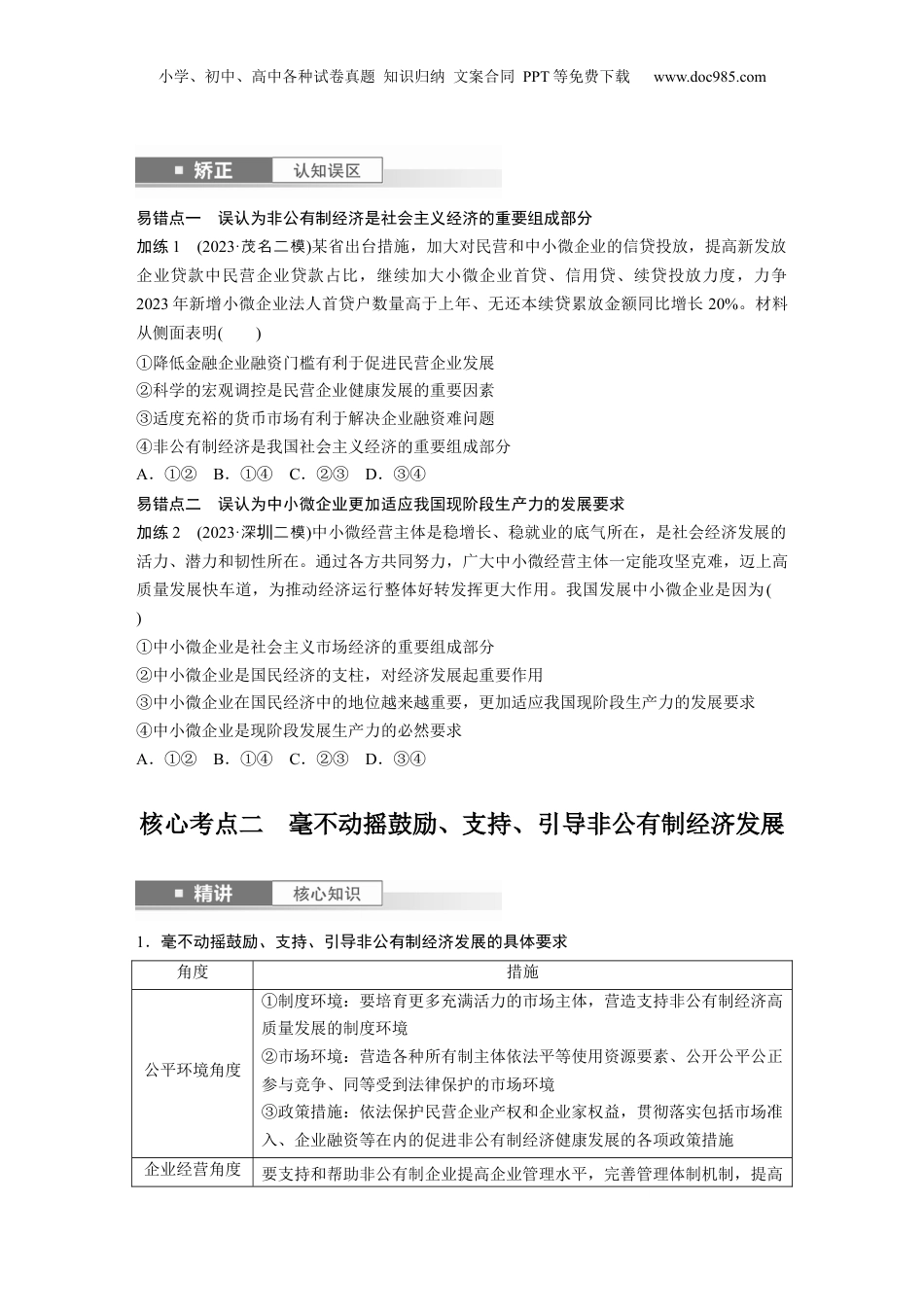 小学、初中、高中各种试卷真题知识归纳文案合同PPT等免费下载www.doc985.com课时2多种所有制经济共同发展核心考点一我国的多种所有制经济1.我国现阶段的非公有制经济性质非社会主义性质的经济内容个体经济、私营经济、港澳台投资经济、外商投资经济以及混合所有制经济中的非国有成分和非集体成分地位是社会主义市场经济的重要组成部分作用①成为稳定经济增长和改善民生的重要力量、创业就业的主要领域、技术创新的重要主体、国家税收的重要来源②为我国社会主义市场经济发展、政府职能转变、农村富余劳动力转移、国际市场开拓等发挥了重要作用归纳提升多角度理解支持非公有制经济发展的意义所有制有利于化公有制主体、多所有制共同展的生料所有制,适合优为种经济发产资社主初段生力展不平衡、不充分的,推生力展会义级阶产发状况动产发生产有利于化源配置,各生要素的性,提高源的利用效率和优资调动类产积极资经效益济分配有利于促就,提高者收入,有利于促展,增加家政收入进业劳动进经济发国财交换有利于增加市有效品的供,定物价场产给稳消费有利于展商品生,促商品流通,大社服,方便人民生活,提高人发产进扩会务民生活水平2.我国坚持多种所有制经济共同发展的原因根本原因我国社会主义初级阶段的生产力发展不平衡、不充分的状况地位公有制经济和非公有制经济都是社会主义市场经济的重要组成部分,是我国经济社会发展的重要基础必要性在社会主义初级阶段,公有制经济与非公有制经济不是相互排斥、相互抵消的,而是相辅相成、相得益彰、共同发展,统一于社会主义现代化建设进程之中重要性多种所有制经济共同发展,有利于发挥各种所有制的长处,调动不同经济主体小学、初中、高中各种试卷真题知识归纳文案合同PPT等免费下载www.doc985.com的积极性和创造性,有效利用各方面的资源,取长补短,激发社会主义市场经济的活力,推动经济高质量发展模块融合我国的基本经济制度1.我段的非公有制包括体、私和外商投。国现阶经济个经济营经济资经济纠正:________________________________________________________________________2.企民企交叉持股,能有民共同主作用。国与让国经济与营经济发挥导纠正:________________________________________________________________________3.非公有制的展,影公有制的展。经济发会响经济发纠正:________________________________________________________________________考向一非公有制经济的地位和作用典例1(2021·浙江1月考选)早在2018年11月,习近平总书记就指出,民营经济贡献了50%以上的税收、60%以上的国内生产总值、70%以上的技术创新成果、80%以上的城镇劳动就业和90%以上的企业数量。从上述“五六七八九”中可以看出,我国民营经济是()①社会主义市场经济体制的根基②推动经济增长、社会发展的重要力量③增强国力、支持科技进步的关键力量④改善民生、增加财政收入的重要力量A.①②B.①③C.②④D.③④考向二多种所有制经济共同发展典例2某市发改委新闻稿(节选)这样写道:“自改革开放以来,本市的个体经济、私营经济和外商投资经济从无到有,从小到大,得到长足发展,呈现出国有经济、民营经济与外商投资经济三足鼎立之势……”最后一句的文字可能是()①非公有制经济一跃成为社会主义经济的重要组成部分②各种所有制经济平等竞争、相互促进的新格局逐步形成③各种所有制经济在国民经济中的地位真正实现了平等④非公有制经济的发展对本市经济的推动作用日渐凸显A.①③B.①④C.②③D.②④小学、初中、高中各种试卷真题知识归纳文案合同PPT等免费下载www.doc985.com易错点一误认为非公有制经济是社会主义经济的重要组成部分加练1(2023·茂名二模)某省出台措施,加大对民营和中小微企业的信贷投放,提高新发放企业贷款中民营企业贷款占比,继续加大小微企业首贷、信用贷、续贷投放力度,力争2023年新增小微企业法人首贷户数量高于上年、无还本续贷累放金额同比增长20%。材料从侧面表明()①降低金融企业融资门槛有利于促进民营企业发展②科学的宏观调控是民营企业健康发展的重要因素③适度充裕的货币市场有利于解决企业融资...