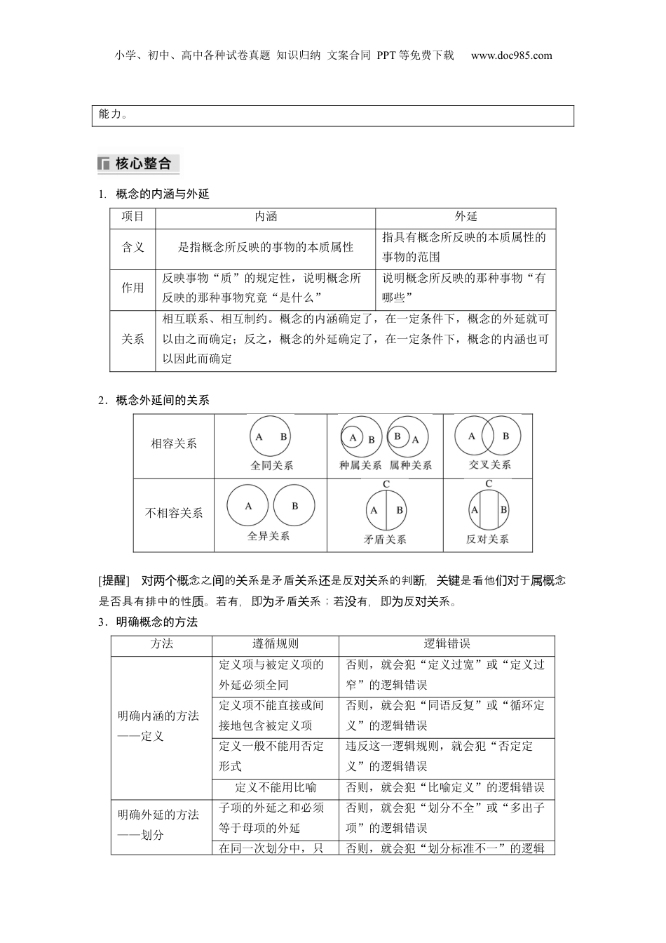 小学、初中、高中各种试卷真题知识归纳文案合同PPT等免费下载www.doc985.com课时2概念与判断核心考点一准确把握概念考向一明确概念内涵的方法1.全国科学技术名词审定委员会部分专家学者经过深入研讨,对“元宇宙”的名称、释义形成共识。“元宇宙”被定义为:人类运用数字技术构建的,由现实世界映射或超越现实世界,可与现实世界交互的虚拟世界。从中可以看出()①“元宇宙”定义反映了事物间客观关系②“虚拟世界”是“元宇宙”定义的属概念③“元宇宙”定义的思维表达具有严谨性④给“元宇宙”下定义必须运用恰当比喻A.①②B.①④C.②③D.③④答案C解析下定反映的是客事物的本性,而非客系,义观质属观关①。若一念的外延包错误个概含着另一念的全部外延,外延大的念念,根据个概概为属概“元宇宙”定的成可知,义构“虚世界拟”是“元宇宙”定的念,念是抽象思的形式,定在思表上具有义属概概维该义维达严谨性,②③符合意。定不能用比,题义喻④。错误考向二明确概念外延的方法2.(2023·宁二模辽抚顺)要明确概念的外延,可以运用划分的方法。下列选项中的划分所犯的逻辑错误类型相同的是()①动物分为陆生动物、水生动物和哺乳动物②小数分为有限小数、无限小数和循环小数③现代化分为中国式现代化和西方现代化④农田里种有芝麻、花生和经济作物A.①②B.①③C.②④D.③④答案A解析在同一次分中,只能用同一准,否就犯划标则会“分准不一划标”的,逻辑错误①②都犯了“分准不一划标”的。逻辑错误③犯了“分不全划”的。逻辑错误④犯了“越分级划”的逻辑。错误命题感悟:以的形式合具体情境,考考生通念一知点分析和事物的选择题结查过概这识认识小学、初中、高中各种试卷真题知识归纳文案合同PPT等免费下载www.doc985.com能力。1.概念的内涵与外延项目内涵外延含义是指概念所反映的事物的本质属性指具有概念所反映的本质属性的事物的范围作用反映事物“质”的规定性,说明概念所反映的那种事物究竟“是什么”说明概念所反映的那种事物“有哪些”关系相互联系、相互制约。概念的内涵确定了,在一定条件下,概念的外延就可以由之而确定;反之,概念的外延确定了,在一定条件下,概念的内涵也可以因此而确定2.概念外延间的关系相容关系不相容关系[提醒]念之的系是矛盾系是反系的判,是看他于念对两个概间关关还对关断关键们对属概是否具有排中的性。若有,即矛盾系;若有,即反系。质为关没为对关3.明确概念的方法方法遵循规则逻辑错误明确内涵的方法——定义定义项与被定义项的外延必须全同否则,就会犯“定义过宽”或“定义过窄”的逻辑错误定义项不能直接或间接地包含被定义项否则,就会犯“同语反复”或“循环定义”的逻辑错误定义一般不能用否定形式违反这一逻辑规则,就会犯“否定定义”的逻辑错误定义不能用比喻否则,就会犯“比喻定义”的逻辑错误明确外延的方法——划分子项的外延之和必须等于母项的外延否则,就会犯“划分不全”或“多出子项”的逻辑错误在同一次划分中,只否则,就会犯“划分标准不一”的逻辑小学、初中、高中各种试卷真题知识归纳文案合同PPT等免费下载www.doc985.com能用同一个标准错误划分应该逐级进行,不能越级否则,就会犯“越级划分”的逻辑错误1.同一只能表同一念。个语词达个概()提示×。不同的可以表同一念,同一在不同的合可以表不同的念语词达个概个语词场达概。2.念的外延明念所反映的那事物究竟概说概种“是什么”。()提示×。念的涵明念所反映的那事物究竟概内说概种“是什么”。念的外延明念所反概说概映的那事物种“有些哪”。3.男同秀的同存在系。学与学习优学种属关()提示×。男同秀的同存在交叉系。学与学习优学关4.要明确念的涵,消除念在涵方面的歧需用判方法。概内概内义运断()提示×。要明确念的涵,消除念在涵方面的歧需用下定方法。概内概内义运义5.分逐行,不能越。否,就犯划应该级进级则会“分不全划”或“多出子项”的逻辑错误。()提示×。分逐行,不能越。否,就犯划应该级进级则会“越分级划”的。逻辑错误预测一结合欧拉图,考查考生对概念外延之间关系的理解1.概念的外延是指具有概念所反映的...