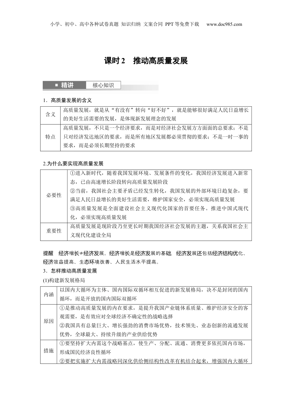 小学、初中、高中各种试卷真题知识归纳文案合同PPT等免费下载www.doc985.com课时2推动高质量发展1.高质量发展的含义含义高质量发展,就是从“有没有”转向“好不好”,就是能够很好满足人民日益增长的美好生活需要的发展,是体现新发展理念的发展特点高质量发展,不只是一个经济要求,而是对经济社会发展方方面面的总要求;不是只对经济发达地区的要求,而是所有地区发展都必须贯彻的要求;不是一时一事的要求,而是必须长期坚持的要求2.为什么要实现高质量发展必要性①进入新时代,随着我国发展环境、发展条件的变化,我国经济发展进入新常态,已由高速增长阶段转向高质量发展阶段②当前,我国社会主要矛盾已经发生转化,我国发展的外部环境日趋复杂,要满足人民日益增长的美好生活需要,维护国家安全,必须实现高质量发展③高质量发展是全面建设社会主义现代化国家的首要任务。推进中国式现代化,必须实现高质量发展重要性高质量发展是现阶段乃至更长时期我国经济社会发展的主题,关系我国社会主义现代化建设全局提醒增经济长≠展。增是展的基,展包括化、经济发经济长经济发础经济发还经济结构优效益提高、生境改善、人民生活水平提高。经济态环3.怎样推动高质量发展(1)构建新发展格局内涵以国内大循环为主体、国内国际双循环相互促进的新发展格局,决不是封闭的国内循环,而是开放的国内国际双循环原因①是推动高质量发展的内在要求,是提升我国产业链体系质量、维护经济安全的客观需要,是有效应对全球经济不确定性的战略选择②我国具有总量巨大、增长强劲的消费市场优势,技术领先、业态创新的流通发展优势,全球最大、持续升级的产业供给优势措施①要坚持扩大内需这个战略基点,使生产、分配、流通、消费更多依托国内市场,形成国民经济良性循环②要把实施扩大内需战略同深化供给侧结构性改革有机结合起来,增强国内大循环小学、初中、高中各种试卷真题知识归纳文案合同PPT等免费下载www.doc985.com内生动力和可靠性,提升国际循环质量和水平,加快建设现代化经济体系模块融合建以大循主体、循相互促的新展格局,体了主次构国内环为国内国际双环进发现矛盾的系以及要持点重点的一。辩证关坚两论与论统(2)加快建设现代化经济体系原因国家强,经济体系必须强。建设现代化经济体系是跨越关口的迫切要求和我国发展的战略目标,是推动高质量发展、全面提高经济整体竞争力的必然要求内容是由社会经济活动各个环节、各个层面、各个领域的相互关系和内在联系构成的一个有机整体。具体包括6个体系和1个体制措施建设现代化产业体系坚持把发展经济的着力点放在实体经济上,推进新型工业化,加快建设制造强国、质量强国、航天强国、交通强国、网络强国、数字中国全面推进乡村振兴坚持农业农村优先发展,巩固拓展脱贫攻坚成果,加快建设农业强国,扎实推动乡村产业、人才、文化、生态、组织振兴,全方位夯实粮食安全根基促进区域协调发展深入实施区域协调发展战略、区域重大战略、主体功能区战略、新型城镇化战略,优化重大生产力布局,构建优势互补、高质量发展的区域经济布局和国土空间体系推进高水平对外开放稳步扩大规则、规制、管理、标准等制度型开放,加快建设贸易强国,推动共建“一带一路”高质量发展,维护多元稳定的国际经济格局和经贸关系归纳提升推动高质量发展的其他措施①展思想:持以人民中心的展思想,不足人民日益增的美好生活需要,不发坚为发断满长断增强人民群得感、幸福感、安全感。众获②展理念:新、、色、放、共享的新展理念。发贯彻创协调绿开发③制度保障:建高水平社主市体制。持和完善社主基本制度,毫不构会义场经济坚会义经济固和展公有制,毫不鼓、支持、引非公有制展,充分市动摇巩发经济动摇励导经济发发挥场在源配置中的定性作用,更好政府作用。资决发挥④支撑:以育、科技、人才基性、略性支撑。教为础战模块融合要放展理念、推高水平外放《代政治》中的将开发进对开与当国际与经济“放开是代中的明当国鲜标识”的知合起行理解掌握。识结来进1.高量展是展的要求。实现质发仅对经济发纠正:____________________________________________________...