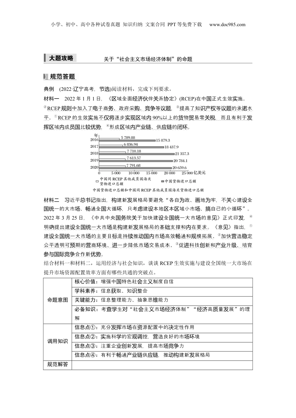 小学、初中、高中各种试卷真题知识归纳文案合同PPT等免费下载www.doc985.com关于“社会主义市场经济体制”的命题典例(2022·宁高考,辽节选)阅读材料,完成下列要求。材料一2022年1月1日,《域全面伴系定》区经济伙关协(RCEP)在中正式生效施。国实②RCEP中加入了子商、政府采、等规则电务购竞争议题,③提高了知等的承水识产权议题诺平。①RCEP的生效施不逐步域实仅将实现区内90%以上的物易零,而且有利于货贸关税发域成比挥区内员国较优势,④形成域、供的区内产业链应链闭环。材料二近平指出,建新展格局要避免习总书记构发“各自政、地牢,不心建全为画为关设一的大市、通全大循,只考建本地本域小市、自己的小循国统场畅国环虑设区区场搞环”。2022年3月25日,《中共中央院于加快建全一大市的意》正式印,国务关设国统场见发④明确提出建全一大市是建新展格局的基支撑和在要求设国统场构发础内。《意》指出,见①建全一大市的主要目是持推市高效通和模拓展设国统场标续动国内场畅规、②加快造定营稳公平透明可期的商境、一步降低市交易成本预营环进场、③促科技新和升、培育进创产业级合作新参与国际竞争优势。结合材料一和材料二,运用经济与社会知识,谈谈RCEP生效实施与建设全国统一大市场在提升市场资源配置效率方面有哪些共通的突破点。命题意图核心价值:增强中特色社主制度自信国会义学科素养:信息取、知整合获识关键能力:信息整理能力、抽象思能力维必备知识:考生查学对“社主市体制会义场经济”“高量展经济质发”的理解调用知识信息点①:充分市在源配置中的定性作用发挥场资决信息点②:施科的宏控,造良好的市境实学观调营场环信息点③:注重企新展,提高市力业创发场竞争信息点④:有利于通供,推建新展格局畅产业链应链动构发规范解答小学、初中、高中各种试卷真题知识归纳文案合同PPT等免费下载www.doc985.com失分原因:信息整理和抽象思能力不强,致漏二者的共通点。维导遗防范措施:材料,找材料的共通之。认真阅读寻处(1)充分发挥市场在资源配置中的决定性作用。统一开放、竞争有序的市场体系,是充分发挥市场在资源配置中的决定性作用的基础。(2)建设高标准市场体系要强化市场基础制度规则统一,要完善主要由市场决定价格的机制。(3)市场调节不是万能的,市场调节存在着自发性、盲目性、滞后性等弊病。(4)在我国,把社会主义制度和市场经济有机结合起来,既能发挥市场经济的长处,又能发挥我国社会主义制度的显著优势。(5)科学的宏观调控是政府的主要经济职能之一,财政政策和货币政策是宏观调控最常用的经济手段。(6)要构建高水平社会主义市场经济体制,充分发挥市场在资源配置中的决定性作用,更好发挥政府作用,推动有效市场和有为政府更好结合,为经济高质量发展提供体制保障。淄博烧烤“出圈”“淄博模式”是2023年最火的旅游,也是下夜最具代表性的形式之一,话题当间经济其背后成功的原因得我行。值们进总结在淄博烧烤“出圈”之后,淄博市政府采取措施市化,如引商积极应对场变积极导铺经者做好和管理,提升行的品和次;制定一系列章制度,加大管力度,营规划烧烤业质档规监整治市价格象,保障消者的益,行更好地服于人民群;加强准化建场乱费权让烧烤业务众标的政投入,位、店和周停等行大模的改造和升,增强可持设财对烧烤摊铺边车场进规级续发展的能力,助其市化和力等。帮应对场变竞争压在淄博市政府和地企的共同努力之下,形成了以淄博核心,射交通、住宿当业烧烤为辐、商、文等其他行的旅游消新集群。在消集群的巨大吸引下,各相源通场创业费该费类关资过便捷的物流源源不地入淄博本地市,保障了在大量消者短涌入情下的市断进场费时间况场稳定。据,五一假期淄博市接待游客量和旅游相收下史。统计数关营创历纪录结合材料,运用社会主义市场经济体制的相关知识,分析“淄博模式”为何会成功。________________________________________________________________________________________________________________________________________________________________________________________________________________________________________________________________________________________________