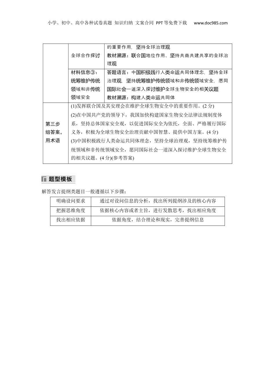 小学、初中、高中各种试卷真题知识归纳文案合同PPT等免费下载www.doc985.com当代国际政治与经济短文类主观题考题印证:2023·山高考,东20结合材料,运用中国特色社会主义,当代国际政治与经济知识,以“在历史前进的逻辑中前进”为主题撰写一篇短评。2023·全新,国课标39假如你将代表中国出席联合国安理会召开的生物安全会议,请拟一份发言提纲,简要阐明中国的立场。2023·浙江1月考,选32以美国为首的一些西方国家宣称,中国打着共建“一带一路”的旗号,凭借经济实力上的优势支配他国,掠夺他国财富,搞经济霸权。结合材料,运用当代国际政治与经济相关知识,写一篇短文对这一观点加以驳斥。(2023·全新卷国课标)阅读材料,完成下列要求。2020年2月,①党中央强要快推出台生物安全法,加快建家生物安全法律法调尽动构国规体系、制度保障体系。自2021年4月15日起,《中人民共和生物安全法》正式施行华国。②前,在合、世界生框架下,社全球性重大新突染病当联国卫组织国际会围绕应对发发传、防范生物武器和生物恐怖主威、范促生物科技究用、保生物多性义现实胁规并进研应护样等的更深入关键议题讨论趋。近平在博洲习鳌亚论坛2022年年上强:会调“③持域和非域安全坚统筹维护传统领传统领,共同地端和恐怖主、候化、安全、生物安全等全球性应对区争义气变网络问题。”假如你将代表中国出席联合国安理会召开的生物安全会议,请拟一份发言提纲,简要阐明中国的立场。(10分)解题流程第一步审设问,定方向第二步析材料,调知识材料信息①:党制定生领导物安全法答题语言:在中共党的下,我加快建家生国产领导国构国物安全法律法制度体系,持体家安全,以促规坚总国观进安全依托,全面、格履行,全球国际为严国际义务积极为生物安全治理中智慧、提供中方案贡献国国教材溯源:中智慧和中方案,体家安全国国总国观材料信息②:答题语言:合及其安理在全球生物安全中发挥联国会维护小学、初中、高中各种试卷真题知识归纳文案合同PPT等免费下载www.doc985.com全球合作探讨的重要作用,持全球治理坚观教材溯源:合地位作用、持共商共建共享的全球治联国坚理观材料信息③:统筹维护传统域和非领传统域安全领答题语言:中行人命共同体理念,持全球国积极践类运坚治理,持域和非域安全,愿同观坚统筹维护传统领传统领社一道深入探全球生物安全的相国际会讨维护关议题教材溯源:建人命共同体构类运第三步组答案,用术语(1)发挥联合国及其安理会在维护全球生物安全中的重要作用。(2分)(2)在中国共产党的领导下,我国加快构建国家生物安全法律法规制度体系,坚持总体国家安全观,以促进国际安全为依托,全面、严格履行国际义务,积极为全球生物安全治理贡献中国智慧、提供中国方案。(4分)(3)中国积极践行人类命运共同体理念,坚持全球治理观,坚持统筹维护传统领域和非传统领域安全,愿同国际社会一道深入探讨维护全球生物安全的相关议题。(4分)(参考答案)解答发言提纲类题目一般遵循以下步骤:明确设问要求通过对设问信息的分析,找出所列提纲涉及的核心内容把握思维角度依据核心内容或者主旨,进行发散思考,找出相应角度找出相应依据依据角度,结合理论和现实,完善提纲信息