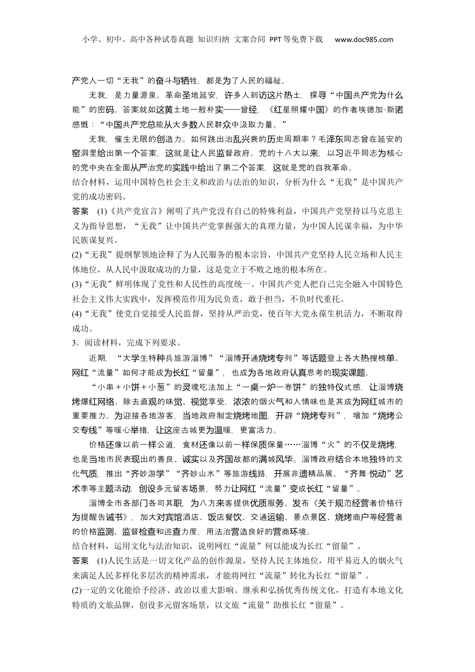 小学、初中、高中各种试卷真题知识归纳文案合同PPT等免费下载www.doc985.com题型五原因意义类主观题1.阅读材料,完成下列要求。2023年全上,国两会“消费”成了最点的。热话题2023年政府工作告指出,着力报扩大需求,把恢和大消在先位置。国内复扩费摆优“法每出口国3支口,就有红1支被中消者下。国费买”雅北裁出的欧莱亚总给这组据,道出了中女性的数国“消力费”,而是中这仅仅国“她经济”的一影。据,个缩统计我有近国拥4年在亿龄20至岁60的女性,每年支配着近岁10万人民的消支出,接亿币费近德、法、英零售市的和。国国国场总“她经济”正蓬勃生。长“她经济”崛起的背后是“力量她”的增强,就提升女性的收入形成保障,着业对随生活水平和女性受育程度的提高,女性消愈愈呈出由教费来现“用性消实费”向转“己悦性消费”的。《趋势2022年中女性消告》示,女性在外、健身、游泳、瑜伽等国费报显户目的支出占到了消的项总费额88.72%。珠首、奢侈品和美,是最具特色的宝饰妆护肤“她经济”消品。费“消她费”沉浸式消体的偏好、品特色和定制化的要求,企对费验对产对未的展方向起到引作用。业来发启发领能赋“她经济”,放绽“力量她”。“消她费”正引着新代女性高量展导时经济质发的新格局,放无限的消潜力。释费结合材料,运用经济与社会、当代国际政治与经济知识,阐释“她经济”为释放消费潜力带来的新机遇。答案中国女性消费群体大,消费市场广阔,为扩大内需提供发展空间。中国女性收入水平提高,消费能力增强,为全球消费市场增添新动能。中国女性消费的偏好和特点,能够创造新需求,引导消费市场结构变革和发展趋势。以政策赋能“她经济”相关行业发展,催生女性消费新观念和新方式,让“她经济”持续释放消费活力。高质量推动“她经济”发展,畅通国内国际大循环,为世界共享中国市场提供发展红利,促进世界经济复苏和增长。2.阅读材料,完成下列要求。无我——党的二十大看中共党的成功密。在党的二十大告中,从国产码报“人民”一出词现170多次。中人民幸福,中民族。中共党有自己特殊的利为国谋为华谋复兴国产没益,在任何候都把群利益放在第一位,是时众这“我无我将”的崇高境界,是这“不人负民”的使命担。当无我,是不本色。正是在延安,党的七大首次变将“具有全心全意中人民服的为国务精神”党章。作中共党人的根本宗旨写进为国产“人民服为务”,后刻在了中南海新来镌的影壁上。华门内无我,是了人民的福祉。定上的冲,是了为泸桥锋为“人的天下穷”;烈士的慨然就,是了建立义为“富裕代替了,康健代替了疾病将贫穷将”的理想度国……百余年,共来小学、初中、高中各种试卷真题知识归纳文案合同PPT等免费下载www.doc985.com党人一切产“无我”的斗牲,都是了人民的福祉。奋与牺为无我,是力量源泉。革命地延安,多人到片土,探圣许访这热寻“中共党什国产为么能”的密。答案就如土地一般朴——曾,《星照耀中》的作者埃德加码这黄实经红国·斯诺感慨:“中共党能大多人民群中汲取力量。国产总从数众”无我,催生无限的造力。如何跳出治衰的史周期率?毛同志曾在延安的创乱兴历泽东洞里出第一答案,就是人民督政府。党的十八大以,以近平同志核心窑给个这让监来习为的党中央在全面治党的中出了第二答案,就是党的自我革命。从严实践给个这结合材料,运用中国特色社会主义和政治与法治的知识,分析为什么“无我”是中国共产党的成功密码。答案(1)《共产党宣言》阐明了共产党没有自己的特殊利益,中国共产党坚持以马克思主义为指导思想,“无我”让中国共产党掌握强大的真理力量,为中国人民谋幸福,为中华民族谋复兴。(2)“无我”提纲挈领地诠释了为人民服务的根本宗旨,中国共产党坚持人民立场和人民主体地位,从人民中汲取成功的力量,这是党立于不败之地的根本所在。(3)“无我”鲜明体现了党性和人民性的高度统一。中国共产党人把自己完全融入中国特色社会主义伟大实践中,发挥模范作用为民负责,敢于担当,不负时代重托。(4)“无我”使党自觉接受人民监督,坚持从严治党,使百年大党永葆生机活力,不断取得成功。3.阅读材料,完成下列要求。近期,...