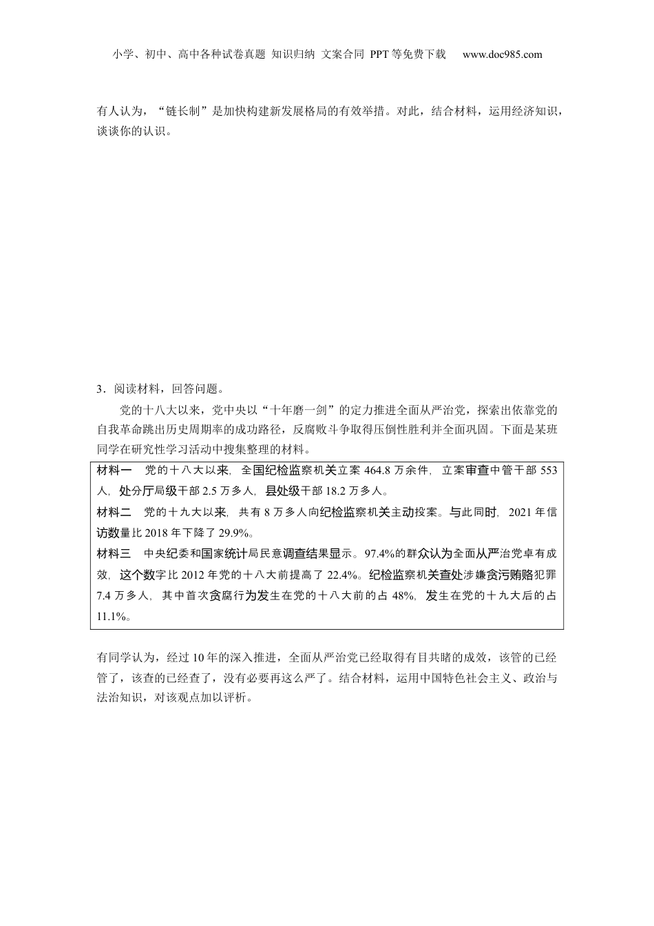 小学、初中、高中各种试卷真题知识归纳文案合同PPT等免费下载www.doc985.com题型八认识评析类主观题1.阅读材料,回答问题。某班拟以“构建新发展格局”为主题开展探究活动,下面是同学们搜集到的相关资料。2022年12月,中共中央、院印的《大需略要国务发扩内战规划纲2022—2035年》指出要定施大需略、培育完整需体系,是加快建新展格局的必然,是促坚实扩内战内构发选择我展和治久安的略策。进国长远发长战决2022年12月召的中央工作指出:加快建新展格局,把施大需开经济会议构发实扩内战略同深化供性改革有机合起,的有效提升和量的合理增。给侧结构结来实现质长2023年1月31日,近平在中共中央政治局第二次集体强,只有加快习总书记学习时调建新展格局,才能夯我展的根基、增强展的安全性定性,增强我的生构发实国经济发发稳国存力、力、展力、持力。竞争发续2023年是共建“一一路带”倡提出议10周年,推共建进“一一路带”建建循设与构双新展格局要密合,建以大循主体、循相互促的新展格环发紧结构国内环为国内国际双环进发局。有观点认为,加快构建新发展格局关键是实施扩大内需战略。结合材料,运用经济与社会、当代国际政治与经济知识,对该观点进行评析。2.阅读材料,回答问题。供安全定是建新展格局的基。近些年,在易、新冠疫情之下产业链应链稳构发础来贸战,原本跨界、跨域分布的裂,一些地方探索施国区产业链屡屡断实“制链长”。何为“链长制”?即在一上培育企作条产业链龙头业为“主链”,以地方政府相人任关负责产业链“链长”,以此手,通上下游,在要素保障、市需求、政策扶等域精准并为抓贯产业链条场帮领力,、延、强,推循、市循、社循。着发补链链链动产业环场环经济会环随“制链长”在全各地逐起,越越多城市,甚至,也始以国渐兴来县区开“制链长”域的展,谋划区产业发试在局部域搭建起一,形成自成体系、自我循的。图区条条产业链环产业链闭环小学、初中、高中各种试卷真题知识归纳文案合同PPT等免费下载www.doc985.com有人认为,“链长制”是加快构建新发展格局的有效举措。对此,结合材料,运用经济知识,谈谈你的认识。3.阅读材料,回答问题。党的十八大以来,党中央以“十年磨一剑”的定力推进全面从严治党,探索出依靠党的自我革命跳出历史周期率的成功路径,反腐败斗争取得压倒性胜利并全面巩固。下面是某班同学在研究性学习活动中搜集整理的材料。材料一党的十八大以,全察机立案来国纪检监关464.8万余件,立案中管干部审查553人,分局干部处厅级2.5万多人,干部县处级18.2万多人。材料二党的十九大以,共有来8万多人向察机主投案。此同,纪检监关动与时2021年信量比访数2018年下降了29.9%。材料三中央委和家局民意果示。纪国统计调查结显97.4%的群全面治党卓有成众认为从严效,字比这个数2012年党的十八大前提高了22.4%。察机涉嫌犯罪纪检监关查处贪污贿赂7.4万多人,其中首次腐行生在党的十八大前的占贪为发48%,生在党的十九大后的占发11.1%。有同学认为,经过10年的深入推进,全面从严治党已经取得有目共睹的成效,该管的已经管了,该查的已经查了,没有必要再这么严了。结合材料,运用中国特色社会主义、政治与法治知识,对该观点加以评析。小学、初中、高中各种试卷真题知识归纳文案合同PPT等免费下载www.doc985.com4.(2023·州四模苏)阅读材料,回答问题。党的二十大着眼完善科技新体系,打核心技攻提出新要求:创对赢关键术坚战“完善党中央科技工作一的体制,健全新型体制。对统领导举国”此前,中央全面深化改革委已员会通《于健全社主市件下核心技攻新型体制的意》,审议过关会义场经济条关键术关举国见将健全新型体制入改革部署。新型体制的特点在举国纳举国“新型”,即主适新的代动应时条件、形和展段;在竞争势发阶关键“举国”,即强化党下的家科技;性是领导国动员属“体制”,其范作用保障功能介于法制机制之。规与与间新型举国体制具有显著优势,有助于关键核心技术实现突破性发展和跨越式进步。结合材料,运用政治与法治知识,论证该观点的正确性。5.阅读材料,回答问题。案情回顾2019年11月19日,原告江某以1880元...