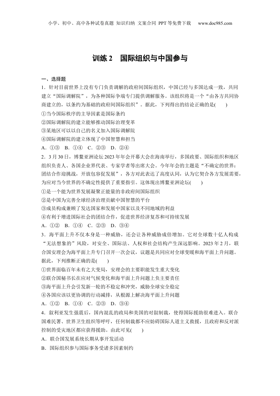 小学、初中、高中各种试卷真题知识归纳文案合同PPT等免费下载www.doc985.com训练2国际组织与中国参与一、选择题1.针对目前世界上没有专门负责调解的政府间国际组织,中国已经与多国达成一致,共同建立“国际调解院”,为各种国际争端专门提供调解服务。该组织将是一个“由各方共同协商建立的,以条约为基础的政府间国际组织”。据此,下列得出的结论正确的是()①当今国际秩序的主导因素是国际条约②国际调解院的建立能够推动国际治理变革③某地区可以以自己的名义加入国际调解院④国际调解院的建立体现了中国智慧和担当A.①③B.①④C.②③D.②④2.3月30日,博鳌亚洲论坛2023年年会开幕大会在海南举行,多国政要、国际组织和地区组织负责人、各国企业界代表、专家学者等出席大会。今年年会的主题是“不确定的世界:团结合作迎挑战,开放包容促发展”,各方对此表达了高度认同,认为它契合各方发展需要,为应对当今世界的不确定性提供了重要指引。这体现出博鳌亚洲论坛()①是一个能为世界发展凝聚正能量的非政府间国际组织②是中国为完善全球经济治理贡献中国智慧的平台③成员构成兼顾了发达国家和发展中国家以及不同地域的利益④有利于增进国际社会的团结合作,促进世界经济复苏和可持续发展A.①②B.①④C.②③D.③④3.海平面上升不仅本身是一种威胁,还会让各种威胁成倍增加。它对全球数十亿人构成“无法想象的”风险,对安全、国际法、人权和社会结构产生深远影响。2023年2月,联合国安理会为海平面上升专门召开一次会议,议题是共同应对全球变暖和海平面上升问题。据此,下列推断正确的是()①世界面临百年未有之大变局,安理会的主要职能发生重大变化②联合国秘书长在应对气候变化和海平面上升问题上负主要责任③海平面上升会引发新一轮的不稳定和冲突,威胁全球安全稳定④各国应该以更协调的行动减排,从根源上解决海平面上升问题A.①②B.①④C.②③D.③④4.叙利亚发生强震后,国内混乱的政局和美国的对叙制裁,使得国际援助很难进入。联合国难民署、世界卫生组织等呼吁,任何制裁都不应妨碍国际人道主义救援,且政府和反对派控制的受灾地区都应获得援助。由此可见()A.联合国发展系统长期从事开发活动B.国际组织参与国际事务受诸多因素制约小学、初中、高中各种试卷真题知识归纳文案合同PPT等免费下载www.doc985.comC.联合国是实践多边主义的最佳场所D.国际组织可以调停和解决国际政治冲突5.北溪天然气管道是重大跨国基础设施,其爆炸事件对全球能源市场和生态环境产生了严重负面影响。中国支持联合国开展国际调查,为保障跨国基础设施安全发挥了建设性作用。由于种种原因,联合国关于“调查北溪天然气管道爆炸事件”的会议被无限期推迟。这表明()①中国积极参与全球治理推动世界多极化发展②中国作为负责任的大国尊重联合国权威地位③联合国在解决和平与发展问题上有重要作用④联合国在处理国际事务和问题上具有局限性A.①③B.②③C.①④D.②④6.根据《通胀削减法案》,美国将在气候和清洁能源领域投资约3700亿美元,但其中多项补贴政策和税收优惠仅面向美国本土企业或在美运营的企业。欧盟认为,美国歧视欧盟生产的新能源车辆违反了国际贸易法,它将继续寻求为欧盟成员国新能源车生产商争取非歧视待遇。这说明()①不同力量中心之间相互制衡改变了时代主题②国际竞争需要各方共同遵守一定的国际规则③实现社会经济可持续发展是欧盟的共同目标之一④霸权主义和强权政治成为最突出的新的安全威胁A.①②B.①④C.②③D.③④7.美联储连续加息,给全球金融市场带来压力,东盟国家货币相对美元整体呈贬值趋势。面对挑战,东盟积极扩大同中国的合作,为经济复苏注入动力。由此可见()①世界经济发展的不确定性和不稳定性加剧②加强合作来提升地区活力是东盟主要目标③东盟成为推进区域一体化建设的重要平台④东盟是政府间、区域性、一般性国际组织A.①②B.①④C.②③D.③④8.2023年2月18日,国家主席习近平致电第36届非洲联盟峰会,向非洲国家和人民表示热烈祝贺时指出,过去一年来,非盟团结带领非洲国家,积极应对全球性挑战,加快推进非洲自贸区...