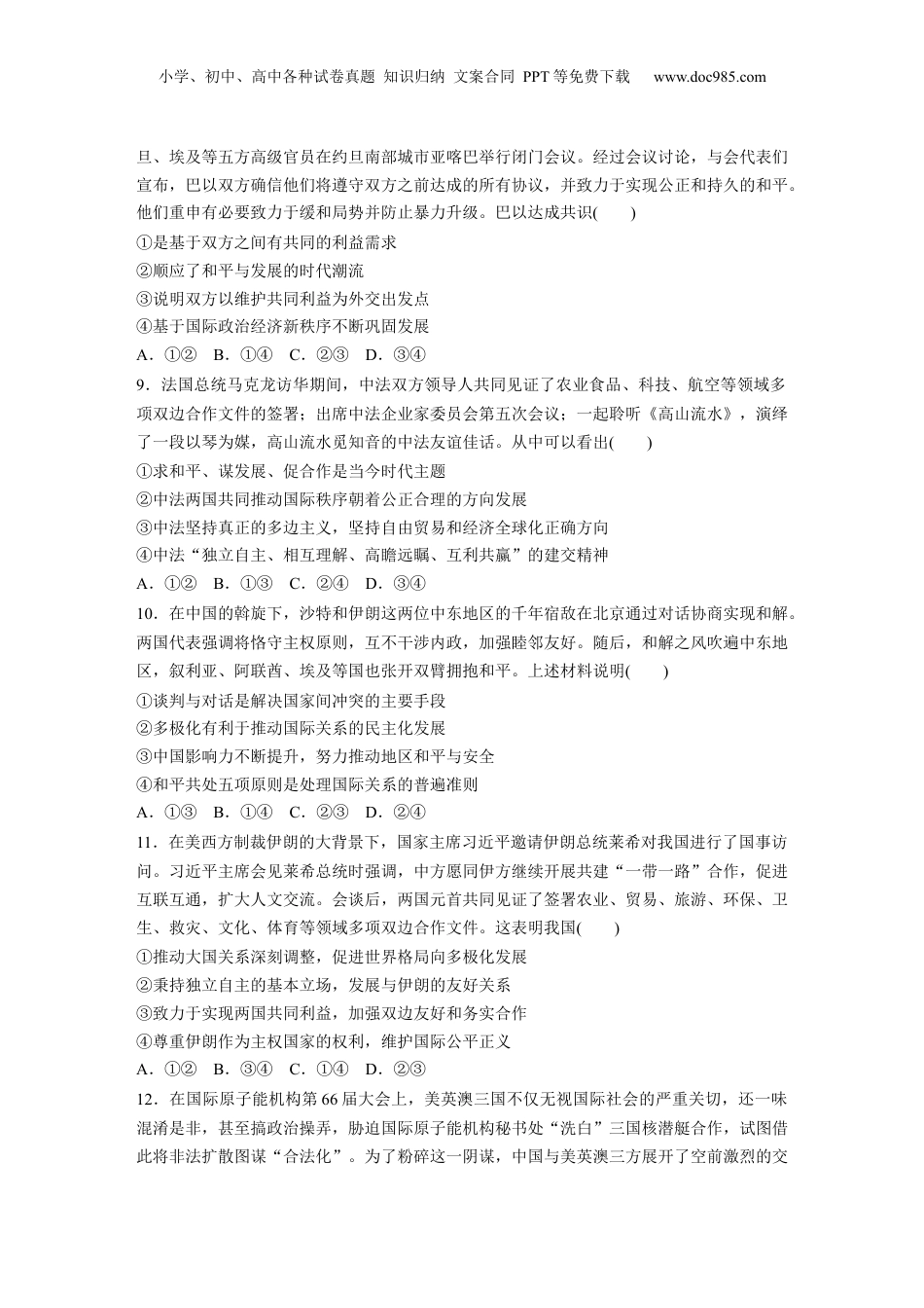 小学、初中、高中各种试卷真题知识归纳文案合同PPT等免费下载www.doc985.com训练1世界多极化与中国外交一、选择题1.中国无人飞艇误入美国领空,是一起由不可抗力导致的意外偶发事件。美国国防部此前也表示这个飞艇不会对地面人员构成军事和人身威胁。但美国国防部仍一口咬定该飞艇为“间谍气球”,后用战机导弹将其击落,并以此为借口非法制裁中国企业和机构。中方对此坚决反对,并依法对此采取反制措施。以下对材料解读正确的是()①维护国家核心利益是我国外交的基本宗旨②我国坚定维护自身国家利益,反对霸权主义③中美之间由于国家性质不同必然导致利益不同④美国违背了《联合国宪章》的宗旨和原则A.①②B.①③C.②④D.③④2.2023年1月6日,国家主席习近平同土库曼斯坦总统举行会谈,两国元首宣布将中土关系提升为全面战略伙伴关系,就推动构建中土命运共同体达成重要共识,并共同见证签署“一带一路”等领域合作文件。这标志着中国同中亚五国实现了“三个全覆盖”,即全面战略伙伴关系全覆盖、双边层面践行人类命运共同体全覆盖、签署共建“一带一路”合作文件全覆盖。这()①表明多边主义已经成为各国的共识②有利于推动地区和世界的和平与发展③说明中国与中亚五国的根本利益是一致的④增进了彼此间的交流,扩大了共同利益A.①③B.①④C.②③D.②④3.当地时间2023年3月25日,洪都拉斯宣布与中国台湾断绝“外交关系”,3月26日,中国和洪都拉斯建交。中方将在一个中国原则基础上,秉承相互尊重、平等互利、共同发展的精神,积极推动同洪方各领域互利合作,助力洪都拉斯经济社会发展,造福两国和两国人民。洪都拉斯之所以与中国建交,是因为()①与中国台湾断绝“外交关系”,承认一个中国原则②中国将为洪都拉斯的发展带来更多的合作机会和资源渠道③两国人民根本利益一致,建交必将为两国人民带来更多福祉④我国坚持国家利益至上,坚决捍卫国家主权、安全和发展利益A.①②B.①④C.②③D.③④小学、初中、高中各种试卷真题知识归纳文案合同PPT等免费下载www.doc985.com4.沙特阿拉伯是美国最重要的中东盟国之一,也是美国在中东重要战略支点。乌克兰危机发生后,美国敦促沙特增加石油产量稳定油价,但遭到拒绝,两国分歧加深。从国际关系角度看,两国分歧加深的主要原因在于()①合作和竞争是国际关系基本表现形式②维护国家利益是主权国家对外活动的目的所在③国家利益是统治阶级意志和利益的体现④谋求独立自主意识与霸权主义思维的矛盾对立A.①③B.②④C.①②D.③④5.据统计,美国对外制裁从2000年到2021年间增加了933%。截至2022年底,美国已对世界上近40个国家实施过经济制裁,全球近一半人口受到影响。在特朗普任期内美国政府累计实施逾3900项制裁措施,相当于平均每天挥舞3次“制裁大棒”。中方认为要合作不要对抗、要多边不要单边、要团结不要分裂是国际社会的普遍共识。美方应该认真倾听国际社会的正义呼声,停止滥施单边制裁的霸权行径,切实为促进世界和平与发展发挥建设性作用。由材料可以看出()①霸权主义和强权政治阻碍时代发展②美国作为双边主义者是国际秩序的破坏者③我国坚持走和平发展道路、奉行互利共赢开放战略④国家实力是影响国际关系的唯一决定因素A.①③B.①④C.②③D.②④6.过去几年,国际社会普遍感到世界变得更加动荡和不安全了。世界怎么了?我们怎么走出安全困境?2023年2月21日,中国发布了《全球安全倡议概念文件》,为破解全球安全困境提供了切实可行的中国方案。实现世界持久和平,要求各国()①坚决维护国家主权、安全和发展利益②有效维护和遵守《联合国宪章》的宗旨和原则③通过对话与协商解决国家间的分歧和争端④摒弃零和博弈的思维,变竞争冲突为合作共赢A.①②B.①④C.②③D.③④7.在2023年的两会上,外交部部长在答中外记者问时提到迈向全球治理的道路并不平坦。中国古人讲,“天下兼相爱则治,交相恶则乱”。古人还讲,“道私者乱,道法者治”。这告诉我们在全球治理中()①要以各国共同利益为出发点开展对外交往②要遵循《联合国宪章》所体现的国际法精神③要秉持公平公理,反对霸权私利④要建立以独立...