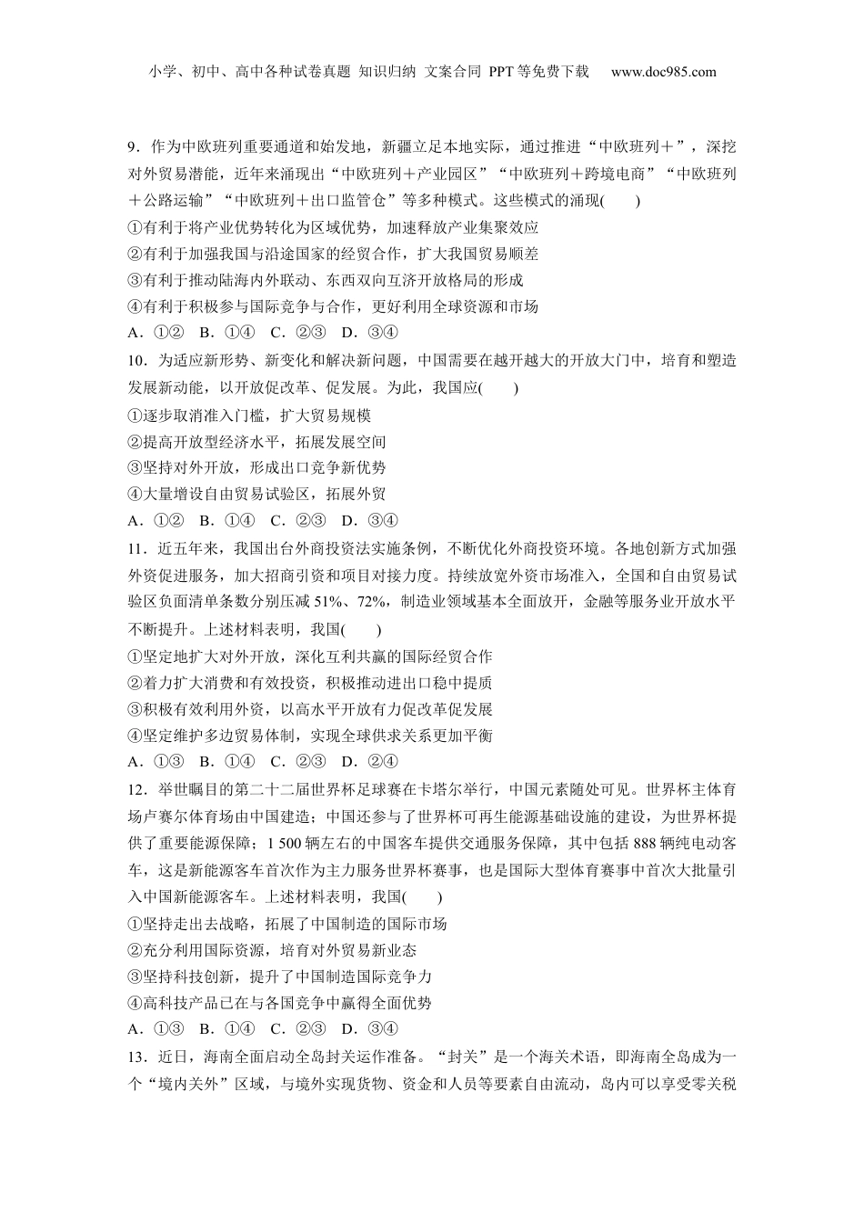 小学、初中、高中各种试卷真题知识归纳文案合同PPT等免费下载www.doc985.com训练2适应经济全球化推进高水平对外开放一、选择题1.一部智能手机的问世,集合了芯片、摄像头、高端机床、模具制造等各种精细工艺。高科技产业分工日趋复杂,高度依赖全球协同,搞“脱钩”“断链”只会造成一损俱损。国际货币基金组织发出警告,全球“科技脱钩”将使全球经济产出“减少一个数量级”。由此可见,经济全球化()A.使我国成为最大的受益者B.总体上符合经济规律和各方利益C.降低了世界经济发展的不确定性D.解决了世界经济发展不平衡问题2.“如果欧盟、德国与中国脱钩,德国将遭受相当于英国脱欧时(的德国)6倍的损失。”这是德国知名智库伊弗经济研究所发布的一项受巴伐利亚工业协会委托进行的分析报告得出的结果。之所以得出这一分析结果,是因为()①经济全球化使得各国之间的联系日益密切②中国经济在世界经济体系中占有重要地位③中国营商环境改善关税水平低于其他国家④中国制造已成为德国制造的主要竞争对手A.①②B.①③C.②④D.③④3.拉丁美洲是世界上最大的粮食和农产品净出口地区之一。在当前的粮食危机中,拉丁美洲具有稳定和降低国际粮食价格的巨大潜力,使亚洲消费者受益。但这种潜力的实现不能以牺牲自然资源为代价。中国、日本和韩国可以利用自身的创新系统,弥补拉丁美洲在采用新的数字和微生物技术以提高作物产量和减少食品碳足迹方面的不足。这说明,加强国际合作()①能够推动资源流动,发挥各国比较优势②有利于降低粮食安全等传统安全威胁③有利于促进科技进步,推动产业升级④能推动国际秩序朝着更加公正的方向发展A.①③B.①④C.②③D.②④4.贸易是全球经济发展中的重要因素,贸易与许多国家的收入和贫困水平息息相关。世界银行相关报告指出,国际贸易成本增长1%会使人均收入下降0.2%。为降低贸易成本,以下做法中值得肯定的有()①发挥比较优势,培育和壮大高技术产业,扩大贸易规模②扩大开放力度,放宽市场准入,降低关税,减少贸易壁垒小学、初中、高中各种试卷真题知识归纳文案合同PPT等免费下载www.doc985.com③创新对外投资方式,促进国际产能合作,提高市场流动性④改善交通和通信等基础设施,疏通物流渠道,提高贸易效率A.①②B.①③C.②④D.③④5.当前世界百年变局与世纪疫情交织叠加,全球经济总体下行压力不断累积,经济疲软复苏乏力。同时,国际力量对比深刻调整,国际政治、经济局势日趋复杂。大国博弈、地缘冲突、区域争端频发,引发国际能源市场动荡不安,对我国经济和能源安全带来巨大挑战。对此,下列认识正确的是()①经济全球化背景下世界发展面临的不确定性以及风险性增加②我国需要积极应对经济全球化的挑战,维护国家能源安全③各国都积极参与全球治理,不断推动全球治理体系变革④作为世界主要经济体和负责任大国,我国坚持多边主义A.①②B.①④C.②③D.③④6.“如果你在寻求增长,答案非常简单。下一个‘中国’在中国。”2022年,中国对“一带一路”沿线国家进出口总额比上年增长19.4%;新版自贸试验区外资准入负面清单施行,制造业条目清零;区域全面经济伙伴关系协定实施一年,中国与其他成员国进出口总额达12.95万亿元,同比增长7.5%……由材料可知()A.我国坚持单边行动与集体行动相结合B.深化多边合作是实现经济安全的关键C.扩大制度型开放使我国深度融入全球化D.跨国公司为经济全球化提供强有力的载体7.2023年3月第二周,美国包括硅谷银行在内的三家银行相继倒闭,引发各国对发生新一轮全球金融危机的担忧,担心再次像当年亚洲金融危机和美国金融海啸那样迅速波及并给世界经济造成巨大损失。这启示各国在经济全球化进程中要()①结成你中有我、一荣俱荣、一损俱损关系②加强沟通协调,照顾彼此利益关切谋发展③完善全球治理,引导好经济全球化的走向④反对损人利己,加强合作、严控资金流通A.①②B.①④C.②③D.③④8.2023年2月9日,商务部在北京召开欧洲企业座谈会,商务部有关负责人表示,欢迎欧洲企业继续加大来华投资,为深化双边合作发挥积极作用。我国吸引国外企业继续加大来华投资()①表明我国愿为...