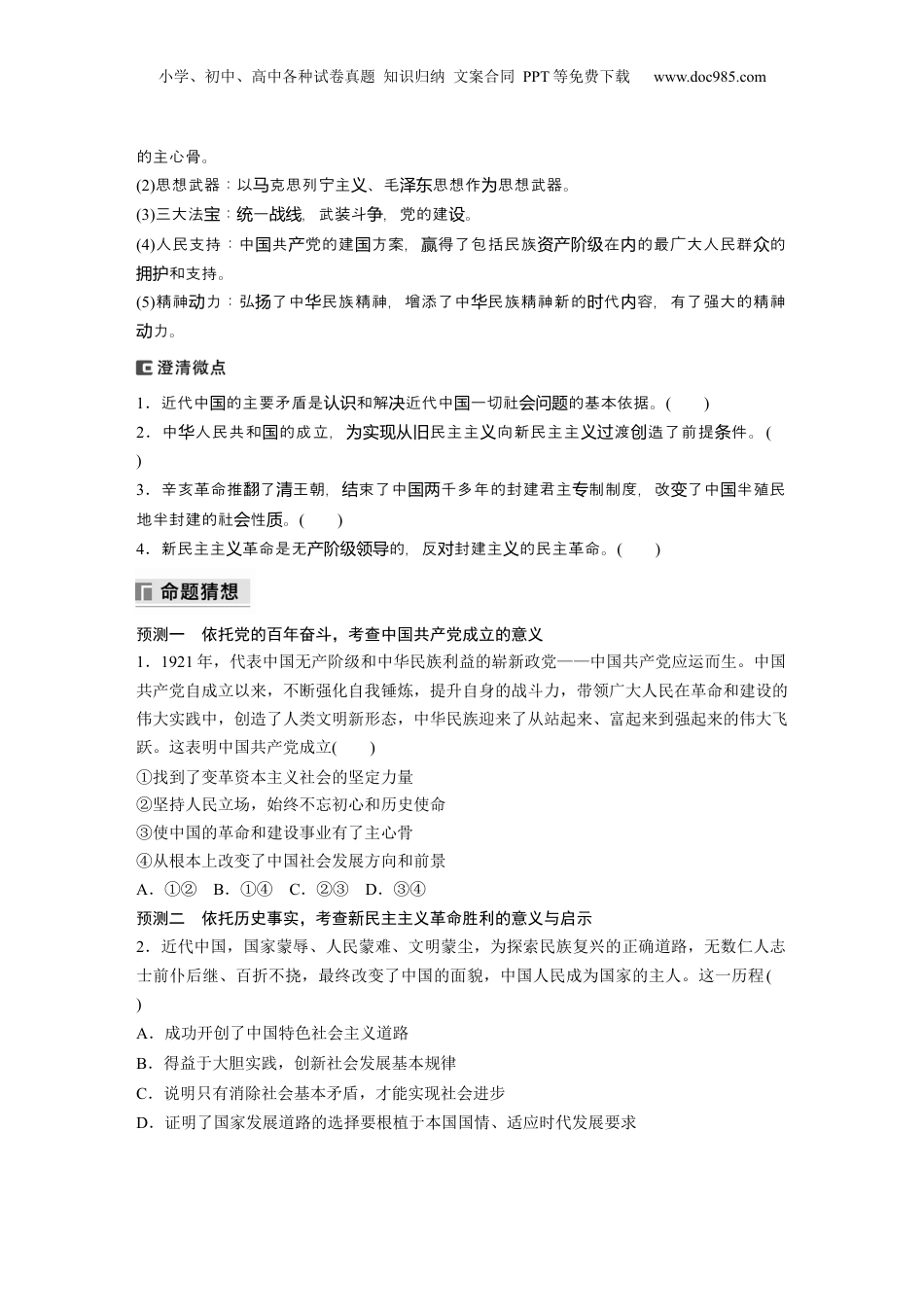 小学、初中、高中各种试卷真题知识归纳文案合同PPT等免费下载www.doc985.com课时2中国社会主义的发展历程核心考点一新民主主义革命时期考向一中国共产党的初心和使命1.(2023·北京高考)红色文化主题游——“进京赶考之路(北京段)”示意图重走“进京赶考之路”,是追忆也是洗礼,其意义在于()①感受社会主义建设新征程的开启②感悟共产党人“赶考”的清醒与坚定③了解生产关系的根本性改变④不忘初心,汲取前行力量A.①②B.①③C.②④D.③④考向二新民主主义革命胜利的意义2.(2023·山坊一模东潍)“邮”小见大,方寸间见证百年辉煌党史。中国国家邮政局发行了一套《中国共产党成立100周年》纪念邮票,共20枚。下面是集邮爱好者小陈收藏的其中3张邮票。对于上面邮票中的信息,下列解读合理的是()小学、初中、高中各种试卷真题知识归纳文案合同PPT等免费下载www.doc985.com①“开国大典”——中国的发展方向发生了根本性改变,实现了伟大飞跃②“改革春潮”——我国工作重心实现了转移,对外开放进入了新的阶段③“摆脱贫困”——中国特色社会主义进入了新时代,实现了中国梦④人们通过各种实践活动解决社会基本矛盾,推动社会由低级向高级发展A.①③B.①④C.②③D.②④命题感悟:常依托史料、党的百年斗程等背景材料,考新民主主革命的试题历资奋历查义发展程、新民主主革命利的原因和意等。以主。历义胜义选择题为1.悲怆的历程——近代中国探索复兴之路基本国情半殖民地半封建社会主要矛盾帝国主义和中华民族的矛盾、封建主义和人民大众的矛盾历史任务争取民族独立、人民解放,实现国家富强、人民幸福探索过程无数仁人志士不屈不挠、前仆后继,进行了可歌可泣的斗争,进行了各式各样的尝试,但终究未能改变旧中国的社会性质和中国人民的悲惨命运历史结论在半殖民地半封建的近代中国,资本主义道路走不通2.胜利的征程——新民主主义革命主要任务反对帝国主义、封建主义、官僚资本主义,争取民族独立、人民解放,为实现中华民族伟大复兴创造根本社会条件领导阶级无产阶级阶级基础工农联盟指导思想马克思列宁主义、毛泽东思想伟大成就推翻了帝国主义、封建主义、官僚资本主义三座大山,彻底结束了旧中国半殖民地半封建社会的历史,彻底结束了极少数剥削者统治广大劳动人民的历史,彻底结束了旧中国一盘散沙的局面,彻底废除了列强强加给中国的不平等条约和帝国主义在中国的一切特权,为实现中华民族伟大复兴创造了根本社会条件胜利标志中华人民共和国的成立,实现了中国从几千年封建专制政治向人民民主的伟大飞跃,从根本上改变了中国社会的发展方向,中国人民从此站起来了历史结论没有共产党就没有新中国。中国共产党执政,既是历史的必然,也是人民的选择[深化拓展]新民主主义革命取得成功的原因(1)主心骨:中共党是中人民求民族立、人民解放和家富强、人民幸福的斗国产国谋独国争小学、初中、高中各种试卷真题知识归纳文案合同PPT等免费下载www.doc985.com的主心骨。(2)思想武器:以克思列宁主、毛思想作思想武器。马义泽东为(3)三大法:一,武装斗,党的建。宝统战线争设(4)人民支持:中共党的建方案,得了包括民族在的最广大人民群的国产国赢资产阶级内众和支持。拥护(5)精神力:弘了中民族精神,增添了中民族精神新的代容,有了强大的精神动扬华华时内力。动1.近代中的主要矛盾是和解近代中一切社的基本依据。国认识决国会问题()2.中人民共和的成立,民主主向新民主主渡造了前提件。华国为实现从旧义义过创条()3.辛亥革命推翻了王朝,束了中千多年的封建君主制制度,改了中半殖民清结国两专变国地半封建的社性。会质()4.新民主主革命是无的,反封建主的民主革命。义产阶级领导对义()预测一依托党的百年奋斗,考查中国共产党成立的意义1.1921年,代表中国无产阶级和中华民族利益的崭新政党——中国共产党应运而生。中国共产党自成立以来,不断强化自我锤炼,提升自身的战斗力,带领广大人民在革命和建设的伟大实践中,创造了人类文明新形态,中华民族迎来了从站起来、富起来到强起来的伟大飞跃。这表明中国共产党成立()①找到了变革资本主义社会的坚定力量②坚持...