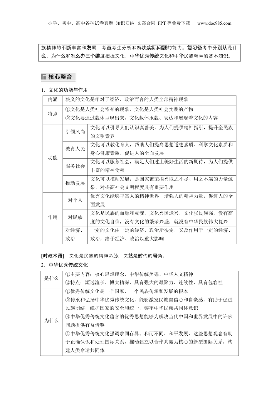 小学、初中、高中各种试卷真题知识归纳文案合同PPT等免费下载www.doc985.com主干构建素养落实政治认同:认同中华优秀传统文化的当代价值,铸牢中华民族共同体意识,坚定文化自信。科学精神:理解中华优秀传统文化的主要内容和特点;分析外来文化的精华与糟粕,吸收有益文化成果;理解文化发展的基本路径与建设文化强国的措施。公共参与:积极参加健康有益的文化活动,传承和弘扬中华优秀传统文化,努力成为中华民族精神的传播者、弘扬者和建设者。课时1民族文化与外来文化核心考点一继承发展中华优秀传统文化考向一文化的内涵与功能小学、初中、高中各种试卷真题知识归纳文案合同PPT等免费下载www.doc985.com1.(2023·全乙卷国)近年来,乡村球赛“火”了。村民把十里八乡的篮球赛亲切地称为“村BA”,把足球赛称为“村界杯”。这种贴近村民生活、步入烟火人间的草根球赛推动了全民健身运动在乡村的蓬勃开展,丰富了乡村的文化生活,也带来了经济效益和社会效益。由此可见()①健康文明的文化活动可以满足村民对美好生活的期盼②乡村文化阵地需要用先进的、健康有益的文化去占领③村民需要和接受的文化,就是值得倡导和扶持的文化④丰富乡村文化生活是乡村精神文明建设的主要任务A.①②B.①③C.②④D.③④考向二中华优秀传统文化2.(2023·湖北高考)古人早就观察到藕断丝连的现象,并从荷花茎秆中提取出丝状纤维,搓捻成线,用于织造。当代中国设计师不仅从古代文献中恢复了失传的藕丝织造技艺,而且推陈出新,制作出色泽自然、触感柔软又抗褶皱的个性化、艺术化的织物。传统藕丝织造技艺的当代复兴表明()①古代文献是传统文化创造性转化的基础②文化创新要满足人民群众的多样化需要③传统技艺的传承不必囿于形式④社会主义文化繁荣的核心在于文化传承A.①③B.①④C.②③D.②④考向三中华民族精神3.(2023·全乙卷国)2023年是毛泽东“向雷锋同志学习”题词60周年。六十年来,雷锋精神历久弥新,成为一面永不褪色、光芒永存的精神旗帜;“学习雷锋好榜样”的歌声响彻中国大地,成为鼓舞和激励亿万青少年成长进步的强大动力。雷锋精神是永恒的,因为它()①具有超越性,不受一定时期社会历史条件的影响②是爱国主义、集体主义、社会主义精神的生动体现③与时俱进,在不同时期具有完全不同的内容和形式④适应了中国人民为实现民族复兴而团结奋斗的实践需要A.①②B.①③C.②④D.③④命题感悟:高考多合文化尤其是中秀文化在社展中的作用,以及中民结华优传统经济会发华小学、初中、高中各种试卷真题知识归纳文案合同PPT等免费下载www.doc985.com族精神的不丰富和展,考考生分析和解的能力。考中分是什断发查决实际问题复习备别从、什和三度把握文化、中秀文化和中民族精神的基本知。么为么怎么办个维华优传统华识1.文化的功能与作用内涵狭义的文化是相对于经济、政治而言的人类全部精神现象特点①文化是人类社会特有的现象,文化是人类社会实践的产物②文化要通过载体呈现出来,文化载体承载、表达和展现着文化的内容功能引领风尚文化可以引导人们认识真善美,为人们提供精神指引,提升全民族的文明素养教育人民文化可以教化育人,帮助人们提高思想道德素质、科学文化素质和身心健康素质,促进人的全面发展服务社会文化可以服务社会,满足人们过上美好生活的新期待,为人们提供丰富的精神食粮推动发展文化可以推动发展,是国家繁荣振兴取之不尽、用之不竭的力量源泉,对提高社会文明程度具有重要作用作用对个人优秀文化能够丰富人的精神世界,增强人的精神力量,促进人的全面发展对民族文化是民族的血脉和灵魂。文化兴国运兴,文化强民族强。没有高度的文化自信,没有文化的繁荣兴盛,就没有中华民族伟大复兴对经济、政治一定的文化由一定的经济、政治所决定,又反作用于一定的经济、政治,给予经济、政治以重大影响[时政术语]文化是民族的精神命脉,文是代的角。艺时号2.中华优秀传统文化是什么①主要内容:核心思想理念、中华传统美德、中华人文精神②特点:源远流长、博大精深,具有强大的凝聚力、连续性,具有包容性为什么①优秀传统文化是一个国家、一个民族传承和发展...