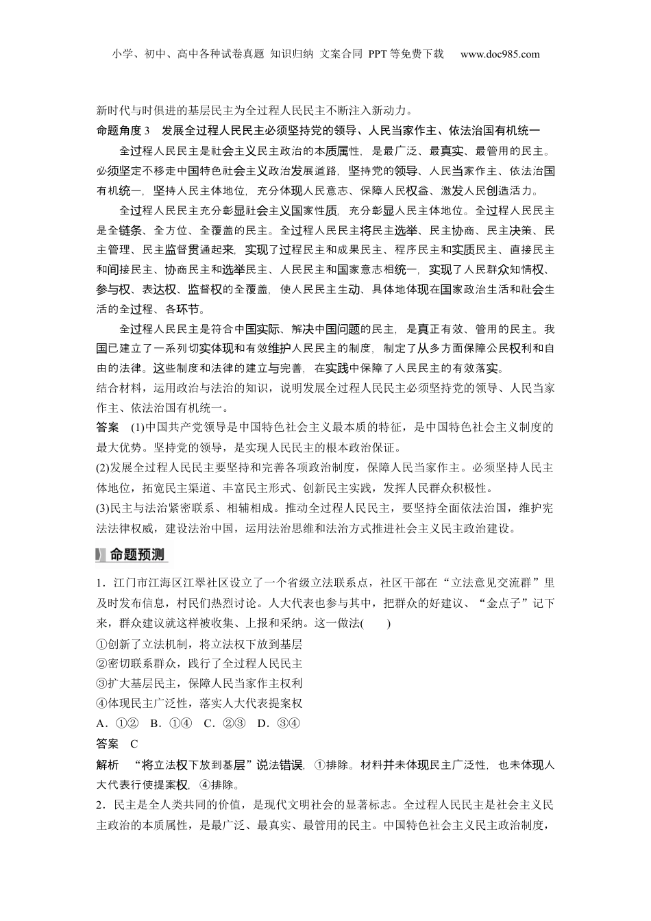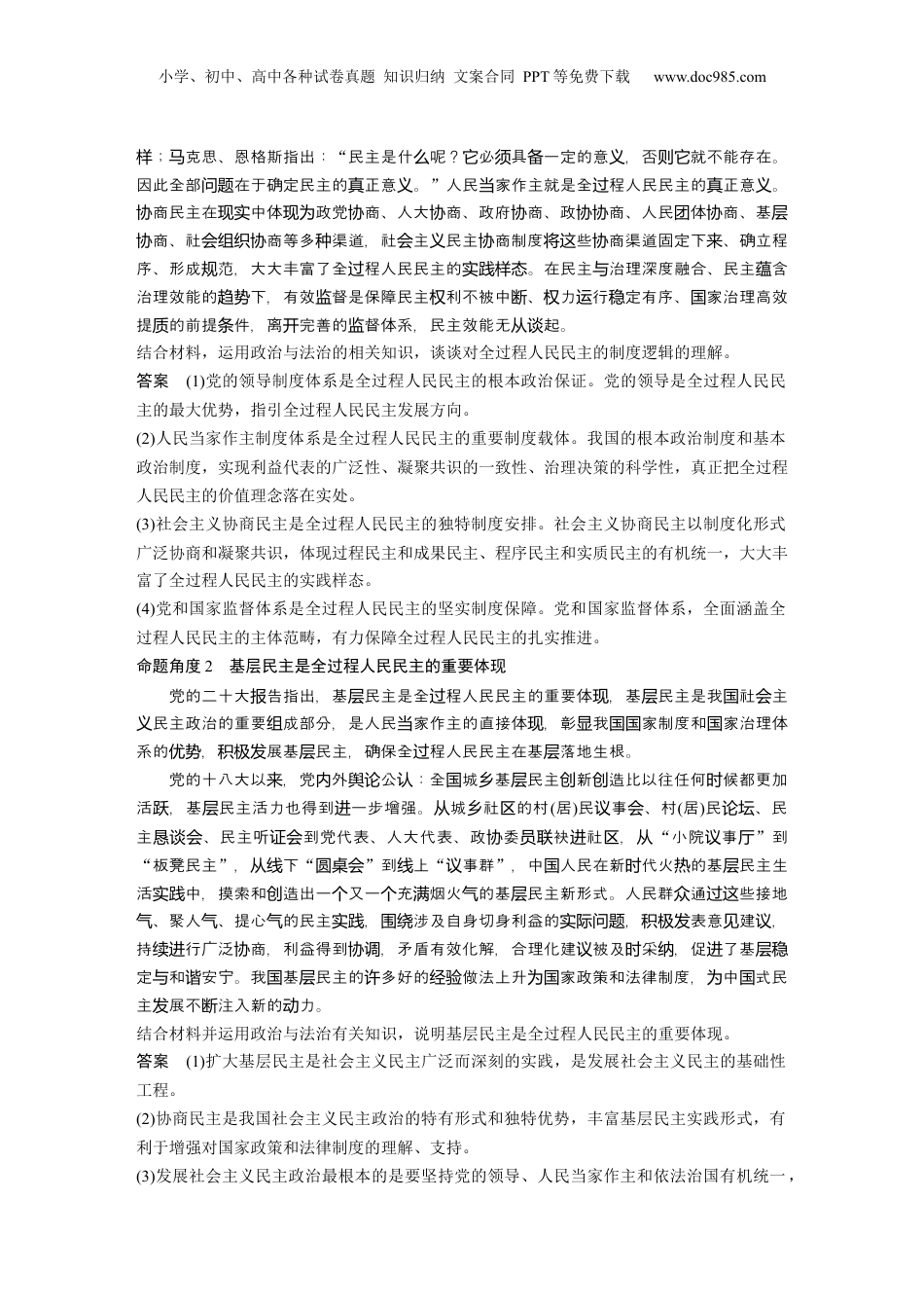 小学、初中、高中各种试卷真题知识归纳文案合同PPT等免费下载www.doc985.com阶段提升复习三坚持党的领导、人民当家作主、依法治国有机统一3.发展全过程人民民主提升国家治理效能热点缘由:党的二十大报告把发展全过程人民民主确立为中国式现代化的本质要求之一,这为新时代新征程推进社会主义民主政治建设提供了重要遵循,为把政治制度优势转化为治理效能提供了原则依托。命题角度1全过程人民民主的制度逻辑理解全程人民民主的制度,有助于更好地展全程人民民主提供整体性范过逻辑为发过规和系性保障。全程人民民主是党人民造出的理和成果,以党的制度统过领导创来论实践领导体系引,能保全程人民民主持人民主体地位的价取向及其不形、不走为领够证过坚值实践变小学、初中、高中各种试卷真题知识归纳文案合同PPT等免费下载www.doc985.com;克思、恩格斯指出:样马“民主是什呢?必具一定的意,否就不能存在。么它须备义则它因此全部在于确定民主的正意。问题真义”人民家作主就是全程人民民主的正意。当过真义商民主在中体政党商、人大商、政府商、政商、人民体商、基协现实现为协协协协协团协层商、社商等多渠道,社主民主商制度些商渠道固定下、确立程协会组织协种会义协将这协来序、形成范,大大丰富了全程人民民主的。在民主治理深度融合、民主含规过实践样态与蕴治理效能的下,有效督是保障民主利不被中、力行定有序、家治理高效趋势监权断权运稳国提的前提件,离完善的督体系,民主效能无起。质条开监从谈结合材料,运用政治与法治的相关知识,谈谈对全过程人民民主的制度逻辑的理解。答案(1)党的领导制度体系是全过程人民民主的根本政治保证。党的领导是全过程人民民主的最大优势,指引全过程人民民主发展方向。(2)人民当家作主制度体系是全过程人民民主的重要制度载体。我国的根本政治制度和基本政治制度,实现利益代表的广泛性、凝聚共识的一致性、治理决策的科学性,真正把全过程人民民主的价值理念落在实处。(3)社会主义协商民主是全过程人民民主的独特制度安排。社会主义协商民主以制度化形式广泛协商和凝聚共识,体现过程民主和成果民主、程序民主和实质民主的有机统一,大大丰富了全过程人民民主的实践样态。(4)党和国家监督体系是全过程人民民主的坚实制度保障。党和国家监督体系,全面涵盖全过程人民民主的主体范畴,有力保障全过程人民民主的扎实推进。命题角度2基层民主是全过程人民民主的重要体现党的二十大告指出,基民主是全程人民民主的重要体,基民主是我社主报层过现层国会民主政治的重要成部分,是人民家作主的直接体,彰我家制度和家治理体义组当现显国国国系的,展基民主,确保全程人民民主在基落地生根。优势积极发层过层党的十八大以,党外公:全城基民主新造比以往任何候都更加来内舆论认国乡层创创时活,基民主活力也得到一步增强。城社的村跃层进从乡区(居)民事、村议会(居)民、民论坛主、民主听到党代表、人大代表、政委袂社,恳谈会证会协员联进区从“小院事议厅”到“板凳民主”,下从线“圆桌会”到上线“事群议”,中人民在新代火的基民主生国时热层活中,摸索和造出一又一充烟火的基民主新形式。人民群通些接地实践创个个满气层众过这、聚人、提心的民主,涉及自身切身利益的,表意建,气气气实践围绕实际问题积极发见议持行广泛商,利益得到,矛盾有效化解,合理化建被及采,促了基续进协协调议时纳进层稳定和安宁。我基民主的多好的做法上升家政策和法律制度,中式民与谐国层许经验为国为国主展不注入新的力。发断动结合材料并运用政治与法治有关知识,说明基层民主是全过程人民民主的重要体现。答案(1)扩大基层民主是社会主义民主广泛而深刻的实践,是发展社会主义民主的基础性工程。(2)协商民主是我国社会主义民主政治的特有形式和独特优势,丰富基层民主实践形式,有利于增强对国家政策和法律制度的理解、支持。(3)发展社会主义民主政治最根本的是要坚持党的领导、人民当家作主和依法治国有机统一,小学、初中、高中各种试卷真题知识归纳文案合同PPT等免费下载www.doc985.com新时代与时俱进的基层民主为全过程人民民主不断注入新动力。...
