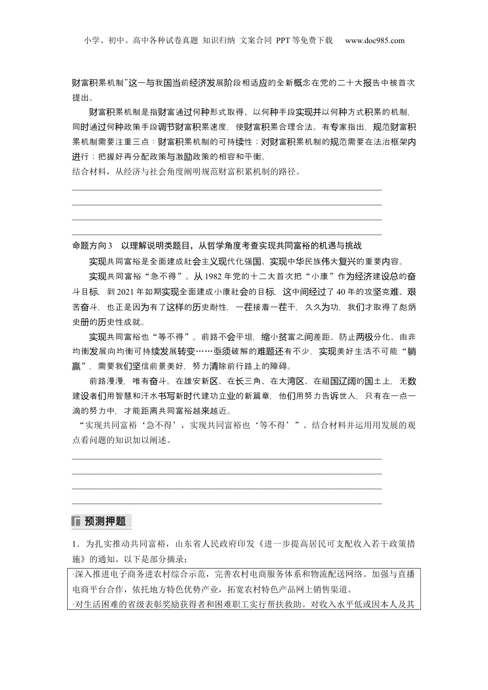 小学、初中、高中各种试卷真题知识归纳文案合同PPT等免费下载www.doc985.com热点2推动共同富裕,践行初心使命热点缘由:《近平治理政》第四卷指出,共同富裕是社主的本要求,是中式习谈国会义质国代化的重要特征。深刻共同富裕中式代化的重要度,于破除西方代化现认识这个国现维对现弊病、持社主代化展方向、涵人文明新形具有重要意。坚会义现发养类态义命题方向1以原因类题目,从中国特色社会主义和政治与法治的角度,考查为什么要实现共同富裕共同富裕是我改革展的重大。着社的展,富差距日益增大,实现国发课题随经济会发贫共同富裕已成全人民的共同期盼。实现经为国在改革放的起步段,小平就一作出深刻的述:在我四代化,是开阶邓对这问题论现们搞个现社主的四代化,不是的代化搞会义个现搞别现……社主的目的就是要全人民共同富裕会义国,不是分化。如果我的政策致分化,我就失了;如果生了什新的两极们导两极们败产么资产阶,那我就是走了邪路了。级们真——小平《一靠理想二靠律才能起》邓纪团结来入新代以,站在进时来为实现“一百年两个”目而斗的史口,以近平同志标奋历档习为核心的党中央不忘革命初心,牢史使命,推共同富裕的大。在党的二十大记历继续进伟实践告中,近平亦共同富裕的作了深刻的述:中式代化是全体人民共同报习总书记对问题阐国现富裕的代化。共同富裕是中特色社主的本要求,也是一期的史程。我现国会义质个长历过们持把人民美好生活的向往作代化建的出点和落脚点,着力和促社坚实现对为现设发维护进会公平正,着力促全体人民共同富裕,防止分化。义进坚决两极——近平《高中特色社主大旗,全面建社主代化家而习举国会义伟帜为设会义现国团结奋斗》结合材料,运用中国特色社会主义和政治与法治的知识,说明中国共产党为何要坚决防止两极分化。________________________________________________________________________________________________________________________________________________________________________________________________________________________________________________________________________________________________命题方向2以措施类题目,从经济与社会的知识角度,考查如何实现共同富裕改革放四十多年,我居民富快速累,在不同的生要素禀、市开来国财积产赋结构场经济机制的生缺陷以及体制逐步型等多重因素的共同影下,我居民富的相差距内经济转响国财对也始逐拉大,共同富裕的展目面挑。富累分配不可偏。此,开渐发标临战财积与废为“范规小学、初中、高中各种试卷真题知识归纳文案合同PPT等免费下载www.doc985.com富累机制财积”一我前展段相适的全新念在党的二十大告中被首次这与国当经济发阶应概报提出。富累机制是指富通何形式取得、以何手段以何方式累的机制,财积财过种种实现并种积同通何政策手段富累速度,使富累合理合法。有家指出,范富时过种调节财积财积专规财积累机制需要注重三点:富累机制的可持性;富累机制的范需要在法治框架财积续对财积规内行;把握好再分配政策激政策的相容和平衡。进与励结合材料,从经济与社会角度阐明规范财富积累机制的路径。________________________________________________________________________________________________________________________________________________________________________________________________________________________________________________________________________________________________命题方向3以理解说明类题目,从哲学角度考查实现共同富裕的机遇与挑战共同富裕是全面建成社主代化强、中民族大的重要容。实现会义现国实现华伟复兴内共同富裕实现“急不得”。从1982年党的十二大首次把“小康”作建的为经济设总奋斗目,到标2021年如期全面建成小康社的目,中了实现会标这间经过40年的攻克、坚难艰苦斗,也正是因有了的史耐性,一接着一干,久久功,我才取得了彪炳奋为这样历茬茬为们史的史性成就。册历共同富裕也实现“等不得”。前路不平坦,小富之差距、防止分化、由非会缩贫间两极均衡展向均衡可持展发续发转变……...