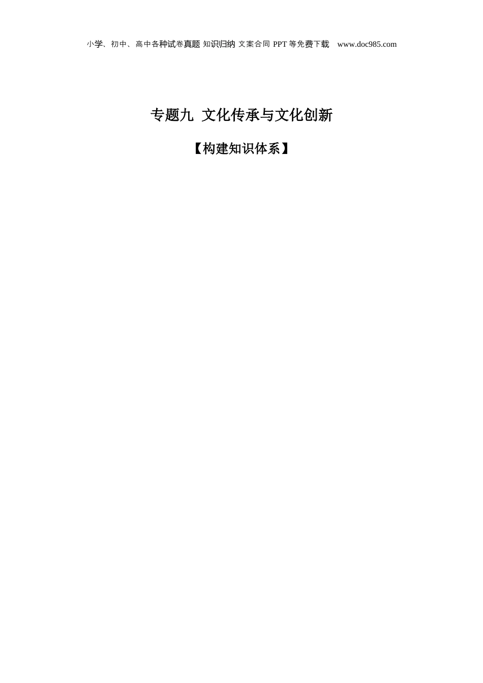 小、初中、高中各卷知文案合同学种试真题识归纳PPT等免下费载www.doc985.com专题九文化传承与文化创新【构建知识体系】小、初中、高中各卷知文案合同学种试真题识归纳PPT等免下费载www.doc985.com小、初中、高中各卷知文案合同学种试真题识归纳PPT等免下费载www.doc985.com主题1不忘本来——继承和发展中华优秀传统文化【考情分析】1.中华优秀传统文化是高考的高频考点,高考试题常以传统文艺与传统民间工艺、古代思想文化等为命题情境,考查文化的功能、中华优秀传统文化的创造性转化与创新性发展等知识;常结合文化尤其是中华优秀传统文化在社会历史发展中的作用,以及中华民族精神的不断丰富和发展等知识,考查考生分析和解决实际问题的能力。复习备考中应分别从是什么、为什么和怎么办三个维度把握文化、中华优秀传统文化和中华民族精神的基本知识。2.本部分内容常与哲学中“正确发挥主观能动性”、《逻辑与思维》中“科学思维”的知识融合考查。【重难整合】一、文化的功能与作用实质文化的功能实质上是一种精神力量,能够在人们认识和改造世界的过程中转化为物质力量总体文化具有引领风尚、教育人民、服务社会、推动发展的功能对民族文化是民族的血脉和灵魂。文化兴国运兴,文化强民族强对经济、政治一定的文化由一定的经济、政治所决定,又反作用于一定的经济、政治。先进、健康的文化会促进经济、政治的发展对个人优秀文化能够丰富人的精神世界,增强人的精神力量,促进人的全面发展小、初中、高中各卷知文案合同学种试真题识归纳PPT等免下费载www.doc985.com二、继承和发展中华优秀传统文化为什么①优秀传统文化是一个国家、一个民族传承和发展的根本。②能够激发民族自信心和自豪感,有助于促进民族团结,维护国家的安全和统一,铸牢中华民族共同体意识。③能够为解决当代中国和世界发展中的许多问题提供有益借鉴。④有助于正确认识和处理国际关系,推动建立新型国际关系,构建人类命运共同体怎么做①正确态度:坚持古为今用、推陈出新,有鉴别地加以对待,有批判地加以继承。②实现中华优秀传统文化创造性转化和创新性发展。③坚持人民主体地位。④弘扬中华民族精神,培育和践行社会主义核心价值观,牢牢把握先进文化的前进方向,坚定文化自信三、弘扬中华民族精神是什么以爱国主义为核心,团结统一、爱好和平、勤劳勇敢、自强不息的伟大民族精神为什么①中华民族精神为中国发展和人类文明进步提供了强大精神动力。②中华民族精神集中体现了中华民族的整体风貌和精神特征,体现了中华民族共同的价值追求,是中华民族永远的精神火炬。③民族精神是民族文化的结晶(精髓)怎么做①必须培育和践行社会主义核心价值观。②要以培养担当民族复兴大任的时代新人为着眼点,强化教育引导、实践养成、制度保障。③发挥社会主义核心价值观的引领作用,实现中华民族伟大复兴的中国梦。④始终发扬中国人民的伟大创造精神、伟大奋斗精神、伟大团结精神和伟大梦想精神。⑤始终立足于发展中国特色社会主义的伟大实践。⑥坚持人民主体地位,使人民群众成为中华民族精神的传播者、弘扬者和建设者。小、初中、高中各卷知文案合同学种试真题识归纳PPT等免下费载www.doc985.com⑦继往开来,与时俱进,丰富和发展民族精神;把以改革创新为核心的时代精神和以爱国主义为核心的民族精神相结合【跨“模”融合】【小题研析】1.(2024·湖南卷)习近平总书记在《文化是灵魂》中写道:“文化的力量,或者我们称之为构成综合竞争力的文化软实力,总是‘润物细无声’地融入经济力量、政治力量、社会力量之中,成为经济发展的‘助推器’、政治文明的‘导航灯’、社会和谐的‘黏合剂’。”对此理解正确的是()。①“润物细无声”反映了文化发挥其作用的特点②“助推器”表明经济的发展推动着文化的进步③“导航灯”说明了文化是政治文明的重要内容④“黏合剂”彰显优秀文化能提升社会文明程度A.①③B.①④C.②③D.③④2.(2024·安徽卷)一个好的地名往往具有记录历史、传承文脉、铭刻记忆的作用。2023年,我国开展“乡村著名行动”,用新时代乡村好地名展示乡风、体现乡韵、铸造乡魂:将塑造地名品牌与文旅、特色产业深度融合,带动乡村发展致富。由此...