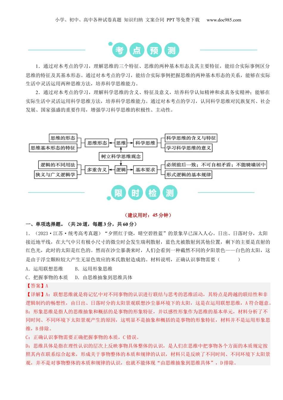 小学、初中、高中各种试卷真题知识归纳文案合同PPT等免费下载www.doc985.com重难点18辩证思维与创新思维本专题高考常选用社会关注的现象或事件为试题情境,考查学生逻辑思维品质,引导学生遵循逻辑规律,揭露诡辩,维护真理,树立科学思维方法。常见题型有两类,一是侧重考查逻辑思维规则的必备知识的选择题,二是侧重考查科学思维方法的主观题。根据学习及考查内容的不同,可将此专题分为两个考向:一是科学思维、逻辑思维基本要求和规则;二是辩证思维方法和创新思维能力。课标要求核心素养1.描述常见的思维活动,体会思维是人所特有的属性,了解思维的基本形态和特征;懂得正确思维的基本条件。区分辩证思维、创新思维2.辨析常见的逻辑错误。掌握并区分形式逻辑的三大基本规律3.掌握辩证思维、创新思维的特点。体悟学会辩证思维、创新思维的意义政治认同:辩证思维、创新思维符合认识规律、遵循逻辑规则的思维,是能够达到正确认识结果的思维科学精神:正确认识思维的共同特征,明确思维的方式。正确认识思维的基本形态、抽象思维和形象思维的主要特征,明确抽象思维和形象思维的关系;在实践中遵循逻辑思维要求、运用辩证思维方法、创新性解决问题公共参与:了解思维的基本知识,初步走入思维世界。掌握科学思维的基本条件,树立正确的思维方式;学习辩证思维、创新思维,纠正逻辑错误,驳斥诡辩,捍卫真理(1)强化基本概念、基本原理考查,体现高考的基础性,如简单判断的逻辑性质和推理方法、复合判断特别是充分(必要)条件假言推理的有效形式是多地高考集中考查的重要知识。(2)从题型来看,大多采用选择题的形式考查逻辑规则,主观题则侧重考查辩证思维和科学思维,创新思维尤为集中,这种题型布局应该更符合学生当前的思维水平。(3)将逻辑思维与社会事件或现象相结合,既考思维品质,又引导价值取向,既综合考查学生学科知识和关键能力,又引导学生培育和践行社会主义核心价值观。(1)明晰基本概念,筑牢根基。引导学生准确理解基本概念、基础知识,并通过教材案例分析和试题训练,加深对概念、规则、方法的理解,为灵活迁移奠定坚实基础。(2)注意模块知识的融合考查。《逻辑与思维》和《哲学与生活》有诸多交叉的知识点,复习时要注意颗粒归仓,合并复习,答题时要多模块多角度思考,以免遗漏要点和角度。小学、初中、高中各种试卷真题知识归纳文案合同PPT等免费下载www.doc985.com1.通过对本考点的学习,理解思维的三个特征、思维的两种基本形态及其主要特征,能结合实际事例区分思维的特征及其基本形态。通过对本考点的学习,能结合实际事例把握思维的两种基本形态的关系,能够在实际生活中灵活运用两种思维方法,培养科学思维能力。2.通过对本考点的学习,理解科学思维的含义、特征及意义,培养科学认知精神和求真务实精神;能够在实际生活中灵活运用科学思维方法,培养科学思维能力。通过对本考点的学习,认同科学思维对民族复兴、社会发展、国家强盛的重要作用,增强学习科学思维的积极性、主动性。(建议用时:45分钟)一、单项选择题。(共20道,每题3分,共60分)1.(2023·江苏·统考高考真题)“夕照红于烧,晴空碧胜蓝”的景象早已深入人心。日出、日落时分,太阳接近地平线,在大气中只有极小尺寸的微尘时会发生瑞利散射,蓝色光被散射到其他位置,剩下的主要是直射的红色光,此时的太阳是红色的。然而在沙尘暴袭来时,人们会看到一种截然不同的夕阳景色——白色的太阳,这是由于浮尘颗粒较大产生无显色效应的米氏散射造成的。材料说明,正确认识事物需要()A.运用联想思维B.运用形象思维C.把握事物的本质D.由思维抽象到思维具体【答案】A【详解】A:联想思维就是将记忆中对不同事物的认识进行联结与思考的思维活动,其特点是跨越的联结性和非逻辑制约的畅想性,由日出、日落时分的太阳景观联想沙尘暴环境下的太阳,这是在运用联想思维,A符合题意。B:形象思维是指人的思维抽象和概括的是事物的形象特征,并以感性形象作为思维的基本单元,材料分析了不同时间、不同环境下太阳景观产生的原因,这明显不是抽象和概括的是事物的形象特征,材料并不是运...