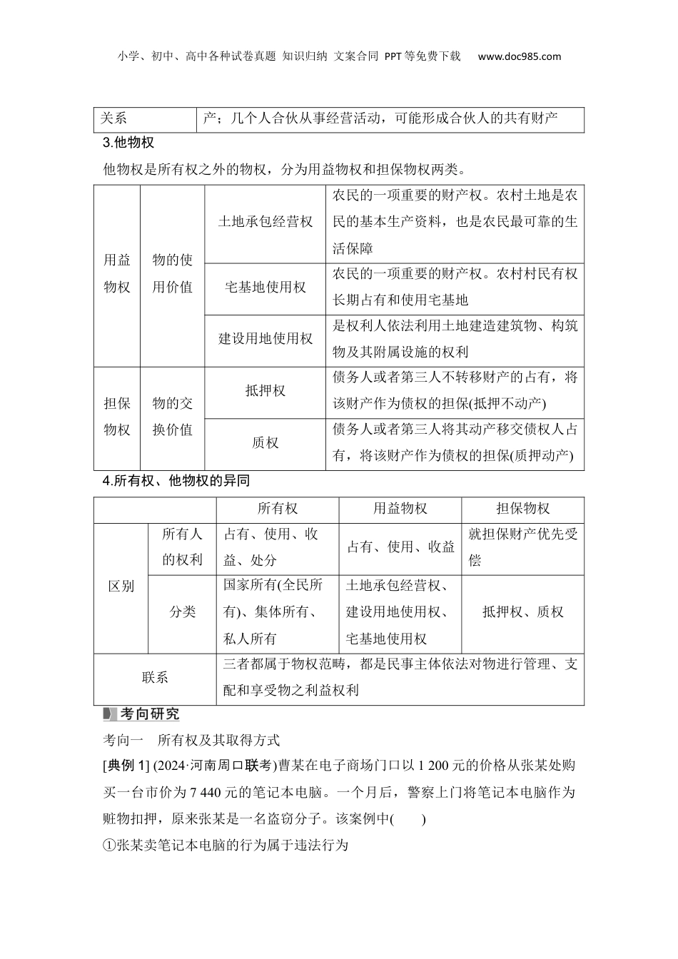 小学、初中、高中各种试卷真题知识归纳文案合同PPT等免费下载www.doc985.com第二课时依法有效保护财产权(含综合探究)课标要求列举物权法的基本原则和主要类型,懂得维护物权的主要途径。体系构建核心考点一保障各类物权1.财产权(1)意义①法律规定财产权,有利于确定财产归属,并以此促进财产的流通使用。②保护财产权就是保护劳动、保护发明创造、保护和发展生产力。③依法保护各种所有制经济组织和自然人的财产权,激励人们创业创新。④公有制经济财产权不可侵犯,非公有制经济财产权同样不可侵犯,这是平等保护基本原则的生动体现。⑤建设社会主义法治社会,需要把财产权保护法治化摆在突出位置,使财产权小学、初中、高中各种试卷真题知识归纳文案合同PPT等免费下载www.doc985.com保护在法治轨道上健康运行,使完善的财产权保护制度成为社会主义市场经济蓬勃发展的内生动力。(2)保护措施①国家通过不断完善财产制度,依法保护各种所有制经济组织和自然人的财产权。②我国宪法和法律明确规定,保护国有财产、集体财产和公民合法的私有财产。③宪法规定,社会主义的公共财产神圣不可侵犯。④依法保护公民的私有财产权和继承权。⑤国家为了公共利益的需要,依法对公民私有财产实行征收或征用并给予补偿。提醒物包括不。不是指不能移或者可移但移就动产与动产动产动虽动动会损害其价的物,一般指土地以及房屋、林木等地上定着物。是指不以值动产动产外的物。2.所有权含义权利人对自己的不动产或者动产,依法享有的占有、使用、收益和处分的权利分类国家所有(全民所有)、集体所有、私人所有保护民法典规定了物权平等保护原则。国家、集体、私人的物权和其他权利人的物权受法律平等保护,任何组织或者个人不得侵犯取得方式不动产不动产所有权的取得应当依照法律规定登记。对于房屋等不动产,除法律另有规定的情形外,必须到不动产登记机构办理登记,才能取得所有权动产①动产所有权的取得应当依照法律规定交付。一般来说,所有人按照转让财产所有权的意图,直接把财产交给对方占有,对方就取得了该财产的所有权②价值较大的动产,如机动车、航空器、船舶等,其产权的取得、变更,通常也需要依法办理产权登记。如果未经登记,不得对抗善意第三人所有权的共有多人对同一财产享有所有权。如夫妻共有财产、家庭共有财小学、初中、高中各种试卷真题知识归纳文案合同PPT等免费下载www.doc985.com关系产;几个人合伙从事经营活动,可能形成合伙人的共有财产3.他物权他物权是所有权之外的物权,分为用益物权和担保物权两类。用益物权物的使用价值土地承包经营权农民的一项重要的财产权。农村土地是农民的基本生产资料,也是农民最可靠的生活保障宅基地使用权农民的一项重要的财产权。农村村民有权长期占有和使用宅基地建设用地使用权是权利人依法利用土地建造建筑物、构筑物及其附属设施的权利担保物权物的交换价值抵押权债务人或者第三人不转移财产的占有,将该财产作为债权的担保(抵押不动产)质权债务人或者第三人将其动产移交债权人占有,将该财产作为债权的担保(质押动产)4.所有权、他物权的异同所有权用益物权担保物权区别所有人的权利占有、使用、收益、处分占有、使用、收益就担保财产优先受偿分类国家所有(全民所有)、集体所有、私人所有土地承包经营权、建设用地使用权、宅基地使用权抵押权、质权联系三者都属于物权范畴,都是民事主体依法对物进行管理、支配和享受物之利益权利考向一所有权及其取得方式[典例1](2024·河南周口考联)曹某在电子商场门口以1200元的价格从张某处购买一台市价为7440元的笔记本电脑。一个月后,警察上门将笔记本电脑作为赃物扣押,原来张某是一名盗窃分子。该案例中()①张某卖笔记本电脑的行为属于违法行为小学、初中、高中各种试卷真题知识归纳文案合同PPT等免费下载www.doc985.com②曹某买到的笔记本电脑属于善意取得③曹某对笔记本电脑进行动产登记就不会被扣押④警察追回笔记本电脑保护了失盗所有人的财产所有权A.①②B.①④C.②③D.③④答案B解析某非本所有人,其行于法行,警察追回张并该笔记电脑卖电脑为属违为失本,保了所有人的所有,盗笔记电脑...