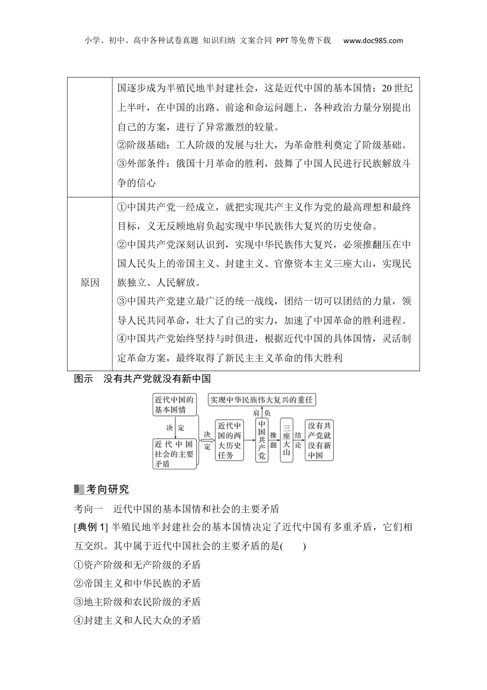 小学、初中、高中各种试卷真题知识归纳文案合同PPT等免费下载www.doc985.com第二课时历史和人民的选择(必修3第一课)课标要求引述宪法序言,说明没有共产党就没有新中国,阐明中国共产党成为执政党的必然性。体系构建核心考点一中华人民共和国成立前各种政治力量1.正确认识近代中国的基本国情、主要矛盾、历史任务项目内容联系近代中国的基本国情中国逐渐成为半殖民地半封建社会(1)近代以来的中国革命是在基本国情、主要矛盾及其激化的基础之上发生和发展起来的,针对近代中国的历史任务,中国人民以百折不挠的精神进行了可歌可泣的斗争。(2)近代中国的基本国情和主要矛盾决定了近代中国的两大历史任务近代中国的主要矛盾帝国主义和中华民族、封建主义和人民大众的矛盾近代中国的历史任务争取民族独立、人民解放,实现国家富强、人民幸福2.中国共产党能够领导中国革命取得胜利的条件和原因条件①历史条件:帝国主义的入侵,打断了中国社会发展的正常进程,中小学、初中、高中各种试卷真题知识归纳文案合同PPT等免费下载www.doc985.com国逐步成为半殖民地半封建社会,这是近代中国的基本国情;20世纪上半叶,在中国的出路、前途和命运问题上,各种政治力量分别提出自己的方案,进行了异常激烈的较量。②阶级基础:工人阶级的发展与壮大,为革命胜利奠定了阶级基础。③外部条件:俄国十月革命的胜利,鼓舞了中国人民进行民族解放斗争的信心原因①中国共产党一经成立,就把实现共产主义作为党的最高理想和最终目标,义无反顾地肩负起实现中华民族伟大复兴的历史使命。②中国共产党深刻认识到,实现中华民族伟大复兴,必须推翻压在中国人民头上的帝国主义、封建主义、官僚资本主义三座大山,实现民族独立、人民解放。③中国共产党建立最广泛的统一战线,团结一切可以团结的力量,领导人民共同革命,壮大了自己的实力,加速了中国革命的胜利进程。④中国共产党始终坚持与时俱进,根据近代中国的具体国情,灵活制定革命方案,最终取得了新民主主义革命的伟大胜利图示没有共产党就没有新中国考向一近代中国的基本国情和社会的主要矛盾[典例1]半殖民地半封建社会的基本国情决定了近代中国有多重矛盾,它们相互交织。其中属于近代中国社会的主要矛盾的是()①资产阶级和无产阶级的矛盾②帝国主义和中华民族的矛盾③地主阶级和农民阶级的矛盾④封建主义和人民大众的矛盾小学、初中、高中各种试卷真题知识归纳文案合同PPT等免费下载www.doc985.comA.①②B.①③C.②③D.②④答案D解析片后,着中社性的化,中社的主要矛盾由地主鸦战争随国会质变国会阶和民的矛盾,始帝主和中民族的矛盾、封建主和人级农阶级开转变为国义华义民大的矛盾,众②④正确,③排除。和无的矛盾是本主社资产阶级产阶级资义的主要矛盾,不是我近代社的主要矛盾,排除会国会①。考向二没有中国共产党就没有新中国[典例2](2023·安徽高三检测)为何中国的现代化成功于中国共产党领导的时期,而不是其他时期?唯一的解释是,只有在中国共产党的领导下,中国人民的历史创造方位得以正确认定,中国人民的历史创造性得到充分发挥。换句话说,在20世纪初诸多尝试解决中国问题的政治力量中,唯独中国共产党能够胜出。这是因为()①中国共产党一诞生就是最强大最坚强的组织②中国共产党能够广泛地发动和组织人民群众③中国共产党能够制定符合实际人民利益方案④中国共产党能够获得所有阶级和阶层的拥护A.①②B.①④C.②③D.③④答案C[解题能力培养]预测依托引文,考查中国社会的基本国情1.历史学家陈旭麓在他的《近代中国的新陈代谢》一书中写道:“对于中国人小学、初中、高中各种试卷真题知识归纳文案合同PPT等免费下载www.doc985.com来说,这场战争(鸦片战争)是一块界碑,它铭刻着中世纪古老的社会在炮口的逼迫下赶往近代的最初的一步。”认为“这场战争”是中国“赶往近代的最初的一步”的基本依据是()A.中国人民的历史任务发生转变B.国家主权和领土完整遭到破坏C.民族矛盾成为社会的主要矛盾D.中国社会的基本国情发生变化答案D解析依据意,材料中的指的是片。片以后,中始题战争鸦战争鸦战争国开从封建社逐步半殖民地半封建社,片...