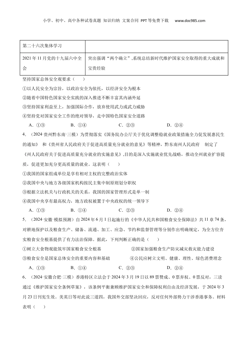 小学、初中、高中各种试卷真题知识归纳文案合同PPT等免费下载www.doc985.com模块五当代国际政治与经济最新模拟选择题50练AB卷A卷(1-25题)1.(2024·全国·二模)美国2024年总统大选已正式拉开序幕。美国公共事务研究中心近期的民调显示,87%的民主党人认为,如果特朗普在2024年当选美国总统,那么美国民主将被削弱;82%的共和党人对拜登胜选持同样看法。美国哈佛大学教授丹尼尔·齐布拉特表示,当任何一方都开始称对方是民主的威胁时,且不论实际情况如何,这都是美国民主“正在解体”的征兆。材料说明()A.联邦制的国家结构形式存在天然缺陷B.两党分别代表了不同阶级的利益C.美国的民主将不复存在D.美式民主是代表资产阶级的民主2.(2024·山东青岛·三模)当前,全球变暖在美国仍是一个有争议的话题。美国总统拜登在多个场合强调,气候变暖对美国国家安全构成严重威胁,但一些美国学者和拜登的政敌认为,所谓的“全球变暖”是一个弥天大谎,是骗局和阴谋。这种“阴谋论”受到美国化石能源集团、煤矿协会等机构拥护。对此理解正确的是()①利益集团通过获得执政权干预美国政治②对全球变暖的争议源自于利益冲突③气候之争体现了美国政治分权制衡的原则④美国政治党派在气候问题上存在不同的判断和选择A.①②B.②④C.①③D.③④3.(2024·河北承德·三模)2024年是习近平总书记提出总体国家安全观10周年。下表是总体国家安全观的发展历程。2014年4月中央国家安全委员会第一次会议首次提出总体国家安全观2017年10月党的十九大将坚持总体国家安全观纳入新时代坚持和发展中国特色社会主义的基本方略,并写入党章2020年10月党的十九届五中全会首次把统筹发展和安全纳入“十四五”时期我国经济社会发展的指导思想,历史性地用专章对铸牢国家安全屏障作出战略部署2020年12月十九届中央政治局阐明新时代国家安全工作的总体目标,提出“十个坚持”的工作要求小学、初中、高中各种试卷真题知识归纳文案合同PPT等免费下载www.doc985.com第二十六次集体学习2021年11月党的十九届六中全会突出强调“两个确立”,系统总结新时代维护国家安全取得的重大成就和宝贵经验坚持国家总体安全观要求()①以人民安全为宗旨,以政治安全为依托,以经济安全为根本②随着中国特色国家安全实践的深入推进不断丰富其内涵外延③坚持国家利益至上,加强国际合作,放弃使用武力或武力威胁④坚持党对国家安全工作的绝对领导,走中国特色国家安全道路A.①③B.①④C.②③D.②④4.(2024·贵州黔东南·三模)为贯彻落实《国务院办公厅关于优化调整稳就业政策措施全力促发展惠民生的通知》和《贵州省人民政府关于促进高质量充分就业的意见》等精神,黔东南州人民政府制定了《州人民政府关于促进高质量充分就业的实施意见》,目的是深入实施就业优先战略,推动全州就业扩容提质,促进更加充分更高质量的就业。这表明()①我国的国家组成单位是享有相对主权的完整政治实体②我国中央与地方各级国家机构按民主集中制原则划分职权③根据立法机关与行政机关的关系,我国的国家管理形式是单一制④我国中央享有最高权力,地方政权被置于中央政权的统一领导下A.①③B.①④C.②③D.②④5.(2024·安徽·模拟预测)自2024年6月1日起施行的《中华人民共和国粮食安全保障法》共11章74条,对耕地保护以及粮食生产、储备、流通、加工、应急、节约和监督管理等分别作出明确规定,为全方位夯实粮食安全根基提供了有力法治保障。据此,下列判断正确的是()①树立大食物观能筑牢国家粮食安全根基②国家加强粮食生产防灾减灾救灾能力建设③粮食安全是国家总体安全的重要内容和基础④公民应树立文明、健康、理性、绿色消费理念A.①③B.①④C.②③D.②④6.(2024·安徽合肥·三模)香港特区立法会于2024年3月19日以89票赞成、0票弃权、0票反对,三读通过《维护国家安全条例草案》,该条例平衡兼顾维护国家安全和保障权利自由及经济发展,于2024年3月23日刊宪生效。美英日等对此说三道四,我国外交部坚决回应,反对任何外部势力干涉香港事务。材料表明()小学、初中、高中各种试卷真题知识归纳文案合同PPT等...