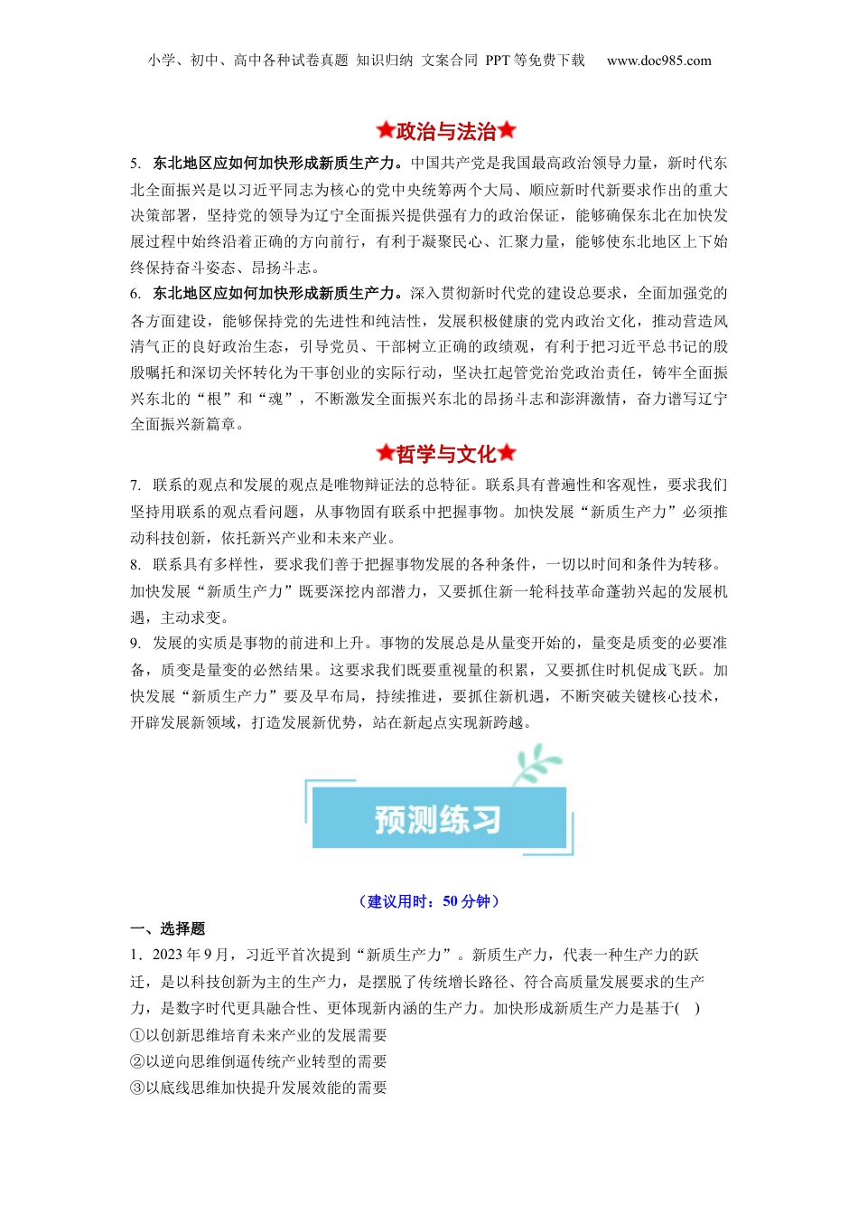 小学、初中、高中各种试卷真题知识归纳文案合同PPT等免费下载www.doc985.com热点07新质生产力全球正在经历一场更大范围、更深层次的科技革命和产业变革。人工智能、量子信息、合成生物学等前沿成果、技术突破正在重构全球创新版图、重塑全球经济结构。推动高质量发展,迫切需要整合科技创新资源,引领发展战略性新兴产业和未来产业,加快形成新质生产力。习近平总书记在2023年9月黑龙江考察调研期间,提到一个令人耳目一新的词汇——“新质生产力”。习近平总书记指出,整合科技创新资源,引领发展战略性新兴产业和未来产业,加快形成新质生产力。新质生产力就是在当代科技进步条件下新兴产业特别是战略性新兴产业、未来产业所产生的具有新的性质、新的属性的利用自然、改造自然的能力,它既有已经成为战略性新兴产业生长出的新枝,也有未来产业萌发的新芽,是经济发展的新动能。新质生产力是以科技创新为主导、实现关键性颠覆性技术突破而产生的生产力。无论小学、初中、高中各种试卷真题知识归纳文案合同PPT等免费下载www.doc985.com是当前提振信心,推动经济回升向好,还是在未来发展和国际竞争中赢得战略主动,都必须加快实现高水平科技自立自强,加快形成新质生产力。形成新质生产力的核心是创新,载体是产业。新时代以来,我国高度重视战略性新兴产业的培育,释放出强劲生产动能。目前,我国新能源汽车生产累计突破2000万辆,工业机器人新增装机总量全球占比超50%,第一批国家级战略性新兴产业集群已达到66家,人工智能核心产业规模达到5000亿元,企业数量近4000家,彰显出产业基础好、市场需求大的独特优势。新质生产力是实现中国式现代化的重要基础,中国式现代化又需要一代又一代理想远大、信念坚定的中国人辛勤付出和艰苦努力。当代中国青年是与新时代同向同行、共同前进的一代,个性更加鲜明、思维更加活跃、视野更加广阔。作为主要亲历者、参与者、见证者,青年如何理解、看待新质生产力,如何助力新质生产力的发展,影响着中国式现代化目标的实现程度和进度。加快形成新质生产力,关键在培育形成新产业。转变发展方式、突破发展瓶颈制约、做强做优实体经济,迫切需要以新质生产力带动产业转型升级。近年来,我国在新能源、新材料、先进制造、电子信息、生物医药等产业领域取得重要进展,对经济社会发展的引领带动作用日益彰显。同时,以类脑智能、量子信息、基因技术、深海空天开发为代表的未来产业,也正在实现技术与产业的深度融合,有望成长为未来的新兴产业。中国特色社会主义1.青年一代有理想、有担当,国家就有前途,民族就有希望,实现我们的发展目标就有源源不断的强大力量。在新时代的成长道路上我们坚定党的领导,在党的带领下,青年的我们,不负韶华,不负时代,以青春助力国家发展。新时代青年以青春助力新质生产力发展。经济与社会2.坚持创新理念(或创新是第一动力),促进数字技术与实体经济深度融合,实现关键核心技术自主可控、安全可靠。3.发挥战略性新兴产业的增长引擎作用,推动传统产业转型升级,建设创新引领、协同发展的现代化产业体系,塑造中国经济发展的新优势。3.加快形成新质生产力有利于提高我国的自主创新能力,推动经济高质量发展。4.要巩固社会主义制度,要说服广大群众相信社会主义优越性,必须努力把经济搞上去,以比资本主义国家更快的速度发展,逐步缩小同发达资本主义国家的差距。小学、初中、高中各种试卷真题知识归纳文案合同PPT等免费下载www.doc985.com政治与法治5.东北地区应如何加快形成新质生产力。中国共产党是我国最高政治领导力量,新时代东北全面振兴是以习近平同志为核心的党中央统筹两个大局、顺应新时代新要求作出的重大决策部署,坚持党的领导为辽宁全面振兴提供强有力的政治保证,能够确保东北在加快发展过程中始终沿着正确的方向前行,有利于凝聚民心、汇聚力量,能够使东北地区上下始终保持奋斗姿态、昂扬斗志。6.东北地区应如何加快形成新质生产力。深入贯彻新时代党的建设总要求,全面加强党的各方面建设,能够保持党的先进性和纯洁性,发展积极健康的党内政治文化,推动营造风清气正的良好政治生态,引导党...