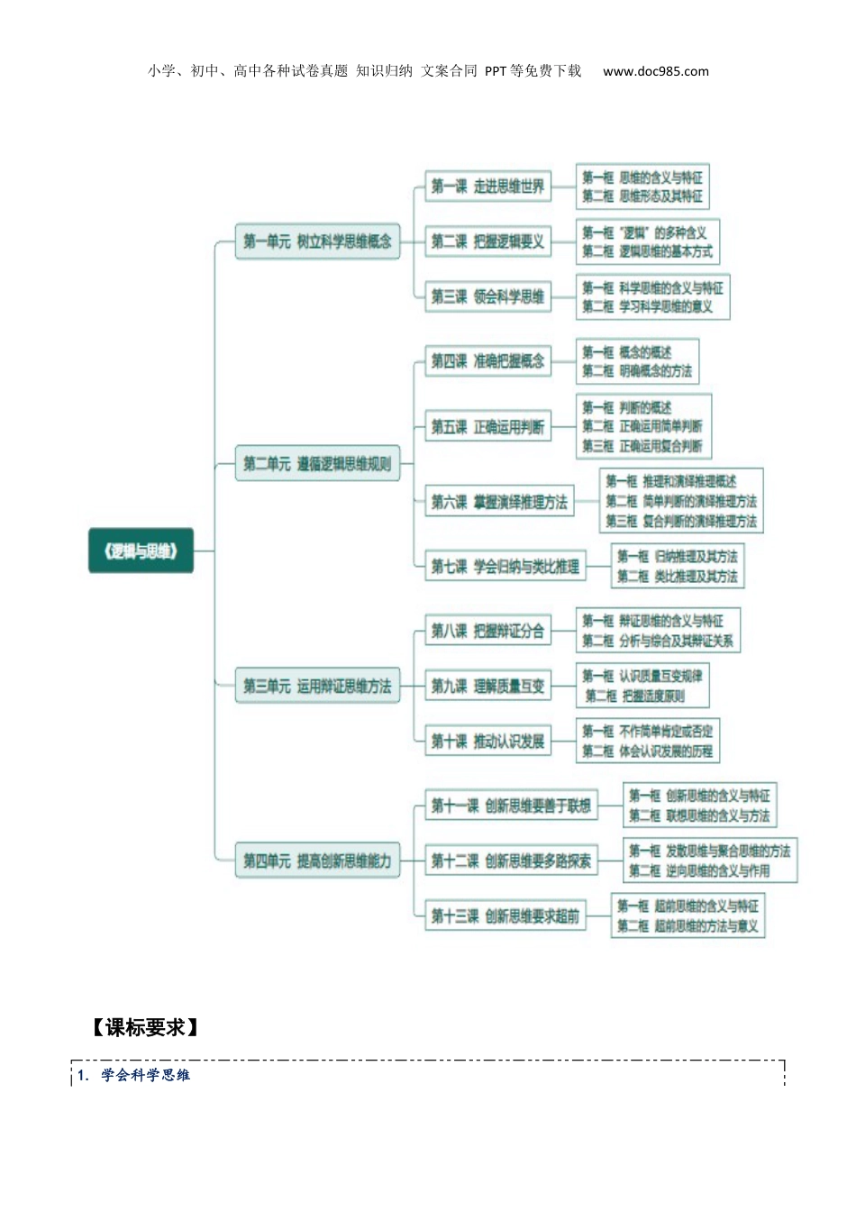 小学、初中、高中各种试卷真题知识归纳文案合同PPT等免费下载www.doc985.com选择性必修三《逻辑与思维》知识清单目录第一单元:树立科学思维观念第一课:走进思维世界...................................................................................5第二课:把握逻辑要义.................................................................................10第三课:领会科学思维.................................................................................15第二单元:遵循逻辑思维规则第四课:准确把握概念.................................................................................19第五课:正确运用判断.................................................................................25第六课:掌握演绎推理方法.........................................................................35第七课:学会归纳与类比推理.....................................................................47第三单元:运用辩证思维方法第八课:把握辩证分合.................................................................................56第九课:理解质量互变.................................................................................63第十课:推动认识发展...............................................................................68第四单元:提高创新思维能力第十一课:创新思维要善于联想.................................................................75第十二课:创新思维要多路探索.................................................................80小学、初中、高中各种试卷真题知识归纳文案合同PPT等免费下载www.doc985.com第十三课:创新思维要力求超前.................................................................87选择性必修三《逻辑与思维》知识清单小学、初中、高中各种试卷真题知识归纳文案合同PPT等免费下载www.doc985.com【课标要求】1.学会科学思维小学、初中、高中各种试卷真题知识归纳文案合同PPT等免费下载www.doc985.com1.1描述常见的思维活动,体会思维是人所特有的属性,了解思维的基本形态和特征;懂得正确思维的基本条件。1.2区分抽象思维和形象思维;掌握科学思维的特点,体悟学会科学思维的意义。2.遵循逻辑思维要求2.1知道概念是反映事物本质属性的思维形式;理解任何概念都是内涵和外延的统一。2.2知道判断的基本特征;了解形成恰当判断的条件;学会正确运用判断;结合具体的判断活动,区分判断的不同类型。2.3了解推理的类型;掌握演绎推理的方法;学会归纳推理、类比推理;评析常见的推理错误。2.4辨析常见的逻辑错误,掌握形式逻辑的三个基本规律。3.运用辩证思维方法3.1结合对复杂事物的把握,体会辩证思维的特征;理解分析与综合的辩证关系。3.2联系事物发展过程中的渐进性和飞跃性,懂得事物的发展过程是量变与质变的统一;理解质量互变规律;把握适度原则。3.3辨析简单肯定一切或否定一切的危害,解析认识经由“感性具体—思维抽象—思维具体”的途径;了解辩证否定观的实质;体会认识不断深化的历程。4.提高创新思维能力4.1体会联想思维中迁移、想象的运用;了解联想思维的方法和特点;知道迁移、想象在创新思维中的作用。4.2了解发散思维中所采取的推测等方法;概括发散思维的特点;知道聚合思维和发散思维的功能。4.3分析逆向思维的依据和优势;发挥正向思维和逆向思维的互补作用。4.4体会超前思维是对常识局限性的突破和超越;把握超前思维的探索性、预测性特点;了解创造性预测事物发展态势的意义。【复习要求】通过通过本模块的学习,学生能够经历探究过程,明确科学思维的重要意义;学会遵循逻辑思维的规律;把握辩证思维的方法;提高创新思维的能力;提升自己的思维品质;正确运用科学思维方法观察和理解社会,处理学习和生活中遇到的问题。【核心问题】一、要解决的核心问题:在科学思维观念(三律:同一律、矛盾律、排中律)的统摄下,把我逻辑思维...