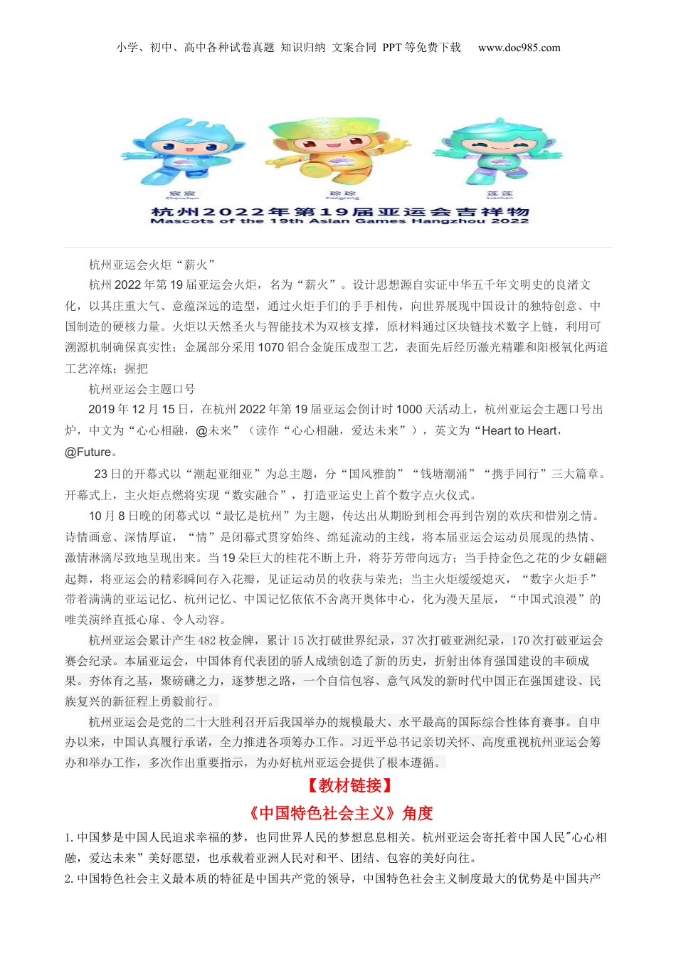 小学、初中、高中各种试卷真题知识归纳文案合同PPT等免费下载www.doc985.com专题4:杭州亚运会【热点背景】杭州第19届亚运会(The19thAsianGames)又称“杭州2022年第19届亚运会”,是亚洲最高规格的国际综合性体育赛事。亚运会原定于2022年9月10日至25日在浙江杭州举办,2022年7月19日亚洲奥林匹克理事会宣布赛事定于2023年9月23日至10月8日举办,赛事名称和标志保持不变。杭州第19届亚运会竞赛项目设置为:40个大项,61个分项,481个小项。40个竞赛大项包括31个奥运项目和9个非奥运项目,同时,在保持40个大项目不变的前提下,增设电子竞技、霹雳舞两个竞赛项目。杭州亚运会将诞生481块金牌。杭州第19届亚运会以“中国新时代·杭州新亚运”为定位、“中国特色、亚洲风采、精彩纷呈”为目标,秉持“绿色、智能、节俭、文明”的办会理念,坚持“杭州为主、全省共享”的办赛原则。杭州亚运会会徽杭州2022年第19届亚运会会徽"潮涌"的主体图形由扇面、钱塘江、钱江潮头、赛道、互联网符号及象征亚奥理事会的太阳图形六个元素组成,下方是主办城市名称与举办年份的印鉴,两者共同构成了完整的杭州亚运会会徽。扇面造型反映江南人文意蕴,赛道代表体育竞技,互联网符号契合杭州城市特色,太阳图形是亚奥理事会的象征符号。钱塘江和钱江潮头是会徽的形象核心,绿水青山展示了浙江杭州山水城市的自然特征,江潮奔涌表达了浙江儿女勇立潮头的精神气质,整个会徽形象象征着新时代中国特色社会主义大潮的涌动和发展,也象征亚奥理事会大家庭团结携手,紧密相拥,永远向前。吉祥物杭州亚运会吉祥物是一组名为“江南忆”的机器人。三个吉祥物分别取名“琮琮”、“莲莲”、“宸宸”。“琮琮”以机器人的造型代表世界遗产良渚古城遗址,名字源于良渚古城遗址出土的代表性文物玉琮。“莲莲”以机器人的造型代表世界遗产西湖,名字源于西湖中无穷碧色的接天莲叶。“宸宸”以机器人的造型代表世界遗产京杭大运河,名字源于京杭大运河杭州段的标志性建筑拱宸桥。小学、初中、高中各种试卷真题知识归纳文案合同PPT等免费下载www.doc985.com杭州亚运会火炬“薪火”杭州2022年第19届亚运会火炬,名为“薪火”。设计思想源自实证中华五千年文明史的良渚文化,以其庄重大气、意蕴深远的造型,通过火炬手们的手手相传,向世界展现中国设计的独特创意、中国制造的硬核力量。火炬以天然圣火与智能技术为双核支撑,原材料通过区块链技术数字上链,利用可溯源机制确保真实性;金属部分采用1070铝合金旋压成型工艺,表面先后经历激光精雕和阳极氧化两道工艺淬炼;握把杭州亚运会主题口号2019年12月15日,在杭州2022年第19届亚运会倒计时1000天活动上,杭州亚运会主题口号出炉,中文为“心心相融,@未来”(读作“心心相融,爱达未来”),英文为“HearttoHeart,@Future。23日的开幕式以“潮起亚细亚”为总主题,分“国风雅韵”“钱塘潮涌”“携手同行”三大篇章。开幕式上,主火炬点燃将实现“数实融合”,打造亚运史上首个数字点火仪式。10月8日晚的闭幕式以“最忆是杭州”为主题,传达出从期盼到相会再到告别的欢庆和惜别之情。诗情画意、深情厚谊,“情”是闭幕式贯穿始终、绵延流动的主线,将本届亚运会运动员展现的热情、激情淋漓尽致地呈现出来。当19朵巨大的桂花不断上升,将芬芳带向远方;当手持金色之花的少女翩翩起舞,将亚运会的精彩瞬间存入花瓣,见证运动员的收获与荣光;当主火炬缓缓熄灭,“数字火炬手”带着满满的亚运记忆、杭州记忆、中国记忆依依不舍离开奥体中心,化为漫天星辰,“中国式浪漫”的唯美演绎直抵心扉、令人动容。杭州亚运会累计产生482枚金牌,累计15次打破世界纪录,37次打破亚洲纪录,170次打破亚运会赛会纪录。本届亚运会,中国体育代表团的骄人成绩创造了新的历史,折射出体育强国建设的丰硕成果。夯体育之基,聚磅礴之力,逐梦想之路,一个自信包容、意气风发的新时代中国正在强国建设、民族复兴的新征程上勇毅前行。杭州亚运会是党的二十大胜利召开后我国举办的规模最大、水平最高的国际综合性体育赛事。自申办以来,中国认真履行承诺,全力推进各项筹办工作。习近平总书...