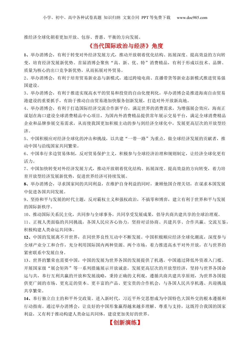 小学、初中、高中各种试卷真题知识归纳文案合同PPT等免费下载www.doc985.com专题2:第三届中国国际消费品博览会【热点背景】以“共享开放机遇,共创美好生活”为主题的第三届中国国际消费品博览会是商务部和海南省人民政府主办的博览会,将于2023年4月11日至15日在海南省海口市举办,4月10日举行开幕式等活动。本届消博会展览总面积10万平方米,其中,国际展区8万平方米,国内展区2万平方米。意大利将担任本届消博会主宾国。第三届消博会各项筹备工作进展顺利,全球招展工作基本完成。本届消博会展览总面积10万平方米,其中,国际展区8万平方米,国内展区2万平方米。第三届消博会于2023年4月11日至15日在海南省海口市举办,4月10日举行开幕式等活动。展会同期,“第三届中国国际消费品博览会游艇展暨中国(海口)国际船艇及生活方式展”也将于4月12日在海口市国家帆船基地公共码头盛大开幕。2023年3月6日,消博会组委会公布第三届消博会“全球消费论坛”首批活动,共涉及10项活动。2023年3月19日,第三届中国国际消费品博览会“全球消费论坛”第二批活动公布,包括论坛、推介会等11项活动将在消博会期间举行。2023年3月21日,第三届中国国际消费品博览会首批展品顺利入境通关后抵达展会现场海南国际会展中心,共计37件,货值14.9万美元,包括服装、首饰、家具等品类。2023年3月21日,第三届中国国际消费品博览会全球战略合作伙伴签约仪式在海口举行,交通银行与海南国际经济发展局签署《中国国际消费品博览会战略合作协议》,正式成为“第三届消博会全球战略合作伙伴”。[3]2023年3月22日,第三届消博会正式接受非团组(社会)专业观众报名,报名可点击消博会官方微信公众号菜单栏进行注册,本届消博会非团组专业观众证件首批限量3000张,收费标准200元/张。后期,消博会组委会秘书处将根据展馆容量和相关要求决定是否启动第二批报名。第三届中国国际消费品博览会将于2023年4月11日至15日在海南省海口市举行,其中4月14日和15日设为社会公众开放日,将向社会公开发售门票10万张。小学、初中、高中各种试卷真题知识归纳文案合同PPT等免费下载www.doc985.com本届消博会是我国疫情防控平稳转段后举办的首场重大国际性展会,将汇聚全球头部品牌和专业采购商,聚焦全球消费精品和首发首秀新品,打造推动高水平对外开放、促进内外市场相通、畅通国内国际双循环、促进消费升级和消费回流、引领消费时尚的全球消费精品展示交易平台。【教材链接】《中国特色社会主义》角度1、改革开放是党和人民大踏步赶上时代的重要法宝,是坚持和发展中国特色社会主义的必要之路,是决定当代中国命运的关键一招,也是决定实现‘两个一百年’奋斗目标、实现中华民族伟大复兴的关键一招。2、中华民族奏响全面深化改革开放的激扬乐章,党和国家事业焕发出新的生机活力,改革开放极大改变了中国的面貌,中华民族迎来了从富起来到强起来的伟大飞跃,中国特色社会主义迎来了从发展到完善的伟大飞跃。3、实践发展永无止境,解放思想永无止境,停顿和倒退没有出路。对外开放是中国的基本国策。当今世界是开放的世界,开放带来进步,封闭必然落后。改革开放只有进行时,没有完成是,改革开放永无止境。《经济与社会》角度1、坚持开放发展,要顺应我国经济深度融入世界经济的趋势,奉行互利共赢的开放战略,遵循共商共建共享原则,发展更高层次的开放型经济。2、中国的发展为世界各国的发展提供了机遇。中国经济快速增长为世界各国提供了更广阔的市场、更充足的资本、更丰富的产品、更宝贵的合作机会,为全球经济的稳定和增长提供了持续强大的推动力。3、打造推动高水平对外开放、促进内外市场相通、畅通国内国际双循环、促进消费升级和消费回流、引领消费时尚的全球消费精品展示交易平台,有利于建设多元平衡、安全高效的全面开放体系,发展更高层次开放型经济,推动开放朝着优化结构、拓展深度、提高效益方向转変,加快构建以国内大循环为主体、国内国际双循环相互促进的新发展格局。4、举办消博会,有利于充分利用国际国内两个市场,两种资源,进一步推动我国全方位,宽领域,多层次的对外开放格局和开放型经济体...