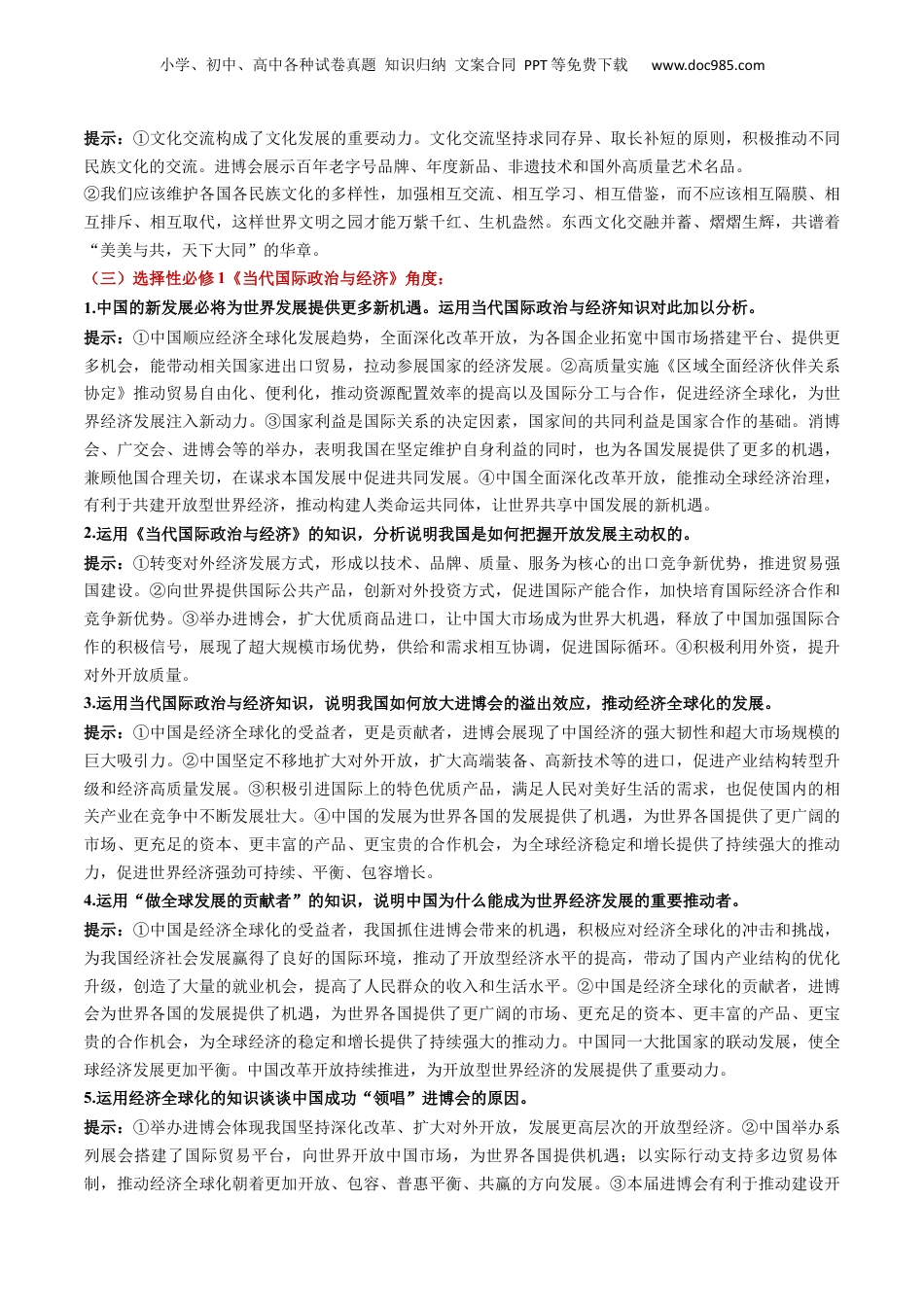 小学、初中、高中各种试卷真题知识归纳文案合同PPT等免费下载www.doc985.com2023年11月时政热点解读与专项训练第六届中国国际进口博览会第六届中国国际进口博览会于2023年11月5日至10日在国家会展中心(上海)举行,主题为“新时代共享未来”。企业商业展继续设置食品及农产品、汽车、技术装备、消费品、医疗器械及医药保健、服务贸易六大展区,将持续优化企业展板块专区划分,加大专业观众邀请力度,策划全年专业活动,不断增强广大展客商的获得感。第六届中国国际进口博览会于11月5日至10日在上海举行。国家综合展是进博会的重要组成部分,今年进博会国家展全面恢复线下举办,其中中国馆规模为历届之最。目前,国家展展馆内各展台布置已基本完成,各参展国也是对本届进博会充满了期待。第六届进博会共有69个国家和3个国际组织亮相国家展,涵盖发达国家、发展中国家和最不发达国家,共有64个共建“一带一路”国家。参展国中既有多次参展的“老朋友”,也有11个首次参加国家展的“新面孔”,还有34个国家为首次线下参展。今年将通过现场展示、互动体验等多种方式,近距离展现各国科技创新、优势产业、投资环境等领域精彩内容。链接教材(一)必修2《经济与生活》角度:1.运用《经济与社会》的知识,从“有效市场和有为政府”角度,分析我们如何将进博会越办越好,向世界传递开放强音。提示:①完善市场体系,充分发挥市场在资源配置中的决定性作用,中国主动向世界开放市场。②遵循经济发展规律,面向市场需求,积极参与经济全球化,推动中国与世界市场相遇。③我国政府加强宏观调控,实施加速审评、审批的政策等各项政策,打造一流营商环境,为进博会越办越好提供制度保障,使进博会越办越好。④我国坚持互利共赢的开放战略,举办高水平的进口博览会,促进我国经济高水平开放发展,促进开放型世界经济的共同发展,使进口博览会越办越好。2.运用“推动高质量发展”的知识,分析中国举办进口博览会的意义。提示:①中国通过举办进博会,扩大开放,有利于建设高水平开放型经济新体制,推动开放朝着优化结构、拓展深度、提高效益方向转变,推动我国经济高质量发展。②通过举办进博会,让各国共享到更多市场机遇,有利于推动经济全球化朝着更加开放、包容、普惠、平衡、共赢的方向发展。③有利于加快构建以国内大循环为主体,国内国际双循环相互促进的新发展格局,增强国内国际两个市场、两种资源的联动效应。(二)必修4《哲学与文化》角度:1.有人感叹:举办“进博会”,发挥着汇聚全球开放合作的蓬勃力量,运用“联系的多样性”分析该观点的合理性。提示:事物的联系是多种多样的,我们要善于分析和把握事物存在和发展的各种条件,一切以时间、地点、条件为转移。单边主义、贸易保护主义抬头、逆全球化暗流涌动,需要各国重视不利条件,加强开放合作,共同推动国际经贸发展。中国举办“进博会”,发挥着汇聚全球开放合作的蓬勃力量,既发展了自己,也有利于推动经济全球化,造福世界。2.进博会是文化、精神的交汇之窗。谈谈应如何进行文化交流。小学、初中、高中各种试卷真题知识归纳文案合同PPT等免费下载www.doc985.com提示:①文化交流构成了文化发展的重要动力。文化交流坚持求同存异、取长补短的原则,积极推动不同民族文化的交流。进博会展示百年老字号品牌、年度新品、非遗技术和国外高质量艺术名品。②我们应该维护各国各民族文化的多样性,加强相互交流、相互学习、相互借鉴,而不应该相互隔膜、相互排斥、相互取代,这样世界文明之园才能万紫千红、生机盎然。东西文化交融并蓄、熠熠生辉,共谱着“美美与共,天下大同”的华章。(三)选择性必修1《当代国际政治与经济》角度:1.中国的新发展必将为世界发展提供更多新机遇。运用当代国际政治与经济知识对此加以分析。提示:①中国顺应经济全球化发展趋势,全面深化改革开放,为各国企业拓宽中国市场搭建平台、提供更多机会,能带动相关国家进出口贸易,拉动参展国家的经济发展。②高质量实施《区域全面经济伙伴关系协定》推动贸易自由化、便利化,推动资源配置效率的提高以及国际分工与合作,促进经济全球化,为世界经济发...