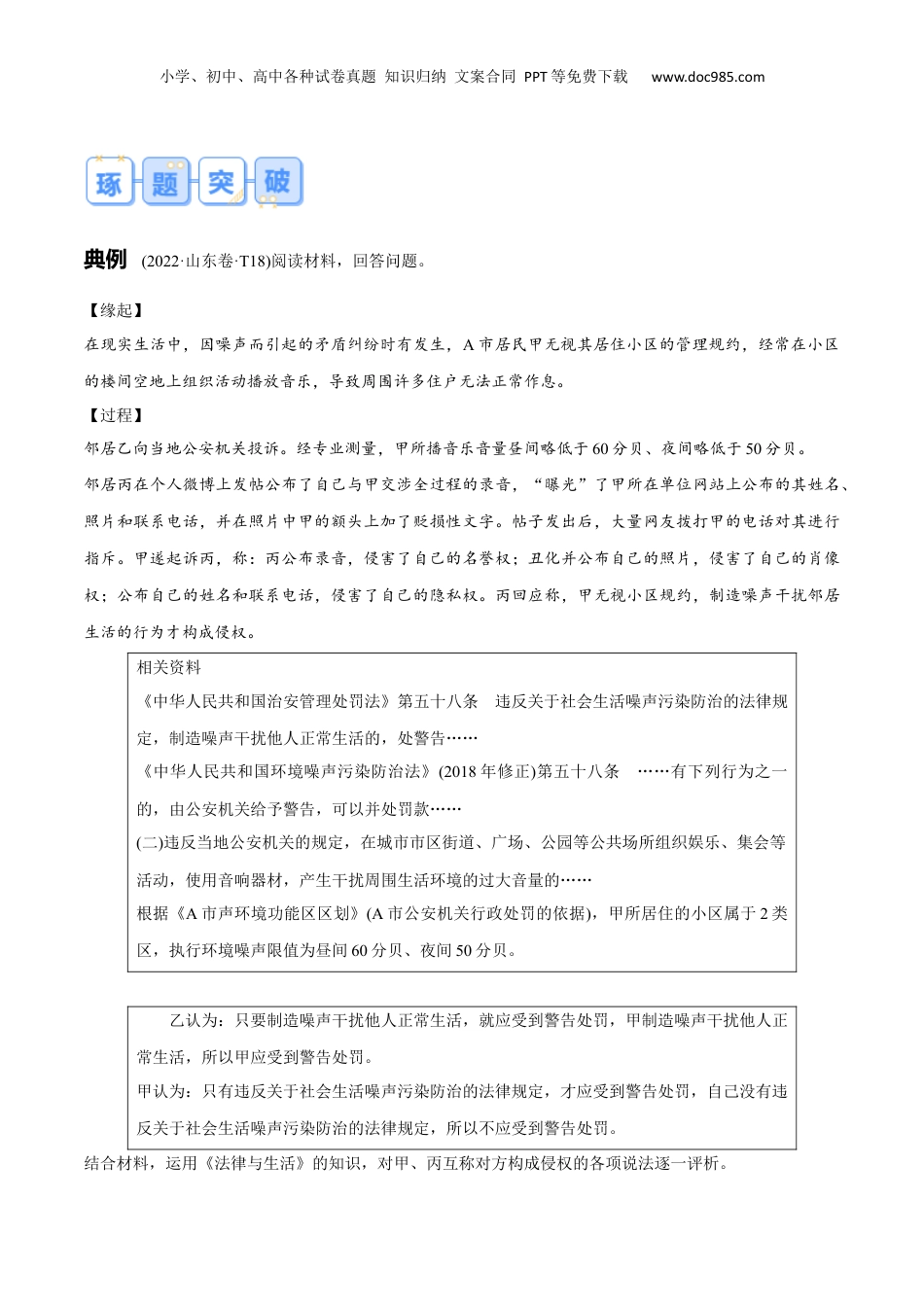 小学、初中、高中各种试卷真题知识归纳文案合同PPT等免费下载www.doc985.com专题04评析类主观题题型特点:辨析评析类试题是近年来各地高考常见的一种试题,它常以事件为背景,要求考生就背景材料中的现象、事件或观点谈谈自己的看法、认识,或者要求考生对事件中涉及的各种行为或观点进行评析或者分析其合理性。它要求学生对试题有辨有析,辨析结合,或有辨有评,辨评结合。一、解题思路1.解答的基本过程大致分三步:找准是非、分析是非、总结是非找准是非就是对观点进行逐词、逐句的全面分析,通过分解,找出其中的合理或正确之处、不合理或错误之处分析是非就是调动符合要求的理论知识,对各个辨析点正确或错误的原因进行分析,做到“有是说是,有非说非”总结是非就是综合前面的评析或辨析,或者对观点的正误下好结论,或者阐明应该树立的正确认识、采取的正确措施等2.辨析题大致分三类题型:单向型辨析题题目中一种观点本身是一个无可争议的客观事实或是公认的真理,即观点完全正确;另一种观点与客观规律或事实完全背道而驰,即观点完全错误。观点完全正确的题目解题步骤是首先说明观点正确或科学性理由,接着得出结论;观点完全错误的题目解题步骤是首先说明观点不科学之处的理由和原因,然后提出正确的观点正误混合型辨析题题目中的观点既包含合理的部分也包含不合理的因素。在做这类辨析题的时候不能笼统地对题中的观点作出正确或错误的简单判断,以免犯以偏概全的错误。将所给的观点划分出不同的层次,找出辨点条件残缺型辨析题题目中的观点是正确的,但不全面,需要补充内容或其他的理由。这类观点的逻辑是,结论要成立必须要由试题中所给的这个前提作依据,因为这个前提本身是没有错误的。而存在的缺陷是没有看到结论要成立还需要其他的条件三、失分警示解答辨析题常见的问题如下,应引起高度重视。第一,审题能力不强,对辨题中隐含的辨析点把握不全、不准,造成漏辨、错辨。第二,缺少辩证思想,对题中观点不能作一分为二的分析,对合理因素不能进行充分肯定,对不合理因素不能从多角度进行剖析,把辨析题简单地做成了是非判断题。第三,逻辑关系混乱、分不清充分条件和必要条件。混淆必要条件和充分条件,是近年高考辨析题的一个热点走向。第四,解题环节不全,忽视对辨题进行小结。一些学生做辨析题,能够对题中观点进行肯定或否定的判断及分析,但常常忽视联系实际给出恰当小结,或提供解决方法,或明确事件性质。小学、初中、高中各种试卷真题知识归纳文案合同PPT等免费下载www.doc985.com典例(2022·山东卷·T18)阅读材料,回答问题。【缘起】在现实生活中,因噪声而引起的矛盾纠纷时有发生,A市居民甲无视其居住小区的管理规约,经常在小区的楼间空地上组织活动播放音乐,导致周围许多住户无法正常作息。【过程】邻居乙向当地公安机关投诉。经专业测量,甲所播音乐音量昼间略低于60分贝、夜间略低于50分贝。邻居丙在个人微博上发帖公布了自己与甲交涉全过程的录音,“曝光”了甲所在单位网站上公布的其姓名、照片和联系电话,并在照片中甲的额头上加了贬损性文字。帖子发出后,大量网友拨打甲的电话对其进行指斥。甲遂起诉丙,称:丙公布录音,侵害了自己的名誉权;丑化并公布自己的照片,侵害了自己的肖像权;公布自己的姓名和联系电话,侵害了自己的隐私权。丙回应称,甲无视小区规约,制造噪声干扰邻居生活的行为才构成侵权。相关资料《中华人民共和国治安管理处罚法》第五十八条违反关于社会生活噪声污染防治的法律规定,制造噪声干扰他人正常生活的,处警告……《中华人民共和国环境噪声污染防治法》(2018年修正)第五十八条……有下列行为之一的,由公安机关给予警告,可以并处罚款……(二)违反当地公安机关的规定,在城市市区街道、广场、公园等公共场所组织娱乐、集会等活动,使用音响器材,产生干扰周围生活环境的过大音量的……根据《A市声环境功能区区划》(A市公安机关行政处罚的依据),甲所居住的小区属于2类区,执行环境噪声限值为昼间60分贝、夜间50分贝。乙认为:只要制造噪声干扰他人正常生活,就应受到警告处罚,甲制造噪声干扰他人正常生活...