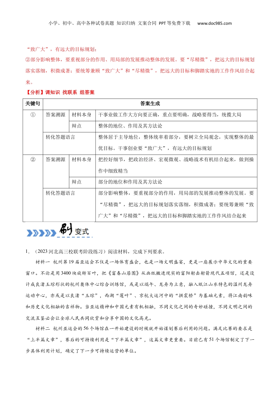 小学、初中、高中各种试卷真题知识归纳文案合同PPT等免费下载www.doc985.com专题02体现、说明类主观题[题型特点]此类试题一般结合国家重大时事、社会热点或生活焦点等构建试题情境,要求考生概括经济、政治、文化等现象,分析材料信息与教材知识的一致性。[设问形式]设问呈现形式一般有两种显性设间"运用……知识对……加以说明”“分析材料体现(蕴含)了什么道理”“材料是如何体现…”等;隐性设问—“结合材料,谈谈你对……的理解(认识)”“结合材料,谈谈和…的共同点”等。[模型解法]第一步,审设问确定知识范围:①设问限定知识具体明确,可直接构建知识模型;②设问知识限定比较笼统,可结合具体情境锁定具体知识范围(构建知识模型)或把设问分解为几个要点逐层分析。第二步,锁定材料关键信息如果已构建知识模型:针对每个知识点,在材料中依次筛选与之相对应的关键信息;如果未构建知识模型:①划分材料层次,提炼其主旨:②根据每层材料的主旨,筛选限定范围内的知识点。第三步,列出要点,组织答案按照“原理(知识点)+材料(关键信息)”的格式组织答案方法。具体的解题思路是:定点—拆分—联系—梳理作答。定点确定材料考查的知识点是什么。比如,材料是如何体现政府职能的?应确定的观点原理就是“政府职能”拆分将对应的原理进行分解。如政府的基本职能有五个方面联系联系所给材料与所学知识梳理作答将材料所给的信息与考核的知识点一一对照,二者相符的就是要点,作答时要做到观点和材料相结合这类试题答案的每个要点应包含两部分内容:一是材料,要对材料加以概括,而不能一味地抄材料;二是理论,实现材料与理论的有机对接。小学、初中、高中各种试卷真题知识归纳文案合同PPT等免费下载www.doc985.com类型一演绎体现(说明)类此类试题限定的知识点比较具体,即材料指向某一具体的知识或原理,或者用具体某一知识或原理分析材料做法的合理性。因而应先分解知识,然后对应材料,即采取知识演绎论证材料的策略第一步把设问限定或蕴含的某一知识或一般理论(大前提)分解为几个具体要点(小前提);第二步针对每个具体要点,在材料中寻找、筛选与每个具体要点(小前提)相对应的关键信息,无关键信息与之对应的具体要点可舍去;第三步将材料和观点相结合组织答案。类型二归纳体现(说明)类此类试题限定的知识范围比较宽泛,即材料蕴含的知识多样化,没有具体指向某一知识范围,因而不宜先分解知识,而应先分解材料,即采取从具体材料知识推导出一般理论的策略第一步在确定宏观知识范围的前提下,划分材料层次(特别关注关键词),提炼每一层次材料的主旨;第二步根据每层材料的主旨,推导限定范围的知识具体要点(宏观知识范围的具体原理内容);第三步将材料和观点依次相结合组织答案。典例(2022山东统考高考真题)真理的力量。◆守正创新。“致广大而尽精微”出自中国古代经典《中庸》,讲的是顺应大本达道、尽心勉力笃行方能化育成事。“‘致广大而尽精微’是成事之道。”2021年12月8日,在中央经济工作会议上,习近平强调了工作的方法论:“干事业做工作大方向要正确,重点要明确,战略要得当,同时要把控好细节,把政治经济、宏观微观、战略战术有机结合起来,做到谋划时统揽大局、操作中细致精当”。在2022年新年贺词中,习近平再次为我们未来干事创业指明了方法路径,要求我们“致广大而尽精微”。(2)结合材料,运用整体和部分的知识,分析说明“致广大而尽精微”这句古语对新时代青年干事创业的启示。【答案】①整体居于主导地位,整体统率着部分,要树立全局意识,实现整体的最优目标;干事创业要小学、初中、高中各种试卷真题知识归纳文案合同PPT等免费下载www.doc985.com“致广大”,有远大的目标规划;②部分影响整体,要重视部分的作用、用局部的发展推动整体的发展。要“尽精微”,把远大的目标规划落实落细,积微成著;要统筹兼顾“致广大”和“尽精微”,把远大的目标和脚踏实地的工作作风结合起来。【分析】调知识找联系组答案关键句答案生成①答案溯源材料本身干事业做工作大方向要正确,重点要明确,战略要得当,统揽大局辩点整体的地位、作用及其方法论转化答题...