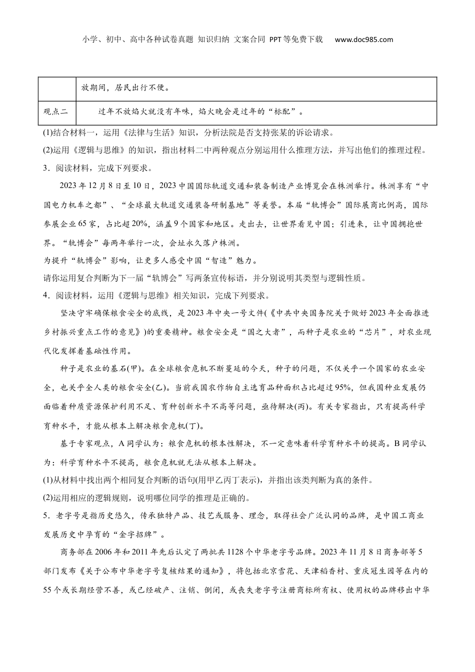 小学、初中、高中各种试卷真题知识归纳文案合同PPT等免费下载www.doc985.com选择性必修3《逻辑与思维》主观题1.阅读材料,完成下列要求。2023年11月的一天,李某某(13岁)随姐姐李某(23岁)到某溜冰场溜冰。该溜冰场未配备头盔、护膝、护肘、手套等护具,仅在墙上贴有溜冰规则:“1.初学者应在冰场边缘扶安全扶手进行滑行……7.未成年人入场溜冰,须在家长监护下滑行……”李某某系第一次溜冰,与姐姐李某分开溜冰后,双手脱离安全扶手后失去平衡,向后跌倒摔伤。约5分钟后,溜冰场工作人员到达现场询问情况,并协助李某送李某某到医院救治。后经司法鉴定,李某某的伤残等级为十级。李某某的父母认为溜冰场光线昏暗,未向未成年人提供护具,事发后未积极进行救助,未尽到安全保障义务,决定通过诉讼维护自身合法权益,要求该溜冰场承担此次事故的全部责任,赔偿医药费、残疾赔偿金、后续治疗费等各项损失8万余元。某高中思想政治课上,同学们就此案展开讨论。张同学说:“根据民法典规定,父母是未成年子女的监护人。本案中李某只是李某某的姐姐,不是李某某的监护人,对李某某没有监护义务。”刘同学说:“姐姐李某是完全民事行为能力人,携带未成年的李某某来溜冰,由于他们父母不在现场,因此姐姐李某有义务监护好李某某。”王同学说:“我不同意张同学的意见,也不同意刘同学的说法。”(1)结合材料,运用《法律与生活》知识,说明李某某的父母应如何通过诉讼维护自身合法权益。(2)结合材料,分析王同学的发言是否符合逻辑思维的基本要求。2.阅读材料,完成下列要求。材料一2023年6月,生猪养殖户张某经他人介绍,从某饲料公司购买饲料喂养生猪,喂养期间,有6头生猪死亡。该饲料公司在未对死亡生猪进行鉴定的情况下,将张某剩余的饲料收回并向其退款。9月,张某向饲料公司提出交涉,要求赔偿相关费用及损失共计28964元。双方协商未果,张某将该饲料,公司诉至法院。在法庭审理阶段,该饲料公司辩称,造成张某家生猪死亡的原因可能是饲养不当,但未提交其生产的饲料不存在缺陷的证据,也没有提出其他法定免责事由。材料二近日,央视《2024年春节联欢晚会》分会场发布,长沙将作为南方唯一入选的会场。春节期间,长沙会举行焰火晚会,为节日增添光彩,但往往也会引发一些网络争论。以下为两种具有代表性的争论观点:争论观点观点内容观点一焰火晚会产生空气污染,会加重冬季呼吸道病人的病情;会造成城市火灾的严重隐患;燃小学、初中、高中各种试卷真题知识归纳文案合同PPT等免费下载www.doc985.com放期间,居民出行不便。观点二过年不放焰火就没有年味,焰火晚会是过年的“标配”。(1)结合材料一,运用《法律与生活》知识,分析法院是否支持张某的诉讼请求。(2)运用《逻辑与思维》的知识,指出材料二中两种观点分别运用什么推理方法,并写出他们的推理过程。3.阅读材料,完成下列要求。2023年12月8日至10日,2023中国国际轨道交通和装备制造产业博览会在株洲举行。株洲享有“中国电力机车之都”、“全球最大轨道交通装备研制基地”等美誉。本届“轨博会”国际展商比例高,国际参展企业65家,占比超20%,涵盖9个国家和地区。走出去,让世界看见中国;引进来,让中国拥抱世界。“轨博会”每两年举行一次,会址永久落户株洲。为提升“轨博会”影响,让更多人感受中国“智造”魅力。请你运用复合判断为下一届“轨博会”写两条宣传标语,并分别说明其类型与逻辑性质。4.阅读材料,运用《逻辑与思维》相关知识,完成下列要求。坚决守牢确保粮食安全的底线,是2023年中央一号文件(《中共中央国务院关于做好2023年全面推进乡村振兴重点工作的意见》)的重要精神。粮食安全是“国之大者”,而种子是农业的“芯片”,对农业现代化发挥着基础性作用。种子是农业的基石(甲)。在全球粮食危机不断蔓延的今天,种子的问题,不仅关乎一个国家的农业安全,也关乎全人类的粮食安全(乙)。当前我国农作物自主选育品种面积占比超过95%,但我国种业发展仍面临着种质资源保护利用不足、育种创新水平不高等问题,亟待解决(丙)。有关专家指出,只有提高科学育种水平,才能从根本上解决粮食危机(丁...