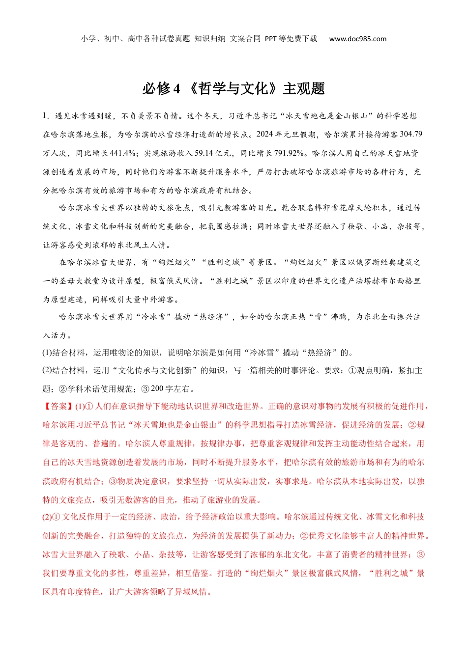 小学、初中、高中各种试卷真题知识归纳文案合同PPT等免费下载www.doc985.com必修4《哲学与文化》主观题1.遇见冰雪遇到暖,不负美景不负情。这个冬天,习近平总书记“冰天雪地也是金山银山”的科学思想在哈尔滨落地生根,为哈尔滨的冰雪经济打造新的增长点。2024年元旦假期,哈尔滨累计接待游客304.79万人次,同比增长441.4%;实现旅游收入59.14亿元,同比增长791.92%。哈尔滨人用自己的冰天雪地资源创造着发展的市场,同时他们为游客不断提升服务水平,严厉打击破坏哈尔滨旅游市场的各种行为,充分把哈尔滨有效的旅游市场和有为的哈尔滨政府有机结合。哈尔滨冰雪大世界以独特的文旅亮点,吸引无数游客的目光。乾合联名榫卯雪花摩天轮积木,通过传统文化、冰雪文化和科技创新的完美融合,把氛围感拉满;同时冰雪大世界还融入了秧歌、小品、杂技等,让游客感受到浓郁的东北风土人情。在哈尔滨冰雪大世界,有“绚烂烟火”“胜利之城”等景区。“绚烂烟火”景区以俄罗斯经典建筑之一的圣母大教堂为设计原型,极富俄式风情。“胜利之城”景区以印度的世界文化遗产法塔赫布尔西格里为原型建造,同样吸引大量中外游客。哈尔滨冰雪大世界用“冷冰雪”撬动“热经济”,如今的哈尔滨正热“雪”沸腾,为东北全面振兴注入活力。(1)结合材料,运用唯物论的知识,说明哈尔滨是如何用“冷冰雪”撬动“热经济”的。(2)结合材料,运用“文化传承与文化创新”的知识,写一篇相关的时事评论。要求:①观点明确,紧扣主题;②学科术语使用规范;③200字左右。【答案】(1)①人们在意识指导下能动地认识世界和改造世界。正确的意识对事物的发展有积极的促进作用,哈尔滨用习近平总书记“冰天雪地也是金山银山”的科学思想指导打造冰雪经济,促进经济的发展;②规律是客观的、普遍的。哈尔滨人尊重规律,按规律办事,把尊重客观规律和发挥主动能动性结合起来,用自己的冰天雪地资源创造着发展的市场,同时不断提升服务水平,把哈尔滨有效的旅游市场和有为的哈尔滨政府有机结合;③物质决定意识,要求坚持一切从实际出发,实事求是。哈尔滨从本地实际出发,以独特的文旅亮点,吸引无数游客的目光,推动了旅游业的发展。(2)①文化反作用于一定的经济、政治,给予经济政治以重大影响。哈尔滨通过传统文化、冰雪文化和科技创新的完美融合,打造独特的文旅亮点,为经济的发展提供了新动力;②优秀文化能够丰富人的精神世界。冰雪大世界融入了秧歌、小品、杂技等,让游客感受到了浓郁的东北文化,丰富了消费者的精神世界;③我们要尊重文化的多性,尊重差异,相互借鉴。打造的“绚烂烟火”景区极富俄式风情,“胜利之城”景区具有印度特色,让广大游客领略了异域风情。小学、初中、高中各种试卷真题知识归纳文案合同PPT等免费下载www.doc985.com【分析】背景素材:哈尔滨冰雪经济发展考点考查:唯物认论的相关知识能力考查:获取和解读信息、调动和运用知识、描述和阐释事物、论证与探究问题核心素养:政治认同、科学精神【解析】(1)第一步:审设问,明确主体、作答范围、问题限定和作答角度。本题的设问可转换为哈尔滨如何发展冰雪经济,需要调用唯物论的相关知识,从怎么做角度分析作答。第二步:审材料,提取关键词,链接教材知识。关键词①:习近平总书记“冰天雪地也是金山银山”的科学思想在哈尔滨落地生根,为哈尔滨的冰雪经济打造新的增长点→可联系意识的能动作用。关键词②:哈尔滨人用自己的冰天雪地资源创造着发展的市场,同时他们为游客不断提升服务水平,严厉打击破坏哈尔滨旅游市场的各种行为,充分把哈尔滨有效的旅游市场和有为的哈尔滨政府有机结合→可联系规律的客观性与普遍性原理。关键词③:哈尔滨人用自己的冰天雪地资源创造着发展的市场;哈尔滨冰雪大世界以独特的文旅亮点,吸引无数游客的目光→可联系物质决定意识,要求坚持一切从实际出发,实事求是。第三步:整合信息,组织答案。注意设问限定以及教材相关知识与材料相结合。(2)第一步:审设问,明确主体、作答范围、问题限定和作答角度。本题属于开放式试题,需要调用文化传承与文化创新的知识,结合材料,写一篇时事评论。第...