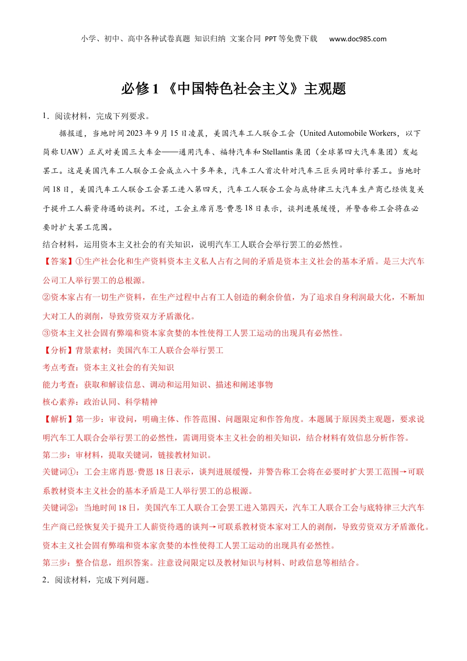 小学、初中、高中各种试卷真题知识归纳文案合同PPT等免费下载www.doc985.com必修1《中国特色社会主义》主观题1.阅读材料,完成下列要求。据报道,当地时间2023年9月15日凌晨,美国汽车工人联合工会(UnitedAutomobileWorkers,以下简称UAW)正式对美国三大车企——通用汽车、福特汽车和Stellantis集团(全球第四大汽车集团)发起罢工。这是美国汽车工人联合工会成立八十多年来,汽车工人首次针对汽车三巨头同时举行罢工。当地时间18日,美国汽车工人联合工会罢工进入第四天,汽车工人联合工会与底特律三大汽车生产商已经恢复关于提升工人薪资待遇的谈判。不过,工会主席肖恩·费恩18日表示,谈判进展缓慢,并警告称工会将在必要时扩大罢工范围。结合材料,运用资本主义社会的有关知识,说明汽车工人联合会举行罢工的必然性。【答案】①生产社会化和生产资料资本主义私人占有之间的矛盾是资本主义社会的基本矛盾。是三大汽车公司工人举行罢工的总根源。②资本家占有一切生产资料,在生产过程中占有工人创造的剩余价值,为了追求自身利润最大化,不断加大对工人的剥削,导致劳资双方矛盾激化。③资本主义社会固有弊端和资本家贪婪的本性使得工人罢工运动的出现具有必然性。【分析】背景素材:美国汽车工人联合会举行罢工考点考查:资本主义社会的有关知识能力考查:获取和解读信息、调动和运用知识、描述和阐述事物核心素养:政治认同、科学精神【解析】第一步:审设问,明确主体、作答范围、问题限定和作答角度。本题属于原因类主观题,要求说明汽车工人联合会举行罢工的必然性,需调用资本主义社会的相关知识,结合材料有效信息分析作答。第二步:审材料,提取关键词,链接教材知识。关键词①:工会主席肖恩·费恩18日表示,谈判进展缓慢,并警告称工会将在必要时扩大罢工范围→可联系教材资本主义社会的基本矛盾是工人举行罢工的总根源。关键词②:当地时间18日,美国汽车工人联合工会罢工进入第四天,汽车工人联合工会与底特律三大汽车生产商已经恢复关于提升工人薪资待遇的谈判→可联系教材资本家对工人的剥削,导致劳资双方矛盾激化。资本主义社会固有弊端和资本家贪婪的本性使得工人罢工运动的出现具有必然性。第三步:整合信息,组织答案。注意设问限定以及教材知识与材料、时政信息等相结合。2.阅读材料,完成下列问题。小学、初中、高中各种试卷真题知识归纳文案合同PPT等免费下载www.doc985.com《共产党宣言》是马克思主义的理论之基和信仰之源,是共产党人的必读书、常读书,其蕴含的理论博大精深、常学常新。延安时期毛泽东同志说:“《共产党宣言》,我看了不下一百遍,遇到问题,我就翻阅《共产党宣言》,有时只阅读一两段,有时全篇都读,每阅读一次,我都有新的启发。”习近平总书记强调,“如果心里觉得不踏实,就去钻研经典著作,多看几遍《共产党宣言》”。《共产党宣言》是一个内容丰富的理论宝库,值得不断学习、深入研究。反复研读《共产党宣言》是共产党人涵养正气、淬炼思想、升华境界、指导实践的必修课。结合材料,运用“科学社会主义的创立”的知识,分析新时代共产党人为什么要反复研读《共产党宣言》?【答案】①《共产党宣言》揭示了人类社会发展规律,科学论证了资本主义必然灭亡和社会主义必然胜利的历史必然性,新时代共产党人反复研读《共产党宣言》,有利于坚定社会主义必胜的信念,坚持走中国特色社会主义道路。②《共产党宣言》第一次系统论述了无产阶级政党的性质、特点、任务和策略原则,阐明了建立无产阶级政党的必要性。新时代共产党人反复研读《共产党宣言》,有利于始终坚持以人民为中心,更好地增进人民福祉,推动人的全面发展和社会全面进步。③《共产党宣言》阐述了未来共产主义社会的理想目标。新时代共产党人反复研读《共产党宣言》有利于坚定马克思主义信仰和共产主义理想,投身民族复兴伟业。【分析】背景素材:《共产党宣言》给人类社会进步指明方向考点考查:科学社会主义的理论与实践能力考查:获取和解读信息、调动和运用知识、描述和阐释事物核心素养:政治认同、科学精神【解析】第一步:审设问。明确知识范围、问题限定...