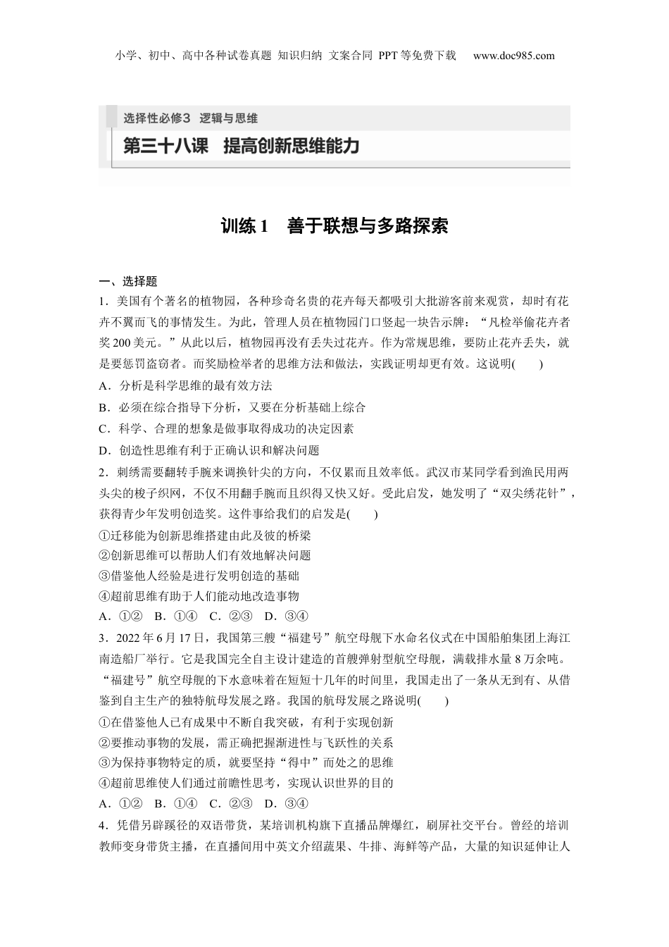 小学、初中、高中各种试卷真题知识归纳文案合同PPT等免费下载www.doc985.com训练1善于联想与多路探索一、选择题1.美国有个著名的植物园,各种珍奇名贵的花卉每天都吸引大批游客前来观赏,却时有花卉不翼而飞的事情发生。为此,管理人员在植物园门口竖起一块告示牌:“凡检举偷花卉者奖200美元。”从此以后,植物园再没有丢失过花卉。作为常规思维,要防止花卉丢失,就是要惩罚盗窃者。而奖励检举者的思维方法和做法,实践证明却更有效。这说明()A.分析是科学思维的最有效方法B.必须在综合指导下分析,又要在分析基础上综合C.科学、合理的想象是做事取得成功的决定因素D.创造性思维有利于正确认识和解决问题2.刺绣需要翻转手腕来调换针尖的方向,不仅累而且效率低。武汉市某同学看到渔民用两头尖的梭子织网,不仅不用翻手腕而且织得又快又好。受此启发,她发明了“双尖绣花针”,获得青少年发明创造奖。这件事给我们的启发是()①迁移能为创新思维搭建由此及彼的桥梁②创新思维可以帮助人们有效地解决问题③借鉴他人经验是进行发明创造的基础④超前思维有助于人们能动地改造事物A.①②B.①④C.②③D.③④3.2022年6月17日,我国第三艘“福建号”航空母舰下水命名仪式在中国船舶集团上海江南造船厂举行。它是我国完全自主设计建造的首艘弹射型航空母舰,满载排水量8万余吨。“福建号”航空母舰的下水意味着在短短十几年的时间里,我国走出了一条从无到有、从借鉴到自主生产的独特航母发展之路。我国的航母发展之路说明()①在借鉴他人已有成果中不断自我突破,有利于实现创新②要推动事物的发展,需正确把握渐进性与飞跃性的关系③为保持事物特定的质,就要坚持“得中”而处之的思维④超前思维使人们通过前瞻性思考,实现认识世界的目的A.①②B.①④C.②③D.③④4.凭借另辟蹊径的双语带货,某培训机构旗下直播品牌爆红,刷屏社交平台。曾经的培训教师变身带货主播,在直播间用中英文介绍蔬果、牛排、海鲜等产品,大量的知识延伸让人小学、初中、高中各种试卷真题知识归纳文案合同PPT等免费下载www.doc985.com们愿意主动守在直播间认真“听课”,激情下单。凭借长期的教学积累和持续的模式摸索,该机构正在迎来转型后的一次飞跃式成长。这体现了()①联想是创新思维的基础,具有连续的跨越性②创新思维不会凭空产生,必须以实践为基础③迁移可以开辟新思路,提高解决问题的能力④自我否定自我超越,才能打破规律获得发展A.①②B.①④C.②③D.③④5.北京2022年冬奥会体育图标共24个,该图标设计以中国汉字为灵感来源,以篆刻艺术为主要呈现形式,将冬季运动元素与中国传统文化巧妙结合,既展现出冬季运动挑战自我、追求卓越的特点,也凝聚了中国传统文化的厚重与精神,彰显了北京2022年冬奥会的理念和愿景。这体现了()①无意想象通过“畅想”方式进行思维活动②运用迁移和想象有助于解决现实中的问题③创新思维超越陈规,属于非逻辑思维方法④反映事物间普遍联系的联想思维十分重要A.①②B.①③C.②④D.③④6.联想思维是指将记忆中对不同事物的认识进行联结与思考的思维活动。它是在创新过程中运用概念的语义、属性的衍生、意义的相似性来激发创新思维的方法,是打开沉睡在头脑深处记忆的最简便和最适宜的钥匙。可见,联想思维()①是对事物之间普遍联系的反映②是一种发散性的思维方法③由思维抽象决定其水平和能力④具有非逻辑制约的畅想性A.①③B.①④C.②③D.②④7.黑洞是1915年爱因斯坦广义相对论预言存在的一种天体。北京时间2022年5月12日,事件视界望远镜(EHT)合作组织正式发布了银河系中心黑洞人马座A*的首张照片,这一形状酷似“甜甜圈”的黑洞,进一步验证了爱因斯坦广义相对论的正确性。材料表明()①“甜甜圈”概括了黑洞的形象特征,揭示了黑洞的本质和规律②从黑洞到“甜甜圈”,表明思维具有跨越的联结性和非逻辑制约的畅想性③“甜甜圈”的形象是人们根据主体需要,通过畅想的方式而形成④科学思维的结果具有可检验性,黑洞照片验证了爱因斯坦广义相对论的正确性A.①②B.①③C.②④D.③④8.写一篇题为《我最尊敬的人》的记叙文,如果要...