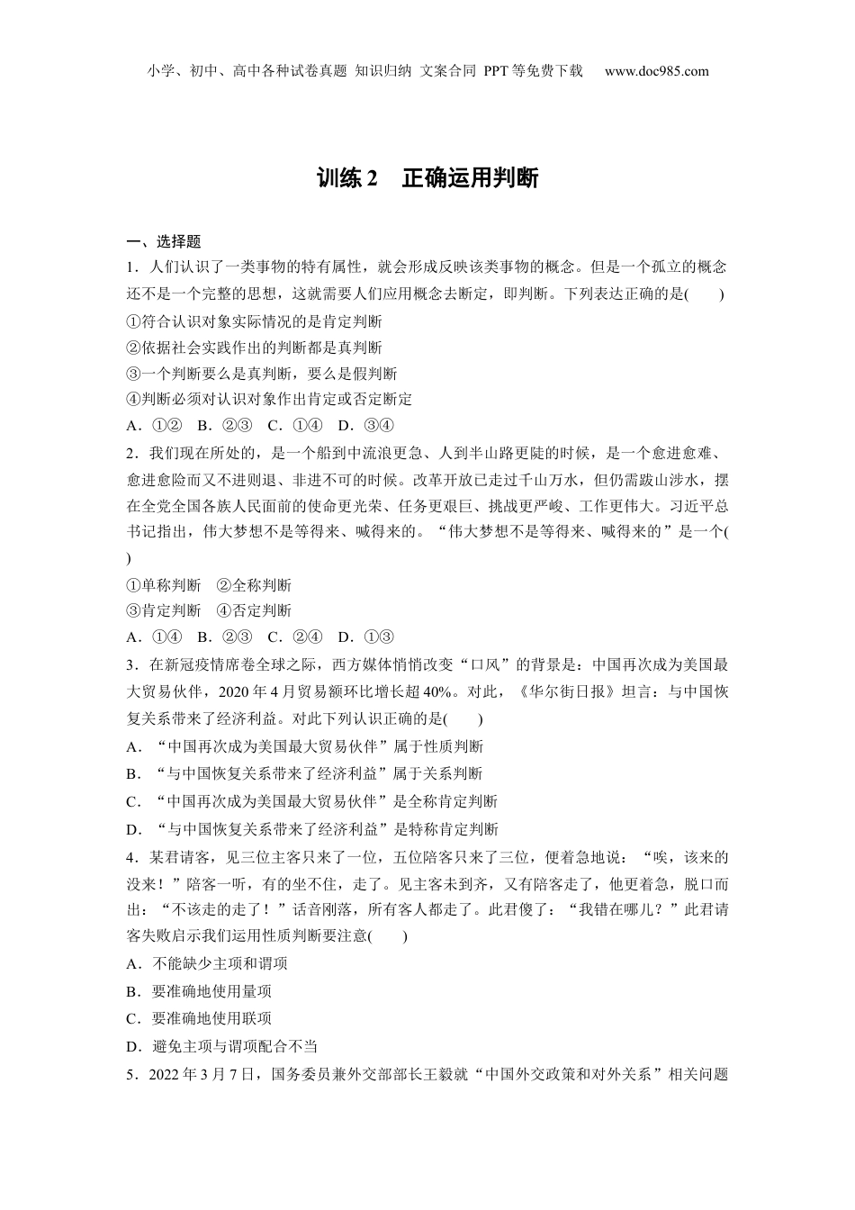 小学、初中、高中各种试卷真题知识归纳文案合同PPT等免费下载www.doc985.com训练2正确运用判断一、选择题1.人们认识了一类事物的特有属性,就会形成反映该类事物的概念。但是一个孤立的概念还不是一个完整的思想,这就需要人们应用概念去断定,即判断。下列表达正确的是()①符合认识对象实际情况的是肯定判断②依据社会实践作出的判断都是真判断③一个判断要么是真判断,要么是假判断④判断必须对认识对象作出肯定或否定断定A.①②B.②③C.①④D.③④2.我们现在所处的,是一个船到中流浪更急、人到半山路更陡的时候,是一个愈进愈难、愈进愈险而又不进则退、非进不可的时候。改革开放已走过千山万水,但仍需跋山涉水,摆在全党全国各族人民面前的使命更光荣、任务更艰巨、挑战更严峻、工作更伟大。习近平总书记指出,伟大梦想不是等得来、喊得来的。“伟大梦想不是等得来、喊得来的”是一个()①单称判断②全称判断③肯定判断④否定判断A.①④B.②③C.②④D.①③3.在新冠疫情席卷全球之际,西方媒体悄悄改变“口风”的背景是:中国再次成为美国最大贸易伙伴,2020年4月贸易额环比增长超40%。对此,《华尔街日报》坦言:与中国恢复关系带来了经济利益。对此下列认识正确的是()A.“中国再次成为美国最大贸易伙伴”属于性质判断B.“与中国恢复关系带来了经济利益”属于关系判断C.“中国再次成为美国最大贸易伙伴”是全称肯定判断D.“与中国恢复关系带来了经济利益”是特称肯定判断4.某君请客,见三位主客只来了一位,五位陪客只来了三位,便着急地说:“唉,该来的没来!”陪客一听,有的坐不住,走了。见主客未到齐,又有陪客走了,他更着急,脱口而出:“不该走的走了!”话音刚落,所有客人都走了。此君傻了:“我错在哪儿?”此君请客失败启示我们运用性质判断要注意()A.不能缺少主项和谓项B.要准确地使用量项C.要准确地使用联项D.避免主项与谓项配合不当5.2022年3月7日,国务委员兼外交部部长王毅就“中国外交政策和对外关系”相关问题小学、初中、高中各种试卷真题知识归纳文案合同PPT等免费下载www.doc985.com回答中外记者提问时强调,面对动荡变革的世界,中国始终代表着稳定性和正能量,始终站在历史前进的正确方向上。我们将继续胸怀天下、担当尽责,坚定不移地高举和平、发展、合作、共赢的旗帜,推动建设新型国际关系,推动构建人类命运共同体,同世界上一切进步力量一道,合力谋发展,一起向未来。这个判断是()A.简单判断中的关系判断B.简单判断中的假言判断C.复合判断中的联言判断D.复合判断中的选言判断6.联言判断是断定对象的几种情况同时存在的判断。下列语句属于联言判断的是()①不是鱼死,就是网破②时已近黄昏,夕阳无限好③人不犯我,我不犯人;人若犯我,我必犯人④国家要独立,民族要解放,人民要革命A.①②B.①③C.②④D.③④7.小了一篇散文后,道:刚读评论“篇散文不但文生,而且富有哲理。这笔动”小武后:读说“我不同意的点。文生我不反,但富有哲理在不上。你观说它笔动对说它实谈”小反刚驳:说“然不同意我的点,却又承文生,不是自相矛盾?你既观认它笔动这吗”对上述材料分析正确的是()①小刚的评论是一个联言判断②小刚的评论是一个简单判断③上述对话中小武的话合乎逻辑,联言判断当且仅当各个联言支都是真的,整个联言判断才是真的④上述对话中小刚的话合乎逻辑,只承认其中一个联言支是真的,依然可以认为整个联言判断是真的A.①③B.①④C.②③D.②④8.培育一批领军企业,打造一批数字产业集群,不仅可以提高我国数字产业和数字企业的国际竞争力,而且可以为数字经济带动世界经济复苏与繁荣作出贡献。下列选项中,与上述材料中复合判断的类型一致的是()①许多地方要么不公开高考满分作文,要么公开高考满分作文②中国共产党既是中国先进文化的积极引领者和践行者,又是中华优秀传统文化的忠实传承者和弘扬者③中国共产党是中国工人阶级的先锋队,是中国人民和中华民族的先锋队④只有巩固好脱贫攻坚成果,老百姓的日子才会越过越红火A.①③B.①④C.②③D.②④小学、初中、高中各种试卷真题知识归纳文案合...