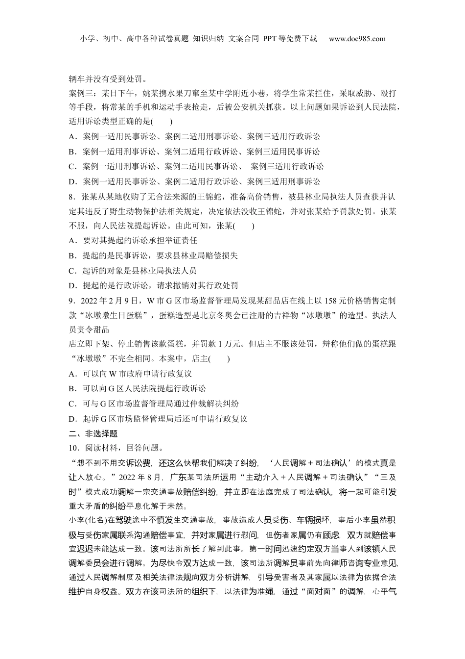 小学、初中、高中各种试卷真题知识归纳文案合同PPT等免费下载www.doc985.com训练1纠纷的多元解决方式一、选择题1.近年来,各级司法行政机关和广大人民调解组织、人民调解员充分发挥调解职能优势,服务群众、服务大局,扎实做好矛盾纠纷源头预防、排查预警、调解化解工作,及时有效化解了大量社会矛盾纠纷,切实筑牢了维护社会和谐稳定的“第一道防线”。对此,下列认识正确的是()①人民调解是化解社会矛盾纠纷的主要渠道②人民调解组织是司法行政机关的组成部分③有效的调解能够降低社会和谐稳定的成本④调解彰显了我国社会主义政治制度的优势A.①②B.①④C.②③D.③④2.人民调解是指在人民调解委员会主持下,以国家法律、法规、规章和社会公德规范为依据,对民间纠纷双方当事人进行调解、劝说,促使他们互相谅解、平等协商,自愿达成协议,消除纷争的活动。下列关于人民调解和人民调解委员会的说法正确的是()①人民调解产生的协议具有民事合同的性质,一旦签字认可,各方当事人均应遵守②人民调解化解纠纷的主要优势是可以超越法律规定,更具灵活性③尊重当事人诉讼权利,不得因未经调解或调解不成而阻止当事人向人民法院起诉④人民调解委员会是基层司法机构,调解协议有强制执行效力A.①③B.②④C.③④D.①②3.下面是某住房装修合同关于争议解决的条款:第十条争议解决1.本合同履行期间,双方如发生争议,在不影响工程进度的前提下,双方应协商解决。或凭本合同和乙方开具的统一发票向××市室内装饰行业协会京庭装潢专业委员会投诉,请求解决。2.当事人不愿通过协商、调解解决,或协商、调解解决不成时,可以按照本合同约定向××仲裁委员会申请仲裁。当该合同的争议发生时,当事人可选择的解决途径有()①商事仲裁②劳动争议仲裁小学、初中、高中各种试卷真题知识归纳文案合同PPT等免费下载www.doc985.com③行政诉讼④民事诉讼A.①③B.①④C.②③D.②④4.孙某在某电动车修理部以市场价购买了一个电动车充电器,在给电动车充电时充电器发生爆炸,致电动车完全损坏,但幸好无人员伤亡。孙某当日即与修理部交涉要求赔偿。经过协商,双方同意将此事交由仲裁委员会解决。为此孙某和修理部要明确的规定有()①仲裁必须由达成仲裁协议的双方当事人共同提出申请②一方不履行仲裁裁决,另一方可以向人民法院申请执行③仲裁裁决虽无法律效力,但双方当事人都应自觉履行④没有仲裁协议,一方申请仲裁的,仲裁委员会不予受理A.①②B.②④C.①③D.③④5.某发电厂的账户自2021年起被人民法院冻结,发电厂与人民法院多次协调后被解冻1000万元用于支付员工工资。袁某、肖某两位员工因未及时拿到拖欠9个月的工资,向劳动争议仲裁委员会申请仲裁。本案中()①仲裁申请应在知道权利被侵害之日起三年内提出②账户被冻结为不可抗力,发电厂可以拖欠工资③劳动争议仲裁委员会作出的裁决有法律约束力④准时足额发放工资是用人单位必须履行的义务A.①②B.①③C.②④D.③④6.依据下图信息可以做出如下推断()A.国家强制力是落实审判结果的后盾B.人民法院审理案件实行一审终审制C.人民法院裁判权利义务关系的依据是诉讼法D.人民检察院不能成为诉讼活动的主体7.案例一:刘某在小区散步时被狗咬伤,刘某与狗的主人张某就医药费、营养费、误工费等争吵不一。案例二:小钱把车停在杭州市萧山区某马路边被交警贴了罚单,但他发现一起停着的好几小学、初中、高中各种试卷真题知识归纳文案合同PPT等免费下载www.doc985.com辆车并没有受到处罚。案例三:某日下午,姚某携水果刀窜至某中学附近小巷,将学生常某拦住,采取威胁、殴打等手段,将常某的手机和运动手表抢走,后被公安机关抓获。以上问题如果诉讼到人民法院,适用诉讼类型正确的是()A.案例一适用民事诉讼、案例二适用刑事诉讼、案例三适用行政诉讼B.案例一适用刑事诉讼、案例二适用行政诉讼、案例三适用民事诉讼C.案例一适用刑事诉讼、案例二适用民事诉讼、案例三适用行政诉讼D.案例一适用民事诉讼、案例二适用行政诉讼、案例三适用刑事诉讼8.张某从某地收购了无合法来源的王锦蛇,准备高价销售,被县林业局执法人员查...