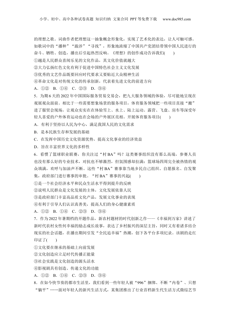 小学、初中、高中各种试卷真题知识归纳文案合同PPT等免费下载www.doc985.com训练1文化发展的必然选择与基本路径一、选择题1.中国特色社会主义道路的形成和发展过程,也是中国共产党人持续推进马克思主义中国化的过程。改革开放40多年来,我们党反复倡导和强调的解放思想、实事求是、与时俱进、求真务实等思想方法,都是中华优秀传统文化的重要内容,同时彰显了马克思主义的理论品格。由此可见()①马克思主义传入中国标志着中华民族由衰微走向复兴②中华传统文化是马克思主义政党思想精神上的旗帜③中国共产党是中国先进文化的积极引领者和践行者④中国共产党是中华优秀传统文化的传承者和弘扬者A.①②B.①③C.②④D.③④2.中国特色社会主义文化,源自于中华民族五千多年文明历史所孕育的中华优秀传统文化,熔铸于党领导人民在革命、建设、改革中创造的革命文化和社会主义先进文化,植根于中国特色社会主义伟大实践。对此认识正确的是()①社会主义先进文化与优秀传统文化、革命文化是一脉相承的②弘扬中国精神就是弘扬我们党创造的革命文化中的红色基因③中国特色社会主义文化决定社会主义现代化建设的方向和进程④中国特色社会主义文化积淀着中华民族最深层次的精神追求A.①②B.①④C.②③D.③④3.无论是“敌人只能砍下我们的头颅,决不能动摇我们的信仰”的方志敏,还是“坚持革命继吾志,誓将真理传人寰”的夏明翰,每一个历史事件、每一位革命英雄,都展现了我们党的梦想和追求、情怀和担当、牺牲和奉献。红色资源是新时代培基铸魂的“富矿”,这是基于革命文化()①承载国家独立、民族解放、人民幸福的不懈追求②以中国共产党和中国人民为忠实传承者和弘扬者③是中华优秀文化在革命时期的体现、丰富和发展④涵养着中华民族高度的文化认同,利于强国建设A.①②B.①④C.②③D.③④4.系列短剧《理想照耀中国》的主题曲《理想》歌颂了伟大的建党精神,是一首情真意切小学、初中、高中各种试卷真题知识归纳文案合同PPT等免费下载www.doc985.com的理想之歌。词曲作者把理想这一抽象概念形象化,实现了艺术化的表达,让人可触可感。如歌词中的“播种”“跋涉”“寻找”,形象地浓缩了中国共产党团结带领中国人民进行的奋斗、牺牲、创造,播出后引起热烈反响。《理想》的创作成功告诉我们()①越是人民群众喜闻乐见的文化作品,其文化价值就越大②大力弘扬红色文化有利于促进中国特色社会主义文化发展③优秀的文艺作品既要回应时代要求又要贴近大众精神生活④革命文化是对传统文化的传承创新,代表着先进文化的前进方向A.①②B.①④C.②③D.③④5.为期6天的2022年中国国际服务贸易交易会,把九大服务领域的体验,尽可能地呈现在观展观众面前。相比于一些需要想象场景的服务项目,体育服务领域把一些项目直接“搬”进了服贸会现场,让观众实实在在体验雪上、水上、陆上运动。露营、飞盘、房车等深受年轻人喜爱的户外体育运动也在会场的户外展区亮相。开展体育服务项目()A.有利于坚持以人民为中心,满足我国人民的文化需求B.是本民族生存和发展的基础C.在发挥中国历史文化资源优势,提高文化事业的经济效益D.旨在丰富世界文化的多样性6.看惯了篮球职业联赛,你关注过“村BA”吗?这类赛事组织没有那么高端,参赛人员也没有那么好的专业技术,对抗也不够激烈,但氛围感却拉满:篮球场四周完全被热情的观众填满,欢呼与加油声不断。这些“村BA”赛事靠当地乡民自己组织、自愿报名、自发聚集,政府部门进行赛事的审批。“村BA”赛事的兴起()①是一个社会经济水平和民众生活水平得到提升的反映②说明人民群众是文化发展的主体,文化发展依靠人民③是政府部门丰富高品质文化产品,发展文化事业的表现④有利于引导人们认识真善美,提高人们的身心健康素质A.①②B.①④C.②③D.③④7.作为2022年暑期档的开题作品,新农村题材的时代创新之作——《幸福到万家》讲述了新时代农村女性何幸福的励志成长故事,表达了乡村振兴的深层主旨,同时又有着诸多结合现实的社会话题,在播出期间引发“全民追幸福”热潮,创下各平台多项纪录。该剧的走红印证了()①文化要在继承的...