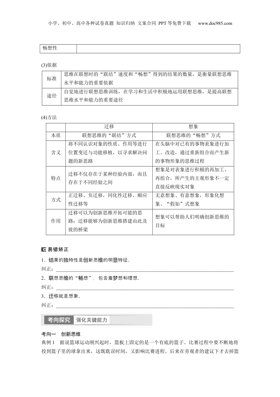 小学、初中、高中各种试卷真题知识归纳文案合同PPT等免费下载www.doc985.com第三十八课提高创新思维能力课标要求1.体会联想思维中迁移、想象的运用;了解联想思维的方法和特点;知道迁移、想象在创新思维中的作用。2.了解发散思维中所采取的推测等方法;概括发散思维的特点;知道聚合思维和发散思维的功能。3.分析逆向思维的依据和优势;发挥正向思维和逆向思维的互补作用。体会超前思维是对常识局限性的突破和超越;把握超前思维的探索性、预测性特点;了解创造性预测事物发展态势的意义。小学、初中、高中各种试卷真题知识归纳文案合同PPT等免费下载www.doc985.com课时1善于联想与多路探索核心考点一创新思维和联想思维1.创新思维(1)创新思维的内涵①含义:创新思维特指人们在实践中破除迷信、超越陈规,有所发现、有所发明的思维活动。创新思维是综合能力的体现。②产生条件:一方面,创新思维要以实践为基础,失去实践基础,思维会陷入不切实际的幻想。另一方面,创新思维离不开对前人和他人已有成果的继承。提醒不能求新求就是新,新思是指以新的方法解的思程,认为异创创维颖独创决问题维过但是求新求不一定就是思新。异维创(2)特征思路具有多向性从思维方向上看,创新思维常常从不同的角度去思考问题步骤具有跨越性创新思维不排斥一步一步的逻辑推导与分析,但它往往表现为对推理步骤的省略或跨越结果具有独特性人们在实践中遇到的问题往往没有现成的答案,许多问题不是用常规方法就能解决的(3)表现思路新突破陈规看问题,另辟蹊径想问题方法新不局限于常规方法,敢用新手段,试用新工具,因为方法得当而事半功倍结果新凡是创新思维的成果,总有其新颖独到之处2.联想思维(1)含义:联想思维就是将记忆中对不同事物的认识进行联结与思考的思维活动。联想思维是对事物之间普遍联系的反映。(2)特征跨越的联结性从形式上看,联想思维既可以将对相关对象的认识联系在一起,也可以将对看似不相关对象的认识联系在一起,其联结方式具有非连续的跨越性非逻辑制约的联想思维的“畅想”,包含着构想、想象甚至是幻想小学、初中、高中各种试卷真题知识归纳文案合同PPT等免费下载www.doc985.com畅想性(3)依据标准思维在联想时的“联结”速度和“畅想”得到的结果的数量,是衡量联想思维水平和能力的重要依据途径自觉地进行联想思维训练,在学习和生活中积极地运用联想思维,是提高联想思维水平和能力的重要途径(4)方法迁移想象本质联想思维的“联结”方式联想思维的“畅想”方式含义将不同认识对象的性质、作用等进行位置变迁与功能移植,以寻求解决问题的新思路在头脑中对已有的事物表象进行加工、改造,通过重新组合而产生新的事物形象的思维过程特点迁移不仅存在于某种经验内部,而且存在于不同经验之间想象是对表象进行积极的再加工、再组合,所产生的主观形象不一定直接反映现实对象方式正迁移、负迁移,同化性迁移、顺应性迁移等无意想象、有意想象,形象化想象、“假如”式想象作用迁移可以为创新思维开拓可能的思路;迁移能够为创新思维搭建由此及彼的桥梁想象可以帮助人们明确创新思维的目标1.果的特性是新思的明特征。结独创维显纠正:________________________________________________________________________2.想思的联维“想畅”,包含着想和理想。梦纠正:________________________________________________________________________3.移就是想象。迁纠正:________________________________________________________________________考向一创新思维典例1据说篮球运动刚兴起时,篮板上固定的是一个有底的篮子。比赛过程中要不断地将投到篮子里的球拿出来,这既耽误时间,又影响比赛进程。后来在旁观者的建议下才去掉篮小学、初中、高中各种试卷真题知识归纳文案合同PPT等免费下载www.doc985.com底,于是无底的篮筐一直延续到现在。这从一个侧面说明()①思路的多向性是创新思维的重要特征②创新思维是推动实践活动发展的前提③迁移是推动创新思维跃升的重要途径④创新思维的结果总具有新颖独到之处A.①③B.①④C.②③D.②④易错提醒:误认为创新思维是推动实践活...