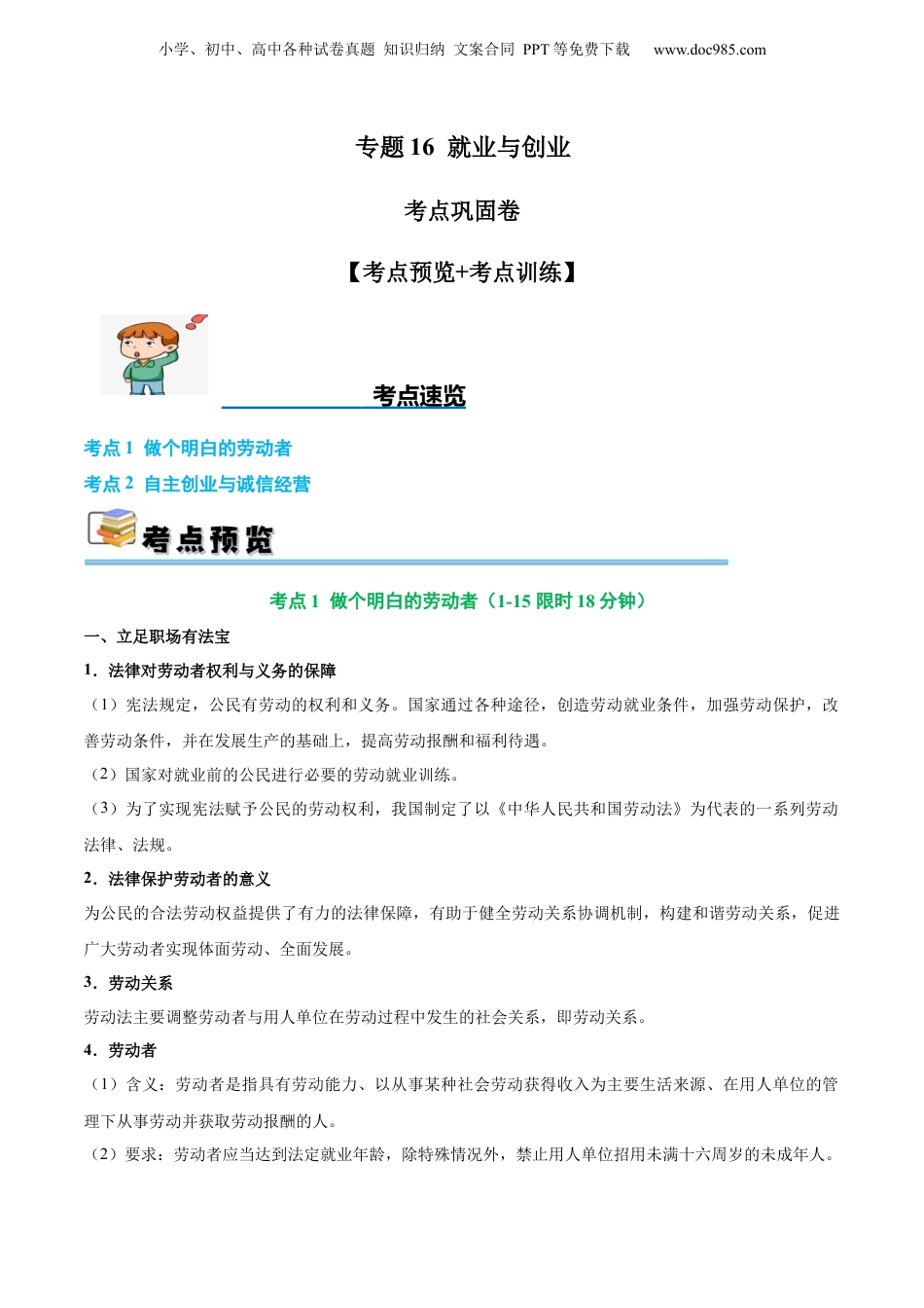 小学、初中、高中各种试卷真题知识归纳文案合同PPT等免费下载www.doc985.com专题16就业与创业考点巩固卷【考点预览+考点训练】考点速览考点1做个明白的劳动者考点2自主创业与诚信经营考点1做个明白的劳动者(1-15限时18分钟)一、立足职场有法宝1.法律对劳动者权利与义务的保障(1)宪法规定,公民有劳动的权利和义务。国家通过各种途径,创造劳动就业条件,加强劳动保护,改善劳动条件,并在发展生产的基础上,提高劳动报酬和福利待遇。(2)国家对就业前的公民进行必要的劳动就业训练。(3)为了实现宪法赋予公民的劳动权利,我国制定了以《中华人民共和国劳动法》为代表的一系列劳动法律、法规。2.法律保护劳动者的意义为公民的合法劳动权益提供了有力的法律保障,有助于健全劳动关系协调机制,构建和谐劳动关系,促进广大劳动者实现体面劳动、全面发展。3.劳动关系劳动法主要调整劳动者与用人单位在劳动过程中发生的社会关系,即劳动关系。4.劳动者(1)含义:劳动者是指具有劳动能力、以从事某种社会劳动获得收入为主要生活来源、在用人单位的管理下从事劳动并获取劳动报酬的人。(2)要求:劳动者应当达到法定就业年龄,除特殊情况外,禁止用人单位招用未满十六周岁的未成年人。小学、初中、高中各种试卷真题知识归纳文案合同PPT等免费下载www.doc985.com5.★劳动法的基本原则(1)保护劳动者的合法权益。①地位:劳动法的首要原则是保护劳动者的合法权益。②意义:保护劳动者合法权益,可以提升劳动者的获得感、幸福感和安全感。③内容:劳动法明确规定了劳动者应享有的各项权利,同时规定了用人单位必须履行的义务。可以说,劳动法就是劳动者权益保护法。(2)劳动者平等竞争的原则。①表现:劳动者享有平等就业和选择职业的权利;劳动者就业,不因民族、种族、性别、宗教信仰不同而受歧视。②要求:全社会应当坚决防止和纠正就业歧视,营造公平就业制度环境。(3)特殊劳动保护的原则。①体现:除对劳动者的权利进行倾斜保护外,劳动法还注重对未成年工、残疾劳动者等特殊劳动者的劳动保护,切实保障劳动者的合法权益。②意义:显示了国家对劳动者的关怀,也是社会进步的标志。6.劳动合同(1)要求:建立劳动关系,应当订立书面劳动合同。(2)★含义:劳动合同是劳动者与用人单位确立劳动关系、明确双方权利和义务的协议。(3)意义:有了劳动合同,劳动者维权有据,可以更好地保护自己的合法权益,构建和发展和谐稳定的劳动关系。7.★劳动合同的条款(1)必备条款:必备条款是任何劳动合同必须具备的条款,主要包括:劳动合同期限,工作内容和工作地点,工作时间和休息休假,劳动报酬,社会保险,劳动保护、劳动条件和职业危害防护,等等。(2)可备条款:劳动合同的可备条款是除必备条款外劳动合同中可以规定的条款,包括试用期、培训、保守秘密、补充保险和福利待遇等条款。8.订立劳动合同的原则订立劳动合同,应当遵循合法、公平、平等自愿、协商一致、诚实信用的原则。(1)合法,是指劳动合同的主体、形式和内容必须符合法律、法规的规定;(2)公平,是指劳动合同的内容应当公平、合理;(3)平等自愿,是指双方当事人的法律地位平等,劳动合同的订立完全出于当事人的意愿,任何一方都不得强制对方接受某种条件;(4)协商一致,是指劳动者和用人单位在双方意思表示达成一致的基础上订立劳动合同;(5)诚实信用,是指用人单位和劳动者在订立劳动合同时应当诚实,恪守信用。小学、初中、高中各种试卷真题知识归纳文案合同PPT等免费下载www.doc985.com9.★劳动合同的效力(1)条件:劳动合同符合法律规定的条件才产生法律效力。(2)劳动合同无效或者部分无效的情形:①以欺诈、胁迫的手段或者乘人之危,使对方在违背真实意思的情况下订立或者变更劳动合同的;②用人单位免除自己的法定责任、排除劳动者权利的;③违反法律、行政法规强制性规定的。(无效劳动合同从订立起就没有法律约束力。)(3)劳动合同的生效和履行:①劳动合同的生效:劳动合同一旦由双方当事人签字或者盖章,即对双方形成约束力,当事人应当依法履行,不得随意变更。②劳动合同的...