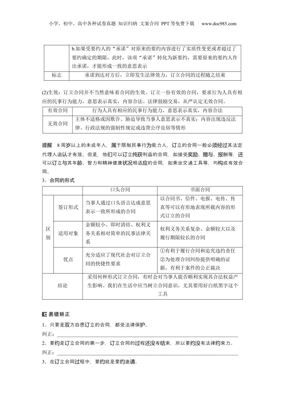 小学、初中、高中各种试卷真题知识归纳文案合同PPT等免费下载www.doc985.com课时3订约履约诚信为本核心考点一订立合同学问大1.合同的基本知识含义合同是民事主体之间设立、变更、终止民事法律关系的协议种类买卖合同、赠与合同、租赁合同、运输合同等合同订立①条件:必须由订立合同的各方当事人在自愿的基础上达成共识,即就某种民事法律关系的设立、变更、终止形成一致的意思表示②目的:实现各自的利益③保护:依法成立的合同,受法律保护意义利用合同参与交易活动能够充分体现市场交易者的自由意志:①自愿订立的合同可以满足市场交易者的特定需求,有利于资源的有效配置,从而增加整体的社会财富②自愿订立的合同促成市场交易者相互合作,共同形成社会的信用机制提醒意思表示是民事主体自由意志的体,合同的成立和生效具有定性意。现对决义2.订立合同过程(1)合同的订立过程:要约与承诺。①要约含义希望与他人订立合同的意思表示当事人发出要约的一方为要约人,接受要约的一方为受要约人要求为了保护受要约人的合理期待,维护稳定的交易秩序,生效的要约具有法律约束力提醒要约≠要邀。要邀是希望他人向自己出要的表示,不具有法律束力。约请约请发约约商广告和宣的容符合要件的,成要。业传内约条构约②承诺含义受要约人同意要约的意思表示要求a.承诺由受要约人及时向要约人作出,并在要约确定的期限内到达,该意思表示的内容应当与要约的内容一致小学、初中、高中各种试卷真题知识归纳文案合同PPT等免费下载www.doc985.comb.如果受要约人的“承诺”对原来的要约内容进行了实质性变更或者超过了要约确定的期限,此时,该项“承诺”转化为新要约,需要原来的要约人作出承诺,才能形成一致的意思表示标志承诺到达对方后,立即发生法律效力,订立合同的过程随之结束(2)生效:订立合同并不当然意味着合同的生效。订立一份有效的合同,要求行为人具有相应的民事行为能力,意思表示真实,内容合法。法律鼓励交易,从严认定无效合同。有效合同行为人具有相应的民事行为能力,意思表示真实,内容合法无效合同主体不适格或因欺诈、胁迫导致当事人意思表示不真实;内容出现违反法律、行政法规的强制性规定或违背公序良俗等情形提醒8周以上的未成年人,于限制民事行能力人,立的合同一般必其法定岁属为订须经过代理人追才有效。但是,他可以立利益的合同,如接受、、酬等,认们订纯获奖励赠与报还可以立其年、智力和精神健康相适的合同,如乘坐交通工具等,均成有效合订与龄状况应构同。3.合同的形式口头合同书面合同区别签订形式当事人通过口头语言达成意思表示一致所形成的合同以合同书、信件、电报、电传、传真等可以有形地表现所载内容的形式订立的合同适用对象金额较小、即时清结、权利义务关系相对简单的民事法律关系权利义务关系复杂、金额较大以及履行期限较长的合同优点充分适应了现代社会对订立合同的快捷性要求①有利于履行合同和追究违约责任②为处理合同纠纷提供明确的证据,有利于案件的公正裁决结论采用何种形式订立合同,有时会对当事人能否顺利实现其合法权益产生影响。我们在生活中应当树立合同意识,尤其要用好白纸黑字这个工具1.只要是方自愿立的合同,都受法律保。双订护纠正:________________________________________________________________________2.要是立合同的第一步,立合同的程有束,所以要有法律束力。约订订过还没结约没约纠正:________________________________________________________________________3.在立合同程中,要就是要邀。订过约约请小学、初中、高中各种试卷真题知识归纳文案合同PPT等免费下载www.doc985.com纠正:________________________________________________________________________4.立合同就意味着合同的生效。订纠正:________________________________________________________________________考向一合同订立过程典例1(2022·山高考东)廖某在甲家具公司的网站上看到“本店所有家具凭优惠券打折30%,当日有效”的弹窗,遂凭优惠券在该网站成功下单一张红木茶几,付款方式为“货到付款”。后廖某又修改了订单中的付...