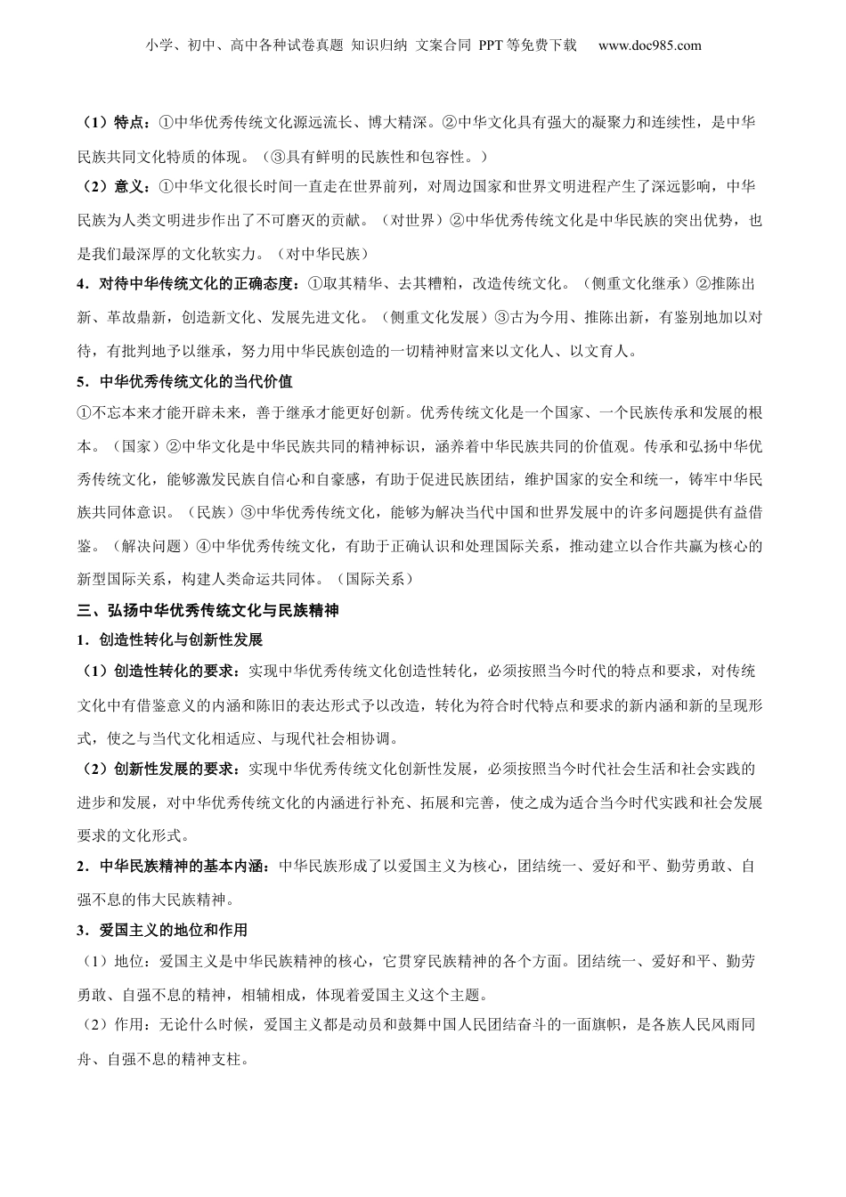 小学、初中、高中各种试卷真题知识归纳文案合同PPT等免费下载www.doc985.com专题09文化传承与文化创新考点巩固卷考点速览考点1继承发扬中华优秀传统文化考点2学习借鉴外来文化的有益成果考点3发展中国特色社会主义文化考点1继承发展中华优秀传统文化(1-10限时12分钟)一、文化的内涵与功能1.文化的含义(1)广义的文化:指人类认识和改造世界的一切活动及其创造的物质成果和精神成果。(2)狭义的文化:是相对于经济、政治而言的人类全部精神现象,既包括世界观、人生观、价值观等具有意识形态性质的内容,又包括自然科学和技术等非意识形态的内容。2.文化的产生:文化是人类社会实践的产物,纯粹自然的东西不能称为文化。3.文化与经济、政治的关系①经济、政治决定文化。经济是基础,政治是经济的集中表现,文化是经济和政治的反映。②一定的文化由一定的经济、政治所决定,又反作用于一定的经济、政治,给予经济、政治以重大影响。先进的、健康的文化会促进社会的发展,落后的、腐朽的文化则会阻碍社会的发展。③文化具有相对独立性。经济发展是文化发展的基础,但文化发展与经济、政治的发展并不完全同步。4.文化的核心:世界观、人生观、价值观是文化的核心,支配和影响着人们的文化实践与文化生活。5.文化与文明的关系(1)区别:文明与野蛮相对立,是人类进步和开化状态的标志。只要是文明就是积极向上的。文化则有先进与落后的区分,反映先进的经济和政治的文化形成了先进文化,反映腐朽落后的经济和政治的文化形成了落后文化。小学、初中、高中各种试卷真题知识归纳文案合同PPT等免费下载www.doc985.com(2)联系:文化与文明都是实践的产物,其创造主体都是人。先进文化是人类文明的一项重要内容。6.文化的载体(1)含义:文化载体是指文化的记录、记载、标识、传承和表现的物化形式。(2)作用:文化载体承载、表达和展现着文化的内容。(3)形式:文化载体是多种多样的,器物、行为、制度等是文化的载体。7.文化的功能(1)文化具有引领风尚、教育人民、服务社会、推动发展的功能。(对社会)①文化可以引导人们认识真善美,为人们提供精神指引,提升全民族的文明素养。②文化可以教化育人,帮助人们提高思想道德素质、科学文化素质和身心健康素质,促进人的全面发展。③文化可以服务社会,满足人们过上美好生活的新期待,为人们提供丰富的精神食粮。④文化可以推动发展,是国家繁荣振兴取之不尽、用之不竭的力量源泉,对提高社会文明程度具有重要作用。(2)文化是民族的血脉和灵魂。(对民族)①文化兴国运兴,文化强民族强。②当代中国,铸牢中华民族共同体意识,要以认同、传承和发展中华优秀传统文化为前提。③没有高度的文化自信,没有文化的繁荣兴盛,就没有中华民族的伟大复兴。(3)人创造了文化,文化也在塑造着人。(对个人)①优秀文化能够丰富人的精神世界,增强人的精神力量,促进人的全面发展。②积极参与健康有益的文化活动,不断丰富自身的精神世界,是培养健全人格的重要途径。二、正确认识中华传统文化1.中华文化的形成和发展(1)形成:中华文化是中华民族勤劳智慧、自强不息创造得来的。(2)发展:①中华文化是我国各民族在交流、碰撞、交锋中发展起来的。各民族文化相互交融、相互促进,共同熔铸了灿烂的中华文化,成为中华民族独特的精神标识。(内部)②中华文化是在与世界各国文化的交流、碰撞、交锋中发展起来的。中华文化注重吸收和借鉴外来文化的有益成果,不断增强其包容性,促进了自身的发展。(外部)2.中华优秀传统文化的主要内容(1)核心思想理念:讲仁爱、重民本、守诚信、崇正义、尚和合、求大同等;(2)中华传统美德:自强不息、敬业乐群、扶危济困、见义勇为、孝老爱亲等;(3)中华人文精神:促进社会和谐、鼓励人们向上向善的思想文化内容等。3.中华优秀传统文化的特点及意义小学、初中、高中各种试卷真题知识归纳文案合同PPT等免费下载www.doc985.com(1)特点:①中华优秀传统文化源远流长、博大精深。②中华文化具有强大的凝聚力和连续性,是中华民族共同文化特质的体现。(③具有鲜明的民族性和包容性。)(2...
