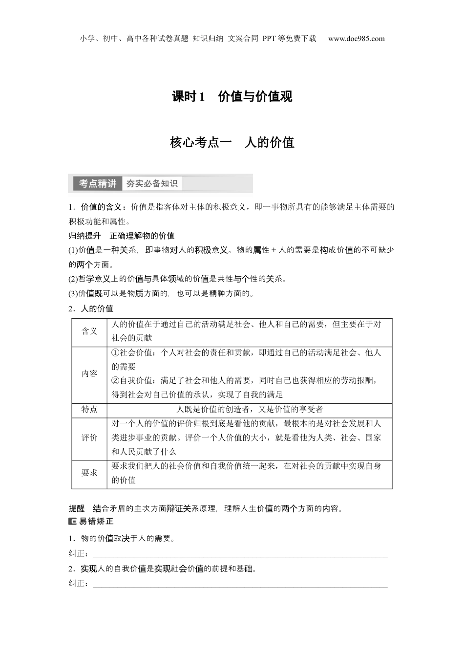 小学、初中、高中各种试卷真题知识归纳文案合同PPT等免费下载www.doc985.com第二十三课实现人生的价值课标要求1.理解价值观的形成与时代和环境密切相关。2.解析价值观差异与冲突产生的社会根源,能够进行合理的价值判断和行为选择。3.理解价值观对人们行为的导向作用,探寻实现人生价值的条件和途径,践行社会主义核心价值观。小学、初中、高中各种试卷真题知识归纳文案合同PPT等免费下载www.doc985.com课时1价值与价值观核心考点一人的价值1.价值的含义:价值是指客体对主体的积极意义,即一事物所具有的能够满足主体需要的积极功能和属性。归纳提升正确理解物的价值(1)价是一系,即事物人的意。物的性+人的需要是成价的不可缺少值种关对积极义属构值的方面。两个(2)哲意上的价具体域的价是共性性的系。学义值与领值与个关(3)价可以是物方面的,也可以是精神方面的。值既质2.人的价值含义人的价值在于通过自己的活动满足社会、他人和自己的需要,但主要在于对社会的贡献内容①社会价值:个人对社会的责任和贡献,即通过自己的活动满足社会、他人的需要②自我价值:满足了社会和他人的需要,同时自己也获得相应的劳动报酬,得到社会对自己价值的承认,实现了自我的满足特点人既是价值的创造者,又是价值的享受者评价对一个人的价值的评价归根到底是看他的贡献,最根本的是对社会发展和人类进步事业的贡献。评价一个人价值的大小,就是看他为人类、社会、国家和人民贡献了什么要求要求我们把人的社会价值和自我价值统一起来,在对社会的贡献中实现自身的价值提醒合矛盾的主次方面系原理,理解人生价的方面的容。结辩证关值两个内1.物的价取于人的需要。值决纠正:________________________________________________________________________2.人的自我价是社价的前提和基。实现值实现会值础纠正:________________________________________________________________________小学、初中、高中各种试卷真题知识归纳文案合同PPT等免费下载www.doc985.com3.有价的人生不考人利益。值应虑个纠正:________________________________________________________________________4.一人的精神价大于物。个贡献值远远质贡献纠正:________________________________________________________________________考向一物的价值典例1(2020·北京高考)智能技术的应用越来越广,几乎渗透到生活的每一个角落。但对于很多老年人来说,扫码购物、网上办事、线上挂号等都难以适应,方便的智能应用反而给老年人的日常生活带来不便。对此,下列观点正确的是()A.智能技术带来的“不便”,是违背科技发展规律的表现B.智能技术带来的“便”与“不便”,说明矛盾斗争性是相对的C.智能技术被应用于生活的方方面面,逐渐成为矛盾主要方面D.智能技术的应用要注重价值考量,坚持科学精神与人文精神的统一变式1为了让学生养成良好的生活习惯和节约意识,用实实在在的行动践行绿色发展理念,某高中发起了“变废为宝”活动,号召学生节约资源,提高环保意识。学生们开动脑筋,动手实践,家中的纸箱变成简易的“垃圾箱”“口罩回收箱”;很多的瓶瓶罐罐通过合适的剪裁,再加以装饰,普通的瓶子就变成了美丽的花盆。变废为宝的事实佐证了()①事物价值的变化取决于物质的属性及主体的需要②事物价值的实现建立在物与主体关系的基础上③人们多样的价值选择是创意成功的源泉④观念创新实现了事物价值的转换与创造A.①②B.①③C.②④D.③④考向二人的价值典例2(2019·江高考苏)“软世代”是近年来出现的青年群体,意指在发达的消费社会,一些年轻人缺乏进取心和意志力,甚至宁愿宅在家里打游戏、啃老,也不愿意出去工作,整个人的身心都绵软无力。如果让你去劝导他们,下列道理比较合适的是()①人生的真正价值在于对社会的责任和贡献②脱离社会的“个人奋斗”是不可能实现的③走出自我的小天地,才能拥有真正的幸福④实现人生价值必须利用社会提供的物质条件A.①②B.①③C.②④D.③④变式22022年1月,重庆市血液中心启动了冬季团体预约无偿献血工作,为春节假期和北京冬奥会期间的用血需求提供了有效保障。...
