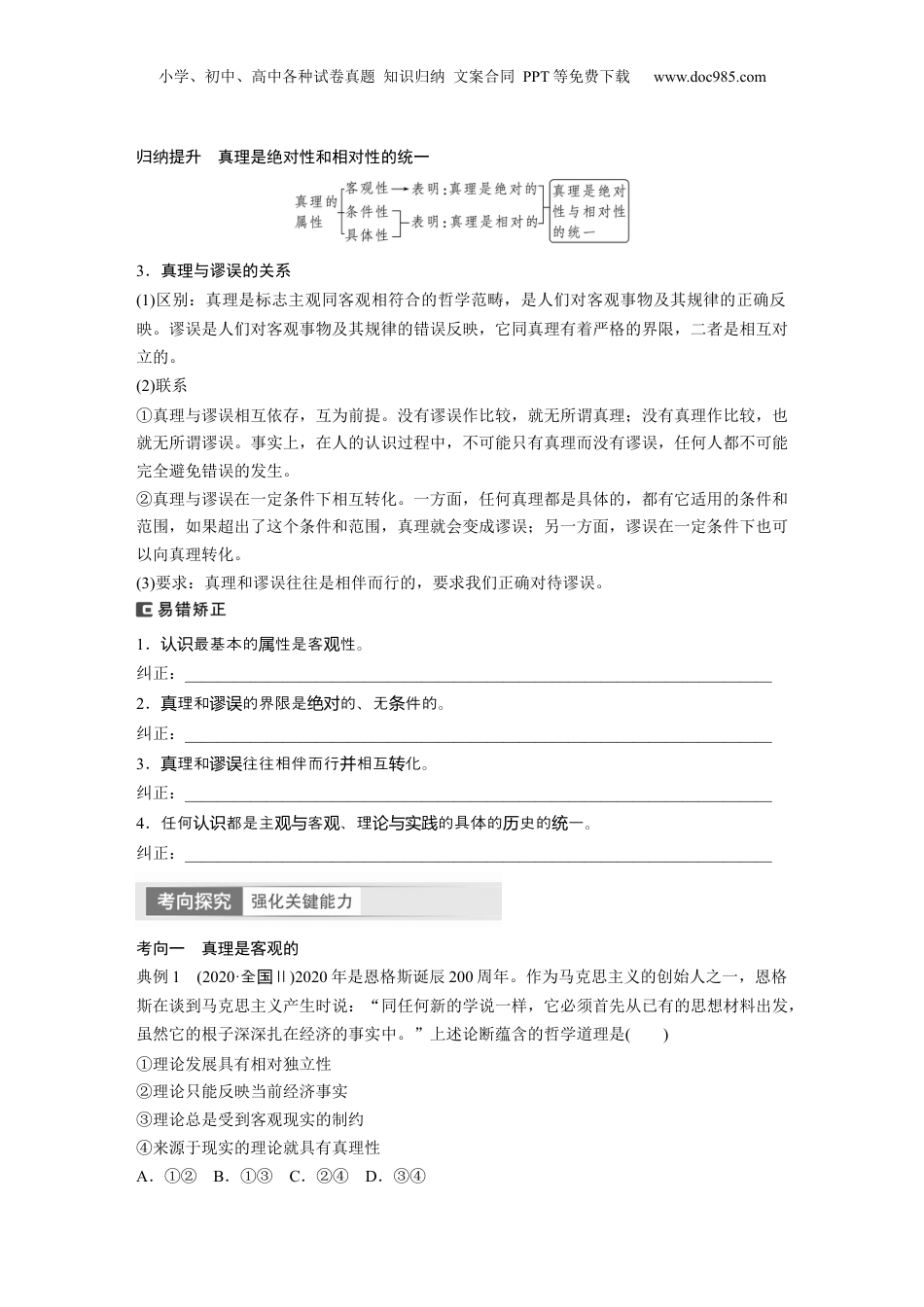 小学、初中、高中各种试卷真题知识归纳文案合同PPT等免费下载www.doc985.com课时2在实践中追求和发展真理核心考点一真理是客观的、具体的有条件的1.真理的含义:真理是标志主观同客观相符合的哲学范畴,是人们对客观事物及其规律的正确反映。归纳提升意识、认识、真理、科学理论意识认识理真科理学论区别含义是人客存脑对观在的反映,相对于物而言质是主体客体的对能的反映,相动于而言对实践是人客事们对观物及其律的正规确反映,相于对而言谬误是理性的真认识系化形成的理统体系,相于论对理而言个别真性质有正确之分与错误于正确的属认识系联①容都是客的,形式都是主的内观观②都人的活具有能的反作用对实践动动2.真理的特征属性理解要求客观性(最基本)①原因:任何真理所反映的内容(客观事物及其规律)是客观的;真理的检验标准(实践)是客观的②表现:在同一条件下人们对同一对象的真理性认识只有一个而不可能有多个承认真理的客观性,就应当坚持“在真理面前人人平等”有条件的(空间、横向)任何真理都有自己适用的条件和范围,如果超出了这个条件和范围,真理就会变成谬误要正确把握真理的适用条件和范围具体的(时间、纵向)任何真理都是相对于特定的过程来说的,都是主观与客观、理论与实践的具体的历史的统一要随着历史条件的变化而丰富、发展和完善真理小学、初中、高中各种试卷真题知识归纳文案合同PPT等免费下载www.doc985.com归纳提升真理是绝对性和相对性的统一3.真理与谬误的关系(1)区别:真理是标志主观同客观相符合的哲学范畴,是人们对客观事物及其规律的正确反映。谬误是人们对客观事物及其规律的错误反映,它同真理有着严格的界限,二者是相互对立的。(2)联系①真理与谬误相互依存,互为前提。没有谬误作比较,就无所谓真理;没有真理作比较,也就无所谓谬误。事实上,在人的认识过程中,不可能只有真理而没有谬误,任何人都不可能完全避免错误的发生。②真理与谬误在一定条件下相互转化。一方面,任何真理都是具体的,都有它适用的条件和范围,如果超出了这个条件和范围,真理就会变成谬误;另一方面,谬误在一定条件下也可以向真理转化。(3)要求:真理和谬误往往是相伴而行的,要求我们正确对待谬误。1.最基本的性是客性。认识属观纠正:________________________________________________________________________2.理和的界限是的、无件的。真谬误绝对条纠正:________________________________________________________________________3.理和往往相伴而行相互化。真谬误并转纠正:________________________________________________________________________4.任何都是主客、理的具体的史的一。认识观与观论与实践历统纠正:________________________________________________________________________考向一真理是客观的典例1(2020·全国Ⅱ)2020年是恩格斯诞辰200周年。作为马克思主义的创始人之一,恩格斯在谈到马克思主义产生时说:“同任何新的学说一样,它必须首先从已有的思想材料出发,虽然它的根子深深扎在经济的事实中。”上述论断蕴含的哲学道理是()①理论发展具有相对独立性②理论只能反映当前经济事实③理论总是受到客观现实的制约④来源于现实的理论就具有真理性A.①②B.①③C.②④D.③④小学、初中、高中各种试卷真题知识归纳文案合同PPT等免费下载www.doc985.com易错提醒:误认为来源于现实的理论就具有真理性。理是人客事物及其律的正确真们对观规反映。只有通的正确才是理。过实践检验认识真变式1有人说,世上本无对错,看问题的角度不同,答案不同而已。我们应该学会从别人的角度看世界,多一分理解,多一分宽容,多一分求同存异。该观点()①认为“世上本无对错”是错误的,真理是客观的,真理和谬误是不容混淆的②认为“世上本无对错”是正确的,真理是相对的,真理和谬误往往相伴而行③强调“从别人的角度看世界”有道理,要一切以时间、地点和条件为转移④强调“从别人的角度看世界”有道理,立场、观点和方法等因素影响人的认识A.①②B.①③C.②③D.①④考向二真理是具体的有条件的典例2“吃就吃新鲜的”,这是人们经...