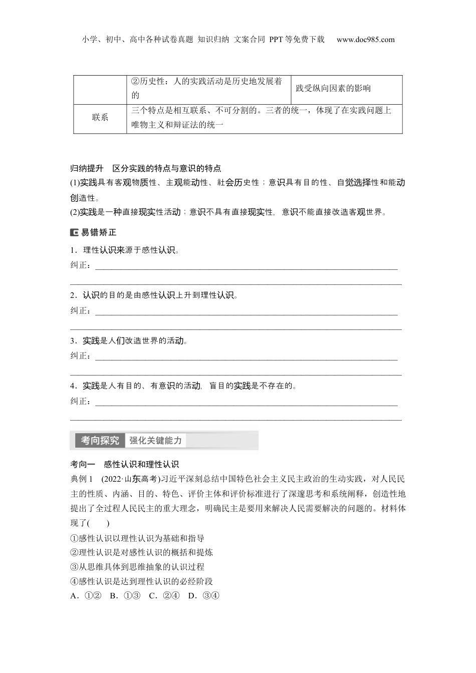 小学、初中、高中各种试卷真题知识归纳文案合同PPT等免费下载www.doc985.com第二十一课探索认识的奥秘课标要求1.了解人的实践活动的特性和作用,理解社会生活的实践本质。2.阐明实践是认识的基础,是检验真理的唯一标准。3.阐述认识运动的辩证发展过程。课时1人的认识从何而来核心考点一认识与实践1.认识:主体对客体的能动反映。感性认识理性认识小学、初中、高中各种试卷真题知识归纳文案合同PPT等免费下载www.doc985.com区别含义人们在实践基础上由感觉器官直接感受到的关于事物的现象、事物的外部联系、事物的各个方面的认识人们借助抽象思维在概括、整理大量感性材料的基础上达到关于事物的本质、全体、内部联系和事物自身规律性的认识形式感觉、知觉和表象概念、判断和推理阶段认识的初级阶段认识的高级阶段联系都是人们对客观世界的反映形式;感性认识有待于发展、深化为理性认识,理性认识依赖于感性认知,二者相互渗透、相互包含,具有辩证统一关系提醒合《思》体结逻辑与维会“展的程——感性具体到思抽象、再到思具认识发历从维维体”的相知,深入理解感性和理性。关识认识认识2.实践(1)含义含义理解实践是人们改造客观世界的物质性活动主体:人实践是人类特有的活动,动物的本能活动不是实践实践是连接主观和客观的桥梁,是主观见之于客观的活动,是一种直接现实性活动活动:改造实践不是思维活动、认识活动对象:客观事物实践是发生在人与自然界、人与社会之间的活动提醒用念涵外延的知理解念,不能大的外延运概内与识实践概扩实践(如:认为“是实践人和改造世界的活们认识动”),也不能小的外延缩实践(如:认为“是人改造自然界实践们的活动”)。(2)基本形式:基本的实践活动形式包括改造自然的生产实践(最基本)、变革社会的实践、探索世界规律的科学实验活动等。(3)特点特点理解侧重点客观物质性①实践的基本要素包括实践的主体、实践的对象和实践的手段。它们都是客观的②实践活动的过程是物质相互作用的过程,这个过程及其结果是受客观事物及其运动规律制约的强调实践受客观因素的影响主观能动性实践是人有目的、有意识的活动强调实践受主观因素的影响社会历史性①社会性:实践是处在一定社会关系中的人的活动社会性,强调实践受横向因素的影响;历史性,强调实小学、初中、高中各种试卷真题知识归纳文案合同PPT等免费下载www.doc985.com②历史性:人的实践活动是历史地发展着的践受纵向因素的影响联系三个特点是相互联系、不可分割的。三者的统一,体现了在实践问题上唯物主义和辩证法的统一归纳提升区分实践的特点与意识的特点(1)具有客物性、主能性、社史性;意具有目的性、自性和能实践观质观动会历识觉选择动造性。创(2)是一直接性活;意不具有直接性,意不能直接改造客世界。实践种现实动识现实识观1.理性源于感性。认识来认识纠正:_______________________________________________________________________________________________________________________________________________________2.的目的是由感性上升到理性。认识认识认识纠正:_______________________________________________________________________________________________________________________________________________________3.是人改造世界的活。实践们动纠正:_______________________________________________________________________________________________________________________________________________________4.是人有目的、有意的活,盲目的是不存在的。实践识动实践纠正:_______________________________________________________________________________________________________________________________________________________考向一感性认识和理性认识典例1(2022·山高考东)习近平深刻总结中国特色社会主义民主政治的生动实践,对人民民主的性质、内涵、目的、特色、评价主体和评价标准进行了深邃思考和系统阐释,创造性地提出了全过程人民民主的重大理念,明确民主是要用来解决人民需要解决的问题的。材料体现了()①感性认识以理性认识为基础...