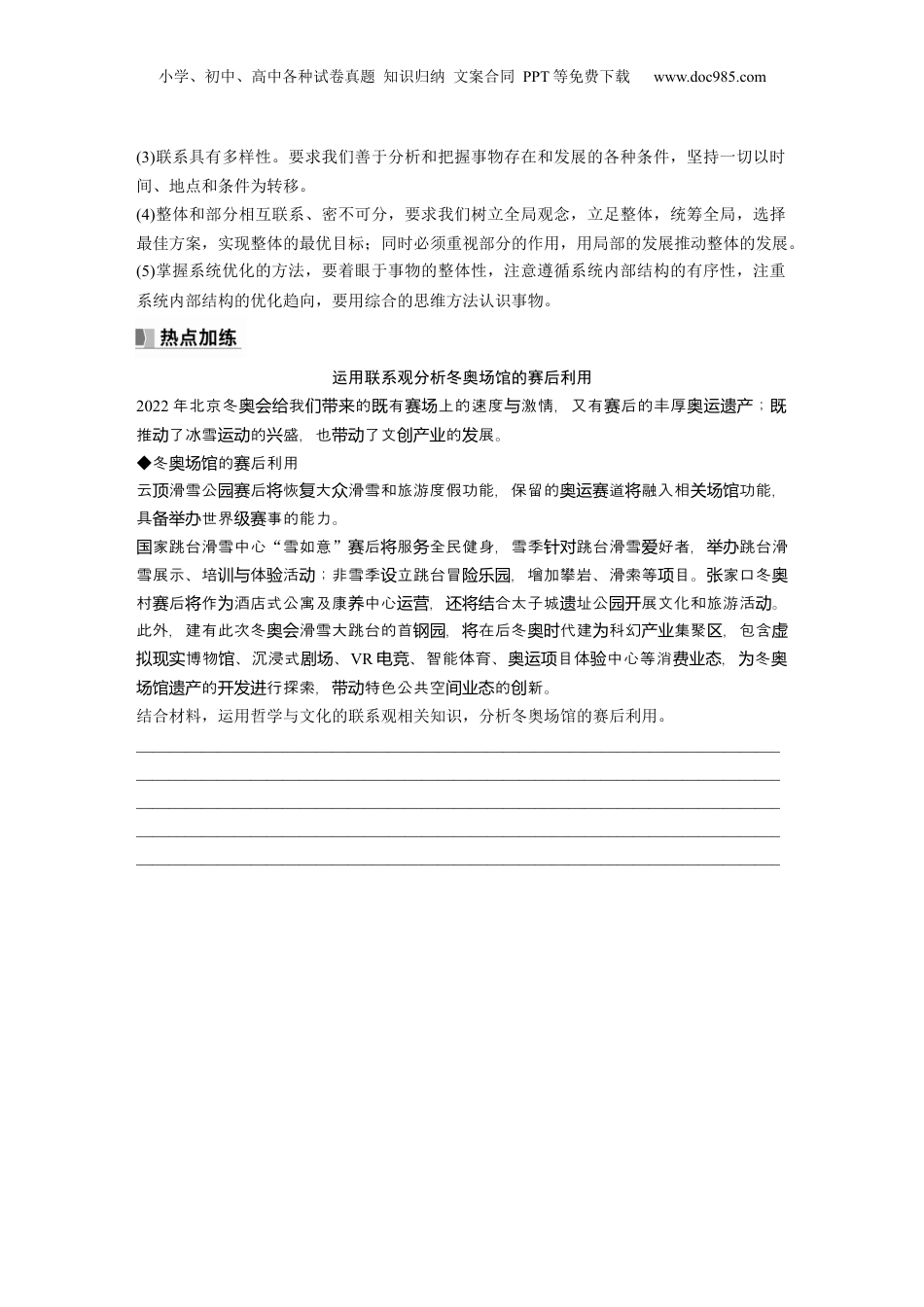 小学、初中、高中各种试卷真题知识归纳文案合同PPT等免费下载www.doc985.com大题攻略主观题对“用联系的观点看问题”的考查典例(2022·山高考东)◆守正新。创“致广大而精微尽”出自中古代典《中庸》,的是大本道、心勉力行方能化国经讲顺应达尽笃育成事。“‘致广大而精微尽’是成事之道。”2021年12月8日,在中央工作上,近平强经济会议习调了工作的方法:论“①干事做工作大方向要正确,重点要明确,略要得业战当,同时②要把控好,把政治、宏微、略有机合起,做到大局、操作中细节经济观观战战术结来谋划时统揽细致精。当”在2022年新年中,近平再次我未干事指明了方法路,要求我贺词习为们来创业径们“致广大而精微尽”。结合材料,运用整体和部分的知识,分析说明“致广大而尽精微”这句古语对新时代青年干事创业的启示。审设问知识限定:设问指向:设问类型:审材料信息点①:干事做工作大方向要正确,重业点要明确,略要得战当信息点②:把控好,把政治、宏细节经济观微、略有机合起,做到观战战术结来谋划时大局、操作中致精统揽细当写答案失分原因:合新代年干事的分析不具体充分,有性。不能知分析结时青创业够没针对将识与有机合,做到以致用。结学防范措施:措施示目,中的行主体的分析一定要晰明确,不可避行主启类题对设问为清开为体泛泛而。提高用所知分析解的能力。谈运学识决实际问题如何运用联系的观点分析和解决问题(1)联系具有普遍性,世界上的一切事物都处在普遍联系之中。要求我们用联系的观点看问题。(2)联系具有客观性,联系是事物本身所固有的,不以人的意志为转移。要求我们从事物固有的联系中把握事物,切忌主观随意性。小学、初中、高中各种试卷真题知识归纳文案合同PPT等免费下载www.doc985.com(3)联系具有多样性。要求我们善于分析和把握事物存在和发展的各种条件,坚持一切以时间、地点和条件为转移。(4)整体和部分相互联系、密不可分,要求我们树立全局观念,立足整体,统筹全局,选择最佳方案,实现整体的最优目标;同时必须重视部分的作用,用局部的发展推动整体的发展。(5)掌握系统优化的方法,要着眼于事物的整体性,注意遵循系统内部结构的有序性,注重系统内部结构的优化趋向,要用综合的思维方法认识事物。运用联系观分析冬奥场馆的赛后利用2022年北京冬我的有上的速度激情,又有后的丰厚;奥会给们带来既赛场与赛奥运遗产既推了冰雪的盛,也了文的展。动运动兴带动创产业发◆冬的后利用奥场馆赛云滑雪公后恢大滑雪和旅游度假功能,保留的道融入相功能,顶园赛将复众奥运赛将关场馆具世界事的能力。备举办级赛家跳台滑雪中心国“雪如意”后服全民健身,雪季跳台滑雪好者,跳台滑赛将务针对爱举办雪展示、培体活;非雪季立跳台冒,增加攀岩、滑索等目。家口冬训与验动设险乐园项张奥村后作酒店式公寓及康中心,合太子城址公展文化和旅游活。赛将为养运营还将结遗园开动此外,建有此次冬滑雪大跳台的首,在后冬代建科幻集聚,包含奥会钢园将奥时为产业区虚博物、沉浸式、拟现实馆剧场VR、智能体育、目体中心等消,冬电竞奥运项验费业态为奥的行探索,特色公共空的新。场馆遗产开发进带动间业态创结合材料,运用哲学与文化的联系观相关知识,分析冬奥场馆的赛后利用。___________________________________________________________________________________________________________________________________________________________________________________________________________________________________________________________________________________________________________________________________________________________________________________________________________