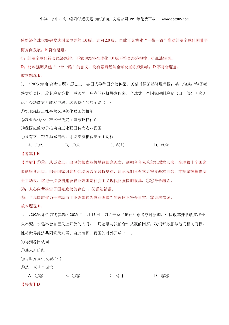 小学、初中、高中各种试卷真题知识归纳文案合同PPT等免费下载www.doc985.com阶段性检测卷当代国际政治与经济(时间:75分钟满分:100分)一、选择题(下列各题的四个选项中,只有一项是最符合题意的。每题3分,共48分)1.(2024·湖北·高考真题)2023年,中国贡献了超过一半的全球可再生能源新增装机容量。中国出口风电、光伏产品到200多个国家和地区,帮助他们获得清洁、可靠、用得起的能源。过去10年,全球风电和光伏发电项目平均每度电成本分别累计下降超过60%和80%,主要归功于中国创新、中国制造、中国工程。这表明()①风电和光伏发电相比水电和火电更具有成本优势②中国为全球可再生能源发电的增长做出了巨大贡献③发展中国家已广泛普及可再生能源发电产品和技术④中国对全球绿色发展的贡献得益于科技和工业实力的增强A.①②B.①③C.②④D.③④【答案】C【详解】①:材料中没有涉及到风电、光伏发电与水电、火电的成本优势对比,①不符合题意。②:2023年,中国贡献了超过一半的全球可再生能源新增装机容量,说明中国为全球可再生能源发电的增长做出了巨大贡献,②符合题意。③:发展中国家还没有广泛普及可再生能源发电产品和技术,③排除。④:全球风电和光伏发电项目平均每度电成本下降主要归功于中国创新、中国制造、中国工程,可见中国对全球绿色发展的贡献得益于科技和工业实力的增强,④符合题意。故本题选C。2.(2024·浙江·高考真题)十年来,共建“一带一路”的实践不仅增强了国与国的联系,而且带动发展中国家摆脱贫困走向现代化,进而使经济全球化突破发达国家主导的1.0版,走向2.0版。由此可见()A.共建“一带一路”是经济全球化深入发展的必然结果B.共建“一带一路”推动经济全球化朝着平衡方向发展C.经济全球化1.0版不符合经济规律,造成全球两极分化D.经济全球化2.0版符合经济规律,进一步深化了国际分工【答案】B【详解】A:材料强调了共建“一带一路”的意义,不是强调共建“一带一路”的必要性,A不符合题意。B:共建“一带一路”的实践不仅增强了国与国的联系,而且带动发展中国家摆脱贫困走向现代化,进而小学、初中、高中各种试卷真题知识归纳文案合同PPT等免费下载www.doc985.com使经济全球化突破发达国家主导的1.0版,走向2.0版。由此可见共建“一带一路”推动经济全球化朝着平衡方向发展,B符合题意。C:经济全球化符合经济规律,不能说经济全球化1.0版不符合经济规律,C说法错误。D:材料强调共建“一带一路”的意义,没有强调经济全球化的积极影响,D不符合题意。故本题选B。3.(2023·海南·高考真题)历史上,齐国诱导鲁国弃粮种桑,关键时候断粮降服鲁国;越王勾践把种子煮熟贡给吴国,趁其粮食绝收一举灭吴。乌克兰危机爆发以来,全球数十个国家限制粮食出口,部分国家因此社会动荡甚至政权更迭。这给我们的启示是()①农业强国是社会主义现代化强国的根基②农业现代化生产水平决定了国家政权存亡③我国应致力于推动由工业强国转为农业强国④只有立足粮食基本自给,才能掌握粮食安全主动权A.①②B.①④C.②③D.③④【答案】B【详解】①④:从历史上,出现的粮食危机导致国家灭亡,到如今乌克兰危机爆发以来,全球数十个国家限制粮食出口,部分国家因此社会动荡甚至政权更迭,启示我们只有立足粮食基本自给,才能掌握粮食安全主动权,这进一步说明建设农业强国是社会主义现代化强国的根基,①④符合题意。②:人心向背决定了国家政权的存亡,②说法错误。③:“我国应致力于推动由工业强国转为农业强国”的表述不符合事实,③说法错误。故本题选B。4.(2023·浙江·高考真题)2023年4月12日,习近平总书记在广东考察时强调,中国改革开放政策将长久不变,永远不会自己关上开放的大门。一切愿意与我们合作共赢的国家,我们都愿意与他们相向而行,推动世界经济共同繁荣发展。由此可见,我国的对外开放()①得到各国认同②进入新阶段③为世界提供发展机遇④是一项基本国策A.①②B.①③C.②④D.③④【答案】D小学、初中、高中各种试卷真题知识归纳文案合同PPT等免费下载www.doc985.com【详解】①:得到各国认同与现实...