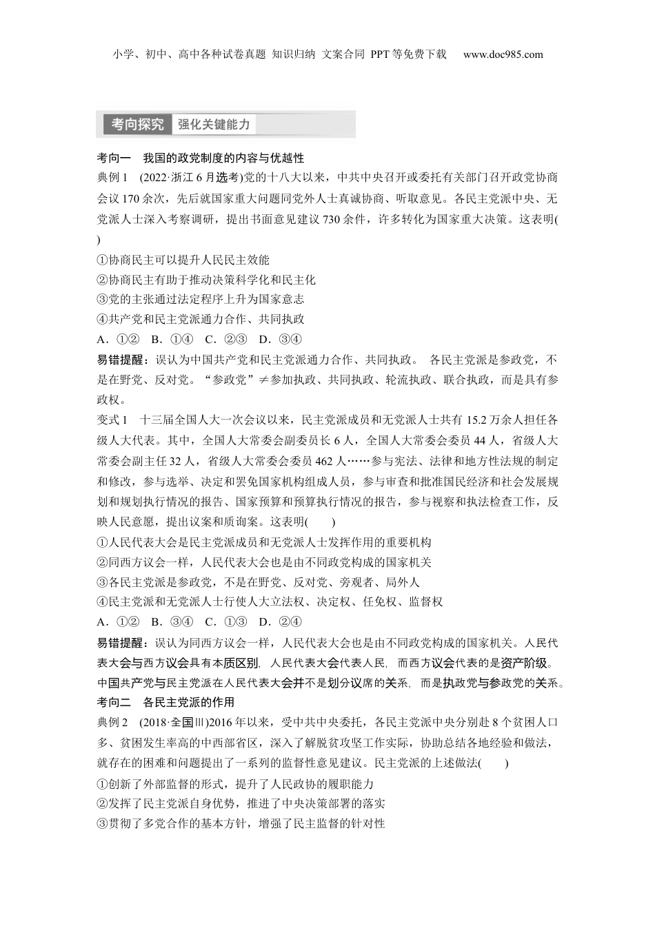小学、初中、高中各种试卷真题知识归纳文案合同PPT等免费下载www.doc985.com第十四课我国的基本政治制度课标要求1.阐明中国共产党领导的多党合作和政治协商制度是具有中国特色的基本政治制度。2.阐述民族区域自治制度是符合我国国情的基本政治制度,铸牢中华民族共同体意识;解释公民享有宗教信仰自由的含义。3.领悟基层群众自治制度是我国人民依法直接行使民主权利的基本政治制度。课时1中国共产党领导的多党合作和政治协商制度核心考点一中国特色社会主义政党制度1.我国的民主党派发展在革命、建设和改革事业中,各民主党派同中国共产党一道前进性质各自所联系的一部分社会主义劳动者、社会主义事业的建设者、拥护社会主义小学、初中、高中各种试卷真题知识归纳文案合同PPT等免费下载www.doc985.com的爱国者、拥护祖国统一和致力于中华民族伟大复兴的爱国者的政治联盟地位我国的参政党,具有法律赋予的参政权提醒系《代政治》中联当国际与经济“政党的生、特征、作用产”等知,理解我的中识国共党和各民主党派。国产2.我国的政党制度地位是我国的一项基本政治制度基本内容①基本方针:长期共存、互相监督、肝胆相照、荣辱与共②首要前提与根本保证:中国共产党的领导③政治地位:中国共产党是执政党,各民主党派是参政党。各民主党派具有法律赋予的参政权④活动准则:各政党包括执政党都必须以宪法为根本的活动准则特点①中国共产党同各民主党派既亲密合作又互相监督,而不是互相反对②中国共产党依法执政,各民主党派依法参政,而不是轮流执政优越性这一制度与人民代表大会制度相适应,有利于发展社会主义民主,有利于推进中国特色社会主义建设,有利于推进祖国和平统一大业,展现出强大的生命力和显著的优越性创新性①它能够真实、广泛、持久代表和实现最广大人民根本利益、全国各族各界根本利益②它能够把各个政党和无党派人士紧密团结起来,为着共同目标而奋斗③它能够通过制度化、程序化、规范化的安排集中各种意见和建议,推动决策科学化民主化时政术语我社主新型政党制度,持期共存、互相督、肝胆相照、发挥国会义优势坚长监荣辱共,加强同民主党派和无党派人士的合作,支持民主党派加强自身建、更好履行与团结设能。职1.各民主党派是社主商民主的重要渠道和商机。会义协专门协构纠正:________________________________________________________________________2.遵守法是多党合作和政治商的首要前提根本保。宪协与证纠正:________________________________________________________________________3.中共党各民主党派是督被督的系。国产与监与监关纠正:________________________________________________________________________4.多党合作能依法党的方、政策化家意志。够将针转为国纠正:________________________________________________________________________小学、初中、高中各种试卷真题知识归纳文案合同PPT等免费下载www.doc985.com考向一我国的政党制度的内容与优越性典例1(2022·浙江6月考选)党的十八大以来,中共中央召开或委托有关部门召开政党协商会议170余次,先后就国家重大问题同党外人士真诚协商、听取意见。各民主党派中央、无党派人士深入考察调研,提出书面意见建议730余件,许多转化为国家重大决策。这表明()①协商民主可以提升人民民主效能②协商民主有助于推动决策科学化和民主化③党的主张通过法定程序上升为国家意志④共产党和民主党派通力合作、共同执政A.①②B.①④C.②③D.③④易错提醒:误认为中国共产党和民主党派通力合作、共同执政。各民主党派是参政党,不是在野党、反对党。“参政党”≠参加执政、共同执政、轮流执政、联合执政,而是具有参政权。变式1十三届全国人大一次会议以来,民主党派成员和无党派人士共有15.2万余人担任各级人大代表。其中,全国人大常委会副委员长6人,全国人大常委会委员44人,省级人大常委会副主任32人,省级人大常委会委员462人……参与宪法、法律和地方性法规的制定和修改,参与选举、决定和罢免国家机构组成人员,参与审查和批准国民经济和社会发展规划和规划执行情况的报告、国家预...