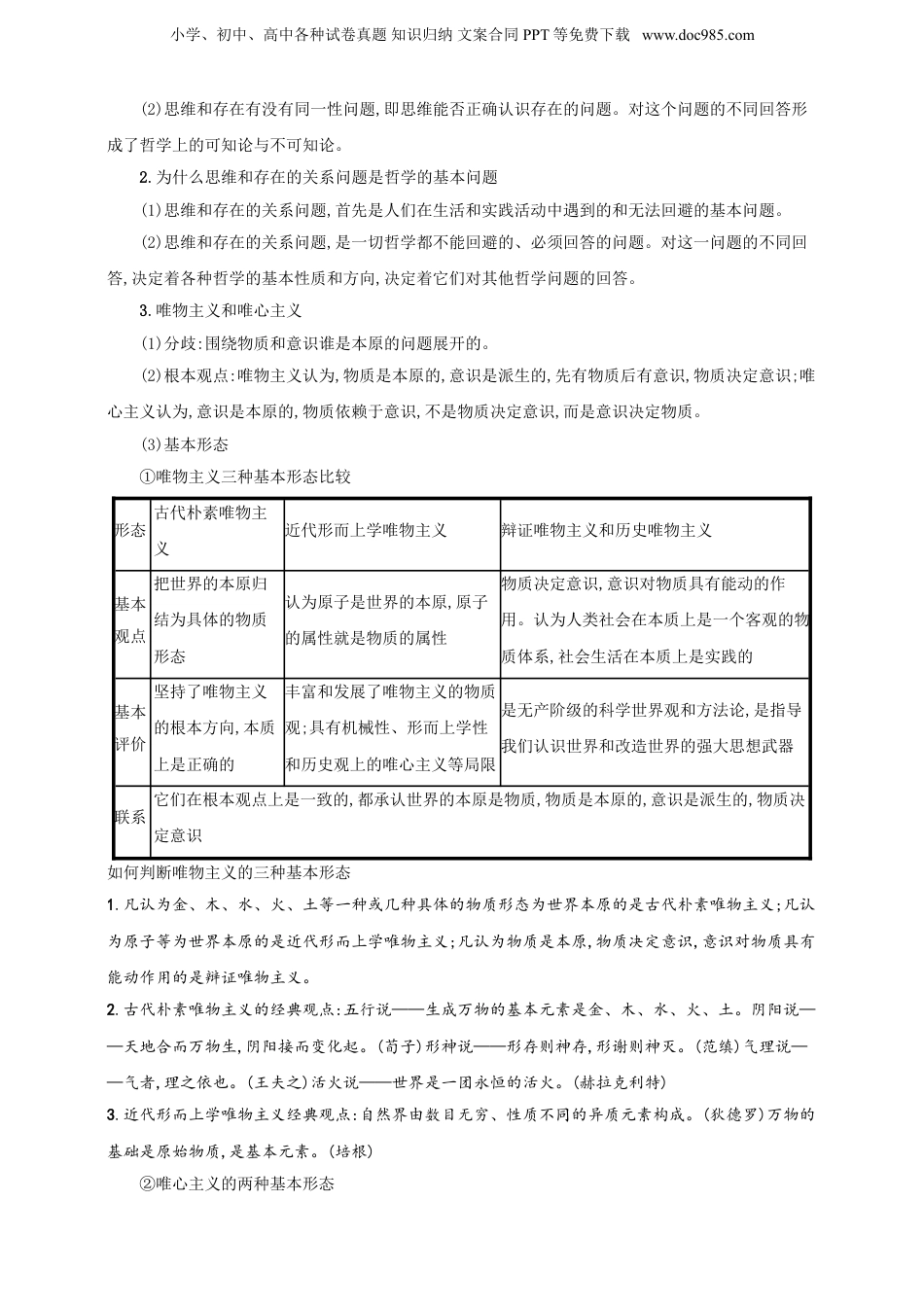 小学、初中、高中各种试卷真题知识归纳文案合同PPT等免费下载www.doc985.com2025年高考政治一轮复习精讲精练第一课时代精神的精华【课标要求】比较哲学思维与日常思维的异同;理解哲学是时代精神的精华,阐明马克思主义哲学是科学的世界观和方法论。【核心素养】政治认同:认同唯物主义的观点,自觉反对和批判唯心主义,认同马克思主义的指导地位。科学精神:掌握哲学的基本问题,结合学生自身学习实际,能够说明生活中必须面对思维和存在的关系问题,学会运用马克思主义中国化的重大理论成果,指导建设中国特色社会主义的伟大实践。公共参与:坚持以哲学为指导,开启人的智慧,坚持实践的观点,与时俱进,提高自觉运用哲学理论分析和解决社会问题的能力。【命题预测】1.高频考点:哲学与具体科学的关系、哲学的基本问题、哲学的两大派别、唯物主义和唯心主义的主要观点、马克思主义哲学的特征等2.题型预判:本课在考试中主要以选择题的考查为主,复习过程中注意关注热点,比如:建党100周年、中共20大的召开、马克思主义中国化的最新理论成果等。【思维导图】【考点梳理】必备知识一:追求智慧的学问1.哲学的起源小学、初中、高中各种试卷真题知识归纳文案合同PPT等免费下载www.doc985.com(1)从哲学的本义看:哲学是一门热爱智慧、追求智慧的学问,哲学是“现世的智慧”,是“文化的活的灵魂”。(2)哲学源于生活——哲学就在我们身边①哲学的智慧产生于人类的实践活动。哲学是人们在认识世界和改造世界的活动中,在处理人与外部世界关系的实践中形成和发展起来的。②哲学起源于人们在生活实践中对宇宙、人生的追问和思考。因此,哲学与我们的生活、与我们置身于其中的自然和社会密切相关,它总是直接或间接地影响我们的学习、工作和生活。2.哲学是系统化理论化的世界观(1)世界观与哲学的关系关系世界观哲学区别含义人们对整个世界的总的看法和根本观点关于世界观的学问形成自发形成的,人人都有哲学家研究的结果,是自觉形成的,不是人人都有特点是零散的、朴素的是系统化、理论化的联系哲学与世界观的研究对象都是整个世界(自然界、人类社会、人的思维);哲学以世界观为内容,世界观以哲学为最高表现;哲学是世界观和方法论的统一(2)世界观与方法论关系世界观方法论区别是指人们对整个世界的总的看法和根本观点是指人们认识世界、改造世界的根本原则和根本方法联系世界观决定方法论,方法论体现世界观,有什么样的世界观就有什么样的方法论。两者统一于哲学3.哲学是对自然、社会和思维知识的概括和总结(1)区别:①具体科学揭示的是自然、社会和思维某一具体领域的规律和奥秘。大致可概括为三类:自然科学知识、社会科学知识和思维科学知识。②哲学则是对自然、社会和思维知识的概括和总结。对具体科学进行概括和升华,从中抽象出最一般的本质和最普遍的规律。(2)联系:①具体科学是哲学的基础,具体科学的进步推动着哲学的发展。②哲学对具体科学有反作用,为具体科学研究提供世界观和方法论的指导。必备知识二哲学的基本问题1.什么是哲学的基本问题哲学的基本问题是思维和存在的关系问题,也就是意识和物质的关系问题,它包括两方面的内容:(1)思维和存在何者是本原的问题。对这个问题的不同回答,是划分唯物主义和唯心主义的唯一标准。小学、初中、高中各种试卷真题知识归纳文案合同PPT等免费下载www.doc985.com(2)思维和存在有没有同一性问题,即思维能否正确认识存在的问题。对这个问题的不同回答形成了哲学上的可知论与不可知论。2.为什么思维和存在的关系问题是哲学的基本问题(1)思维和存在的关系问题,首先是人们在生活和实践活动中遇到的和无法回避的基本问题。(2)思维和存在的关系问题,是一切哲学都不能回避的、必须回答的问题。对这一问题的不同回答,决定着各种哲学的基本性质和方向,决定着它们对其他哲学问题的回答。3.唯物主义和唯心主义(1)分歧:围绕物质和意识谁是本原的问题展开的。(2)根本观点:唯物主义认为,物质是本原的,意识是派生的,先有物质后有意识,物质决定意识;唯心主义认为,意识是本原的,物质依赖于意识,不是物质决定意识,而是意识决定物质。(3)基本形态①唯物主义三种基本形态比较形...