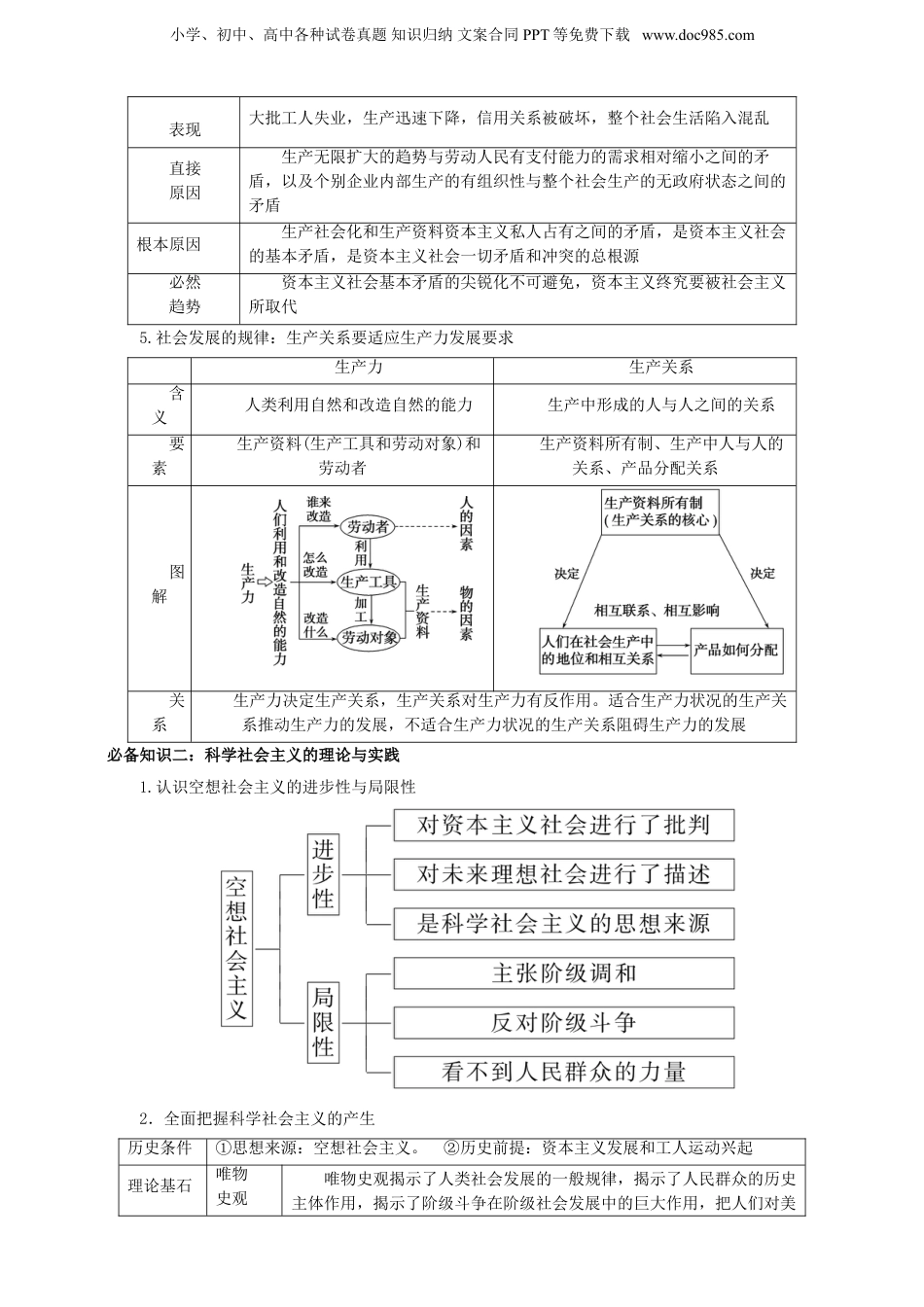 小学、初中、高中各种试卷真题知识归纳文案合同PPT等免费下载www.doc985.com2025年高考政治一轮复习精讲精练第一课社会主义从空想到科学、从理论到实践的发展【课标要求】1.描述不同社会形态的本质特征;解释人类社会发展的一般过程,阐明社会发展的历史进程,取决于社会基本矛盾的运动;分析资本主义社会的历史地位2.概述社会主义从空想到科学、从理论到现实的历史轨迹,阐明人类社会发展的趋势。【核心素养】政治认同:通过运用人类社会发展的一般规律认识社会发展历程,坚信社会主义必然取代资本主义,增强对我国社会主义制度的认同,坚定中国特色社会主义道路自信。科学精神:正确认识不同社会形态的特点和发展历程,准确把握人类社会发展规律;辩证分析和评价空想社会主义;从理论和实践上理解科学社会主义的科学性。公共参与:搜集社会发展最新资料,开展对社会发展规律、社会主义由空想到科学飞跃等的专题探究。【命题预测】本模块主要命制选择题,考查范围集中在生产力与生产关系、资本主义基本矛盾及经济危机、科学社会主义等方面,选择题难度较低,主要考查基础知识的背诵和运用能力。从考点角度看,不同社会形态生产关系的特点,科学社会主义理论,新民主主义革命,社会主义制度确立,是高考考查频率较高的知识点。从题型角度看,以选择题为主。【思维导图】【考点梳理】小学、初中、高中各种试卷真题知识归纳文案合同PPT等免费下载www.doc985.com必备知识一:原始社会的解体和阶级社会的演进1.人类社会的最初阶段:原始社会生产力旧石器时代,人们主要以采集天然食物为生。新石器时代,原始畜牧业和农业开始出现,人们从食物的采集者变为生产者生产关系劳动者共同劳动,共同占有生产资料,在生产中结成平等互助的关系,平均分配劳动产品生活单位按照血缘关系结成的氏族是原始人共同生活的基本单位。到了原始社会末期,一些近亲的氏族构成部落,有的部落联合起来组成部落联盟解体随着生产力的发展,个体劳动逐渐盛行起来。生产资料相应地由氏族公有转归家庭私有。土地变成私有财产,标志着私有制的确立2.文明的门槛:奴隶社会确立原因私有制的确立、阶级的出现生产关系奴隶主占有生产资料并完全占有奴隶;奴隶毫无人身自由,在奴隶主的强制下劳动;奴隶劳动的全部产品都归奴隶主占有和支配国家产生奴隶主为了维护本阶级的利益,建立了军队、法庭、监狱等暴力机关,人类历史上最早的国家——奴隶制国家产生了。国家是阶级矛盾不可调和的产物,是阶级统治的工具历史进步金属工具的广泛使用、城市的出现、文字的发明和应用、脑力劳动和体力劳动的分工等,促进了生产力的发展,使人类摆脱蒙昧野蛮的状态,迈入了文明时代的门槛3.阶级社会的发展:封建社会生产力铁制农具得到广泛使用和推广,耕作技术有了显著进步;水利事业有了较大发展;手工业有了进一步发展;商业和城市逐渐发展起来生产关系地主占有绝大部分土地,通过收取地租等方式,占有农民大部分劳动成果。相对于奴隶,农民有一定的人身自由经济剥削封建土地所有制是地主阶级剥削农民的基础。主要方式:收取地租政治压迫封建国家的显著特征是君主专制、等级森严思想钳制地主阶级散布封建迷信、传播封建道德、鼓吹“君权神授”,钳制劳动人民的思想主要矛盾农民阶级和地主阶级之间的矛盾是封建社会的主要矛盾4.最后的阶级社会:资本主义社会(1)资本主义的生产关系①特点:资本家占有一切生产资料;失去生产资料的劳动者不得不出卖自己的劳动力,受雇于资本家,成为雇佣工人;资本家在生产过程中占有工人创造的剩余价值。②确立及积极意义:资产阶级革命的胜利,标志着资本主义社会的开始。资本主义制度的确立,工业革命的发生和完成,带来了资本主义社会生产力的巨大飞跃,促进了人类思想的解放,使科学、教育、文化的发展达到了前所未有的高度。(2)资本主义经济危机本质特征生产过剩,这种生产过剩是相对过剩,而不是绝对过剩主要大量商品卖不出去,大量生产资料被闲置,大批生产企业、银行破产,小学、初中、高中各种试卷真题知识归纳文案合同PPT等免费下载www.doc985.com表现大批工人失业,生产迅速下降,信用关...
