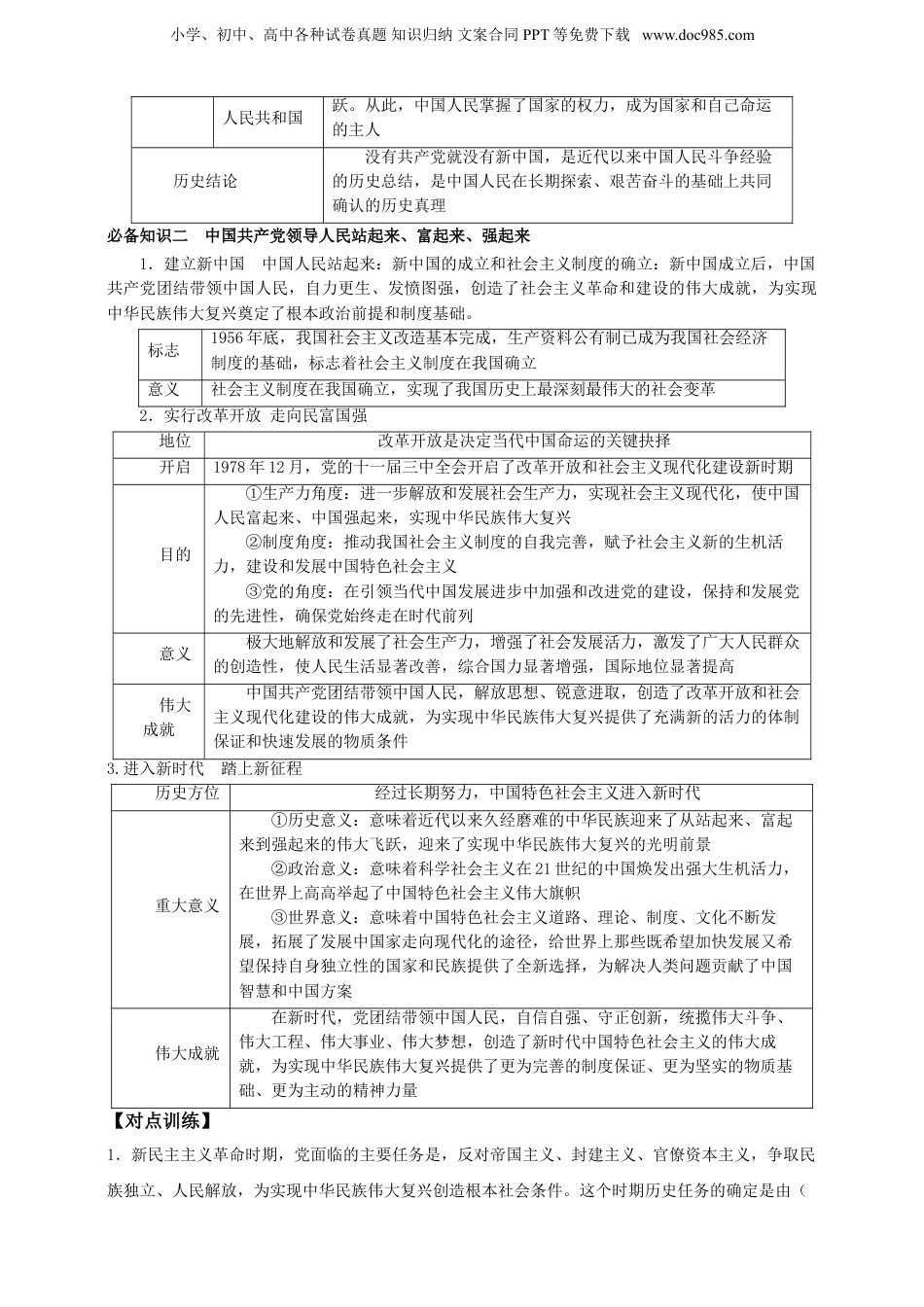 小学、初中、高中各种试卷真题知识归纳文案合同PPT等免费下载www.doc985.com2025年高考政治一轮复习精讲精练第一课历史和人民的选择【课标要求】引述宪法序言,说明没有中国共产党就没有新中国,阐明中国共产党成为执政党的必然性。【核心素养】政治认同:没有共产党就没有新中国,坚持中国共产党的领导。坚持党的领导,坚持改革开放,实现中华民族伟大复兴。科学精神:明确近代中国的基本国情、主要矛盾、历史任务。理解中华人民共和国成立的意义、建立社会主义制度的意义、改革开放的意义、中国特色社会主义进入新时代的意义。【命题预测】结合近代中国的国情和各种政治力量在建国方面的较量,考查中国共产党执政是历史的必然和人民的选择;结合中国共产党领导中国人民进行革命斗争的实例,考查没有共产党就没有新中国。通过改革开放以来,特别是党的十八大以来我国取得的巨大成就,考查改革开放的实质和意义;通过国家重要领导人讲话及最新推出的相关政策,考查中国特色社会主义进入新时代的背景及意义。该专题属于中国共产党的领导的内容,考查学生的政治认同、科学精神。(1)从命题内容上看,中国共产党执政地位的确立为考查的重点(2)从考查形式上看,选择题和非选择题都有考查,意义类、措施类和开放性试题是考查的重点,【思维导图】【考点梳理】小学、初中、高中各种试卷真题知识归纳文案合同PPT等免费下载www.doc985.com必备知识一中华人民共和国成立前的各种政治力量1.近代中国的基本国情、主要矛盾和历史任务基本国情内容半殖民地半封建社会是近代中国的基本国情原因①内因:清王朝对内实行封建专制统治,对外采取闭关锁国政策,政治腐败、军备废弛②外因:西方一些国家爆发资产阶级革命,建立资本主义制度,相继完成工业革命,实现机器大生产;列强发动一系列侵华战争,签订了一系列不平等条约,一步步控制了中国的政治、经济、外交和军事地位是认识和解决近代中国一切社会问题的基本依据主要矛盾①帝国主义和中华民族的矛盾——民族矛盾②封建主义和人民大众的矛盾——阶级矛盾历史任务①争取民族独立、人民解放——前提和基础②实现国家富强、人民幸福——目的和动力2.各种政治力量解决中国问题的方案(1)中国共产党的诞生原因现实背景为了拯救民族危亡,中国人民奋起反抗,各种救国方案轮番出台,但都以失败而告终。中国迫切需要新的思想引领救亡运动,迫切需要新的组织凝聚革命力量思想基础1917年俄国十月革命一声炮响,给中国送来了马克思列宁主义阶级基础1919年五四运动后,工人阶级成为反帝反封建的新民主主义革命的领导力量意义初心使命中国共产党一经诞生,就把为中国人民谋幸福、为中华民族谋复兴确立为自己的初心使命主心骨中国人民在斗争中有了主心骨,看到了解决中国问题的出路和希望(2)20世纪上半叶中国出现的三种建国方案第一种方案第二种方案第三种方案方案内容先后以北洋军阀和国民党统治集团为代表,极力维护地主阶级和买办资产阶级统治,让中国继续走半殖民地半封建的道路以某些中间派或中间人士为代表,幻想建立资产阶级共和国,走独立发展资本主义的道路以中国共产党为代表,主张建立工人阶级领导的、以工农联盟为基础的人民共和国,经过新民主主义走向社会主义实践结果被抛弃了无法实现赢得拥护历史结论中国共产党的方案在历史和人民的检验中脱颖而出,最终成为唯一正确的选择。中国共产党执政,既是历史的必然,也是人民的选择3.没有共产党就没有新中国伟大成就取得了新民主主义革命的胜利推翻了帝国主义、封建主义、官僚资本主义三座大山,彻底结束了旧中国半殖民地半封建社会的历史,彻底结束了极少数剥削者统治广大劳动人民的历史,彻底结束了旧中国一盘散沙的局面,彻底废除了列强强加给中国的不平等条约和帝国主义在中国的一切特权,为实现中华民族伟大复兴创造了根本社会条件建立了中华实现了中国从几千年封建专制政治向人民民主的伟大飞小学、初中、高中各种试卷真题知识归纳文案合同PPT等免费下载www.doc985.com人民共和国跃。从此,中国人民掌握了国家的权力,成为国家和自己命运的主人历史结论没有共产党就没有新中国,是近代以来中国人...