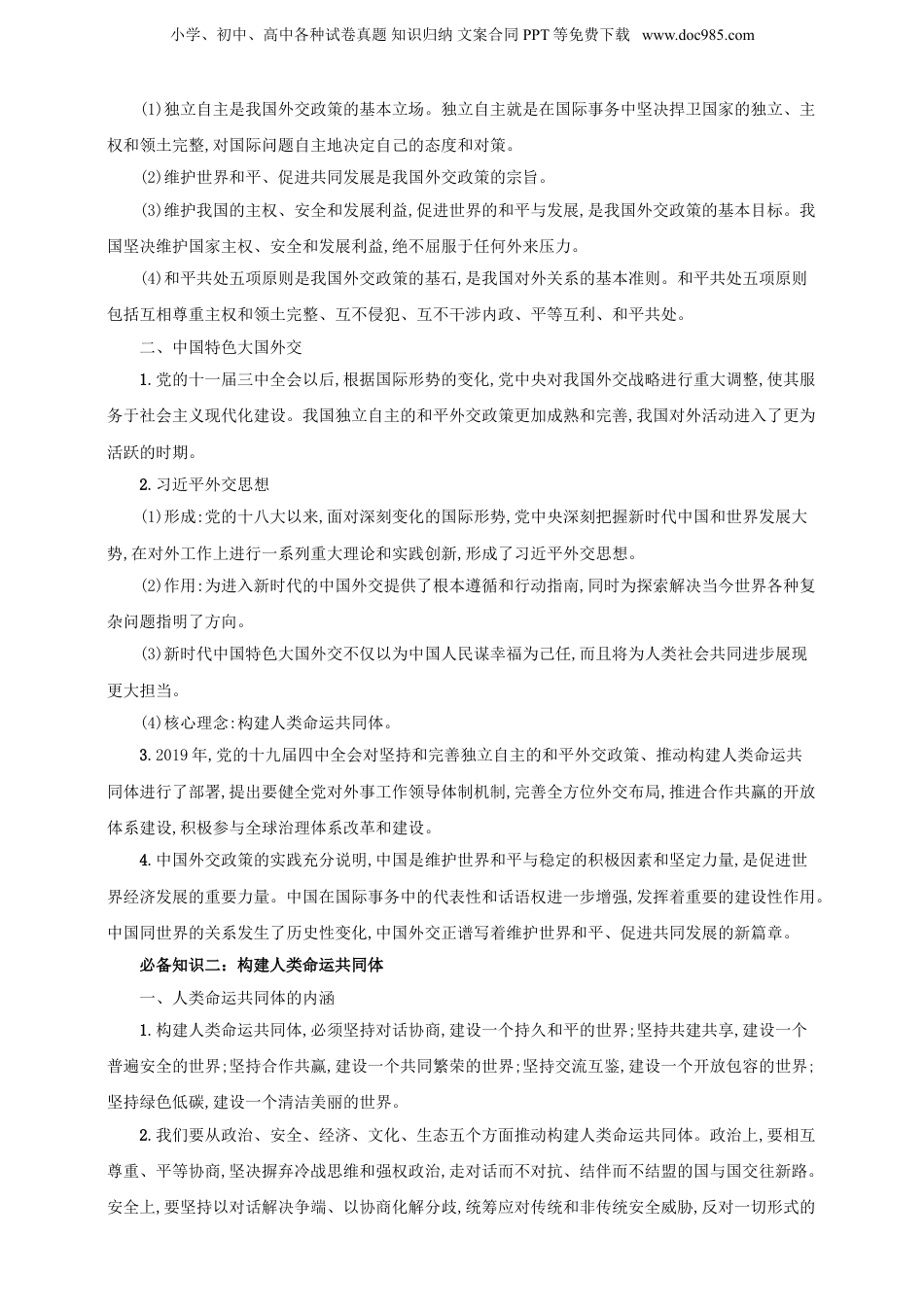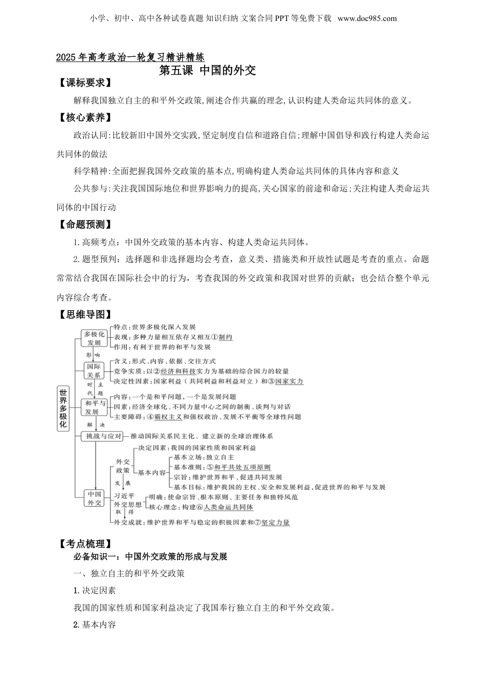 小学、初中、高中各种试卷真题知识归纳文案合同PPT等免费下载www.doc985.com2025年高考政治一轮复习精讲精练第五课中国的外交【课标要求】解释我国独立自主的和平外交政策,阐述合作共赢的理念,认识构建人类命运共同体的意义。【核心素养】政治认同:比较新旧中国外交实践,坚定制度自信和道路自信;理解中国倡导和践行构建人类命运共同体的做法科学精神:全面把握我国外交政策的基本点,明确构建人类命运共同体的具体内容和意义公共参与:关注我国国际地位和世界影响力的提高,关心国家的前途和命运;关注构建人类命运共同体的中国行动【命题预测】1.高频考点:中国外交政策的基本内容、构建人类命运共同体。2.题型预判:选择题和非选择题均会考查,意义类、措施类和开放性试题是考查的重点。命题常常结合我国在国际社会中的行为,考查我国的外交政策和我国对世界的贡献;也会结合整个单元内容综合考查。【思维导图】【考点梳理】必备知识一:中国外交政策的形成与发展一、独立自主的和平外交政策1.决定因素我国的国家性质和国家利益决定了我国奉行独立自主的和平外交政策。2.基本内容小学、初中、高中各种试卷真题知识归纳文案合同PPT等免费下载www.doc985.com(1)独立自主是我国外交政策的基本立场。独立自主就是在国际事务中坚决捍卫国家的独立、主权和领土完整,对国际问题自主地决定自己的态度和对策。(2)维护世界和平、促进共同发展是我国外交政策的宗旨。(3)维护我国的主权、安全和发展利益,促进世界的和平与发展,是我国外交政策的基本目标。我国坚决维护国家主权、安全和发展利益,绝不屈服于任何外来压力。(4)和平共处五项原则是我国外交政策的基石,是我国对外关系的基本准则。和平共处五项原则包括互相尊重主权和领土完整、互不侵犯、互不干涉内政、平等互利、和平共处。二、中国特色大国外交1.党的十一届三中全会以后,根据国际形势的变化,党中央对我国外交战略进行重大调整,使其服务于社会主义现代化建设。我国独立自主的和平外交政策更加成熟和完善,我国对外活动进入了更为活跃的时期。2.习近平外交思想(1)形成:党的十八大以来,面对深刻变化的国际形势,党中央深刻把握新时代中国和世界发展大势,在对外工作上进行一系列重大理论和实践创新,形成了习近平外交思想。(2)作用:为进入新时代的中国外交提供了根本遵循和行动指南,同时为探索解决当今世界各种复杂问题指明了方向。(3)新时代中国特色大国外交不仅以为中国人民谋幸福为己任,而且将为人类社会共同进步展现更大担当。(4)核心理念:构建人类命运共同体。3.2019年,党的十九届四中全会对坚持和完善独立自主的和平外交政策、推动构建人类命运共同体进行了部署,提出要健全党对外事工作领导体制机制,完善全方位外交布局,推进合作共赢的开放体系建设,积极参与全球治理体系改革和建设。4.中国外交政策的实践充分说明,中国是维护世界和平与稳定的积极因素和坚定力量,是促进世界经济发展的重要力量。中国在国际事务中的代表性和话语权进一步增强,发挥着重要的建设性作用。中国同世界的关系发生了历史性变化,中国外交正谱写着维护世界和平、促进共同发展的新篇章。必备知识二:构建人类命运共同体一、人类命运共同体的内涵1.构建人类命运共同体,必须坚持对话协商,建设一个持久和平的世界;坚持共建共享,建设一个普遍安全的世界;坚持合作共赢,建设一个共同繁荣的世界;坚持交流互鉴,建设一个开放包容的世界;坚持绿色低碳,建设一个清洁美丽的世界。2.我们要从政治、安全、经济、文化、生态五个方面推动构建人类命运共同体。政治上,要相互尊重、平等协商,坚决摒弃冷战思维和强权政治,走对话而不对抗、结伴而不结盟的国与国交往新路。安全上,要坚持以对话解决争端、以协商化解分歧,统筹应对传统和非传统安全威胁,反对一切形式的小学、初中、高中各种试卷真题知识归纳文案合同PPT等免费下载www.doc985.com恐怖主义。经济上,要同舟共济,促进贸易和投资自由化便利化,推动经济全球化朝着更加开放、包容、普惠、平衡、共赢的方向发展。文化上,要尊重世界文明多样性,以文明交流超越文明隔阂、文明互鉴超越文明冲突、文明共存超越文明优越。生态上,要坚持...
