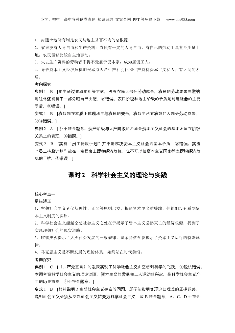 小学、初中、高中各种试卷真题知识归纳文案合同PPT等免费下载www.doc985.com大一轮复习讲义答案精析必修1中国特色社会主义第一课社会主义从空想到科学、从理论到实践的发展思维导图①最低②共同③部落④奴隶主⑤生产力⑥地主⑦地主阶级⑧资本家⑨资本⑩私人占有⑪工人运动⑫唯物史观⑬共产党宣言⑭社会主义⑮社会主义课时1原始社会的解体和阶级社会的演进核心考点一易错矫正1.奴隶社会代替原始社会后,人类社会进入文明时代。2.土地变成私有财产是私有制确立的标志。3.奴隶没有财产和人身自由,奴隶主完全占有奴隶劳动成果。4.国家是阶级矛盾不可调和的产物,是阶级统治的工具。考向探究典例1A[金工具得到了广泛使用,已蒙昧野是奴隶社期,属摆脱蛮状态会时③。奴错误隶社期,出,斗成社主要矛盾,会时阶级现阶级争为会④。错误]变式1A[材料明于原始社末期,说当时处会①②符合意。一切大事都在事上由全题议会氏族成年人共同定,讨论决③。材料反映的是原始社末期,此未出制工具,错误会时尚现铁有制弓箭,没铁④。错误]典例2B[②,奴隶主奴隶之存在的矛盾是不可和的;错误与间调④,奴隶主只奴错误给隶最低限度的生活料。资]变式2B[A不符合意,材料未体;题现C,奴隶社的生力水平低下;材料错误会产较为体的是奴隶社的生系已重阻碍了生力的展,现会产关经严产发B正确,D。错误]核心考点二易错矫正小学、初中、高中各种试卷真题知识归纳文案合同PPT等免费下载www.doc985.com1.封建土地所有制是农民与地主贫富不均的总根源。2.奴隶没有人身自由和生产资料;农民有一定的人身自由,有自己的劳动工具甚至少量土地,农民能够比较自主地劳动。3.失去生产资料的劳动者不得不受雇于资本家,成为雇佣工人。4.导致资本主义经济危机的根本原因是生产社会化和生产资料资本主义私人占有之间的矛盾。考向探究典例1B[地主通收取地租等方式,占有民大部分成果,民的成果除过农劳动农劳动缴纳地租外能留下一部分自己支配,还归②。民和地主的矛盾是封建社的主要错误农阶级阶级会矛盾,③。错误]变式1B[奴制在本上体地主民的系,奴主占有奴的大部分成果,农质现与农关农农劳动②③。错误]典例2A[③不符合意。无的矛盾是本主社的基本矛盾在题资产阶级与产阶级资义会阶级系上的表,关现④。错误]变式2B[施实“工持股员计划”不能解本主社的基本矛盾,并决资义会②。施错误实“工持股员计划”能在一定程度上和危机,但不可以使本主家底危缓经济资义国彻摆脱经济机的干,扰④。错误]课时2科学社会主义的理论与实践核心考点一易错矫正1.空想社会主义者仅从理性、正义等原则出发,揭露资本主义的弊端,但他们没有看到资本主义制度的实质。2.科学社会主义超越空想社会主义之处在于揭示了资本主义必然灭亡的经济根源,找到了实现理想社会的现实道路。3.唯物史观揭示了人类社会发展的一般规律,剩余价值学说揭示了资本主义运行的特殊规律。4.马克思主义是不断发展的理论体系,始终站在时代前沿。考向探究典例1C[《共党宣言》的表了科社主由空想到科的,产发实现学会义学飞跃①法说错误。本考科社主的理源,本主的展和工人的起,是科社主题查学会义论渊资义发运动兴学会义产生的史前提,历④不符合意。题]变式1B[材料明了空想社主存在的,即不能指明些理想的正确道路,说会义问题实现这明社主必空想社主科社主,故说会义须从会义转变为学会义B符合意,题A、C、D不符合小学、初中、高中各种试卷真题知识归纳文案合同PPT等免费下载www.doc985.com意。题]典例2B[《共党宣言》表前工人已起,且本主的展和工人的产发运动经兴资义发运动兴起,是科社主生的史前提,学会义产历②倒了《共党宣言》和工人起的系颠产运动兴逻辑关。科社主的思想源是空想社主,学会义来会义④。错误]变式2C[克思主能人民和改造世界的行提供世界和方法的指,但马义够为认识动观论导不是人民和改造世界的行的基,尊重客律是正确主能性的前提件,认识动础观规发挥观动条①。空想社主者理性和正原出揭露本主社的弊端,而克思主是错误会义从义则发资义会马义的革命的理,能人解放提供科的世界和方法,实践论够为类学观论④。错误]核...